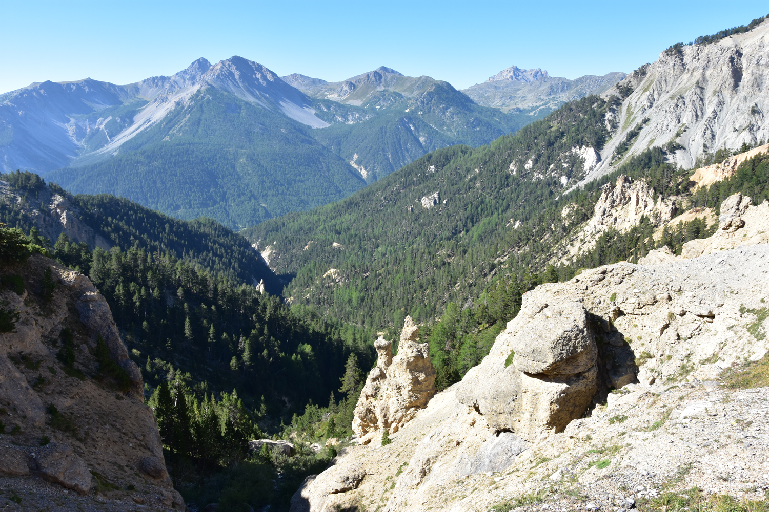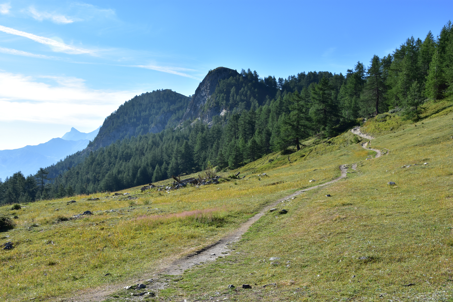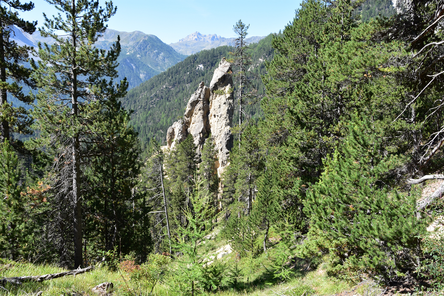 Der Abstieg, weiterhin auf gutem Weg, führt vorbei an einer Almhütte. Über einen stark erodierten Hang geht es anschließend ziemlich steil hinab zu einigen bizarren Felsnadeln. Bald darauf komme ich in Roubion an, das zur Gemeinde Névache gehört.