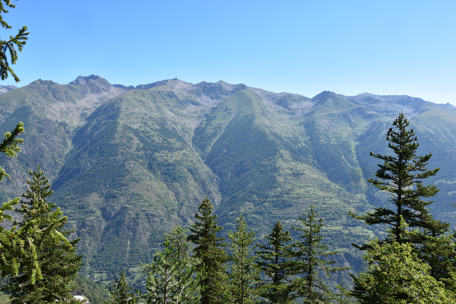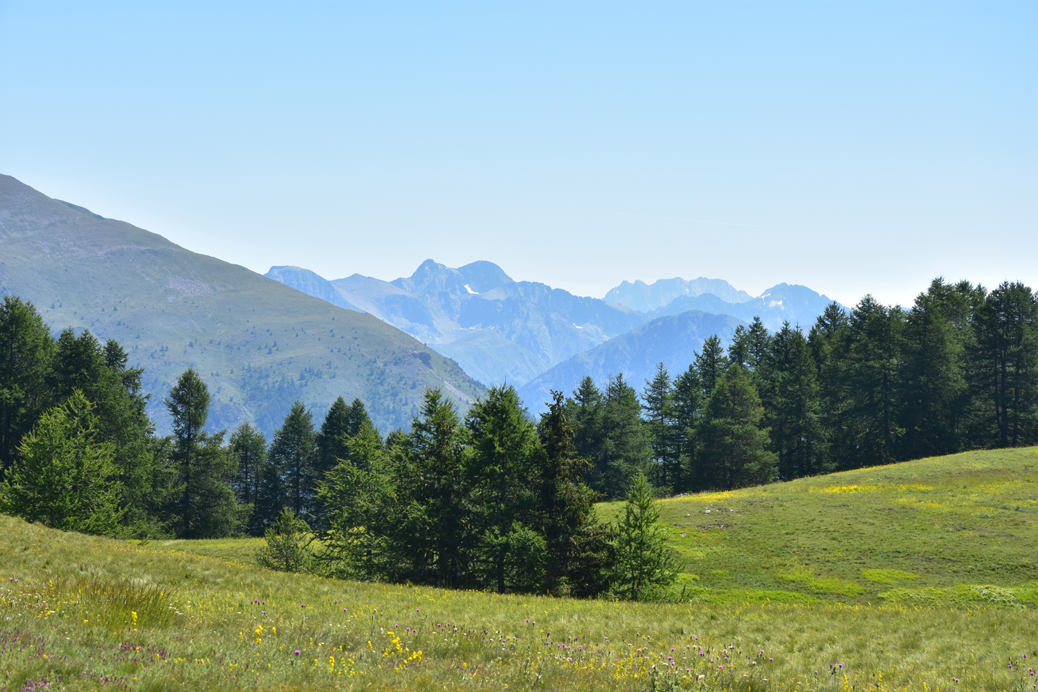 Nach Verlassen des Ortskerns kommen wir an einer Liftstation vorbei, bevor der zweite Waldspaziergang des Tages beginnt. Nur an wenigen Stellen geben die Bäume den Blick auf die östliche Talseite frei. Schließlich erreichen wir den Col du Blainon, einen grasigen Sattel, der wie geschaffen für die Mittagspause ist. In der Ferne sind die Berge zu sehen, durch die der GR 52 verläuft. In drei Tagen werden wir dieses Gebiet unsicher machen.