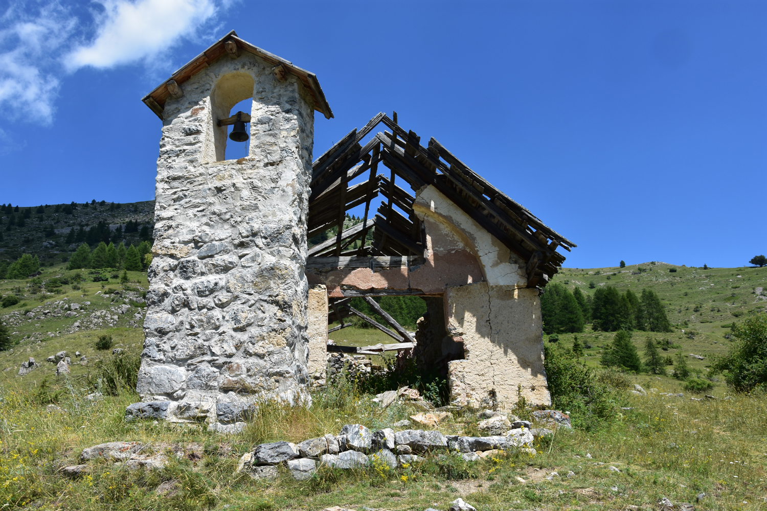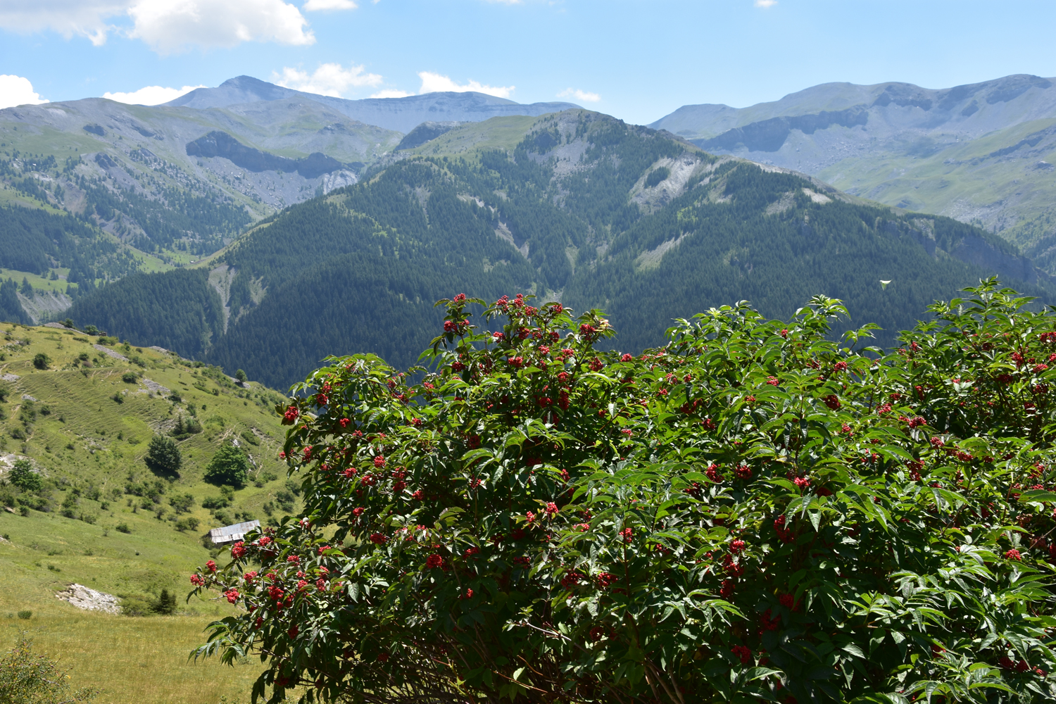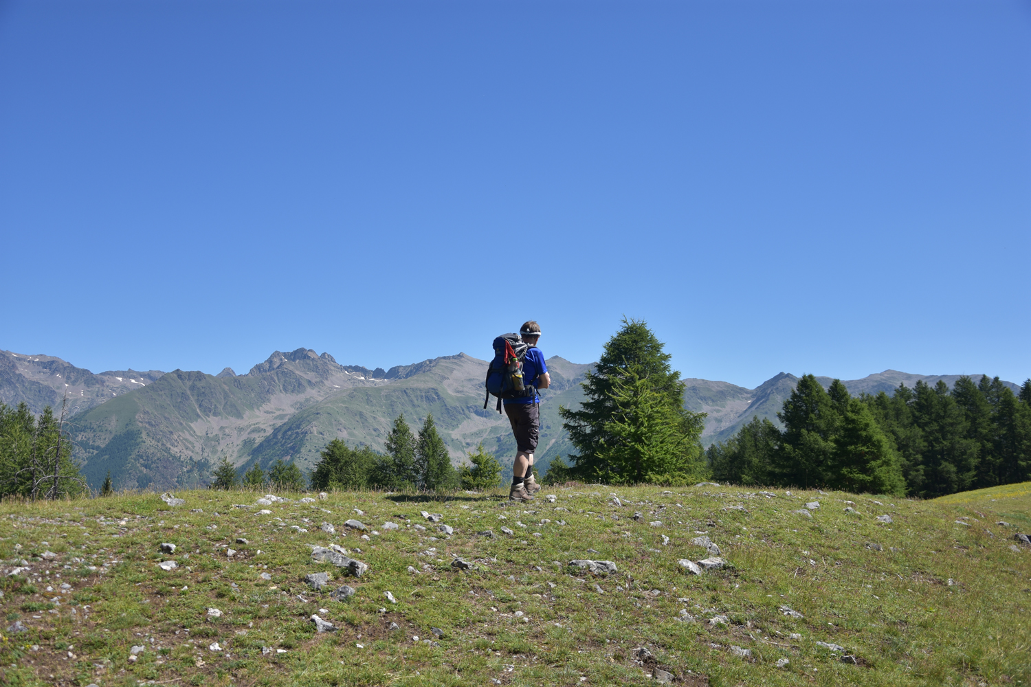 Der Abstieg vom Sattel geht im Wesentlichen durch freies Gelände. Der Blick nach Süden wird beherrscht vom Mont Mounier, der morgen auf dem Programm steht. Endpunkt der heutigen Etappe ist die Häusergruppe Roya im gleichnamigen Tal.