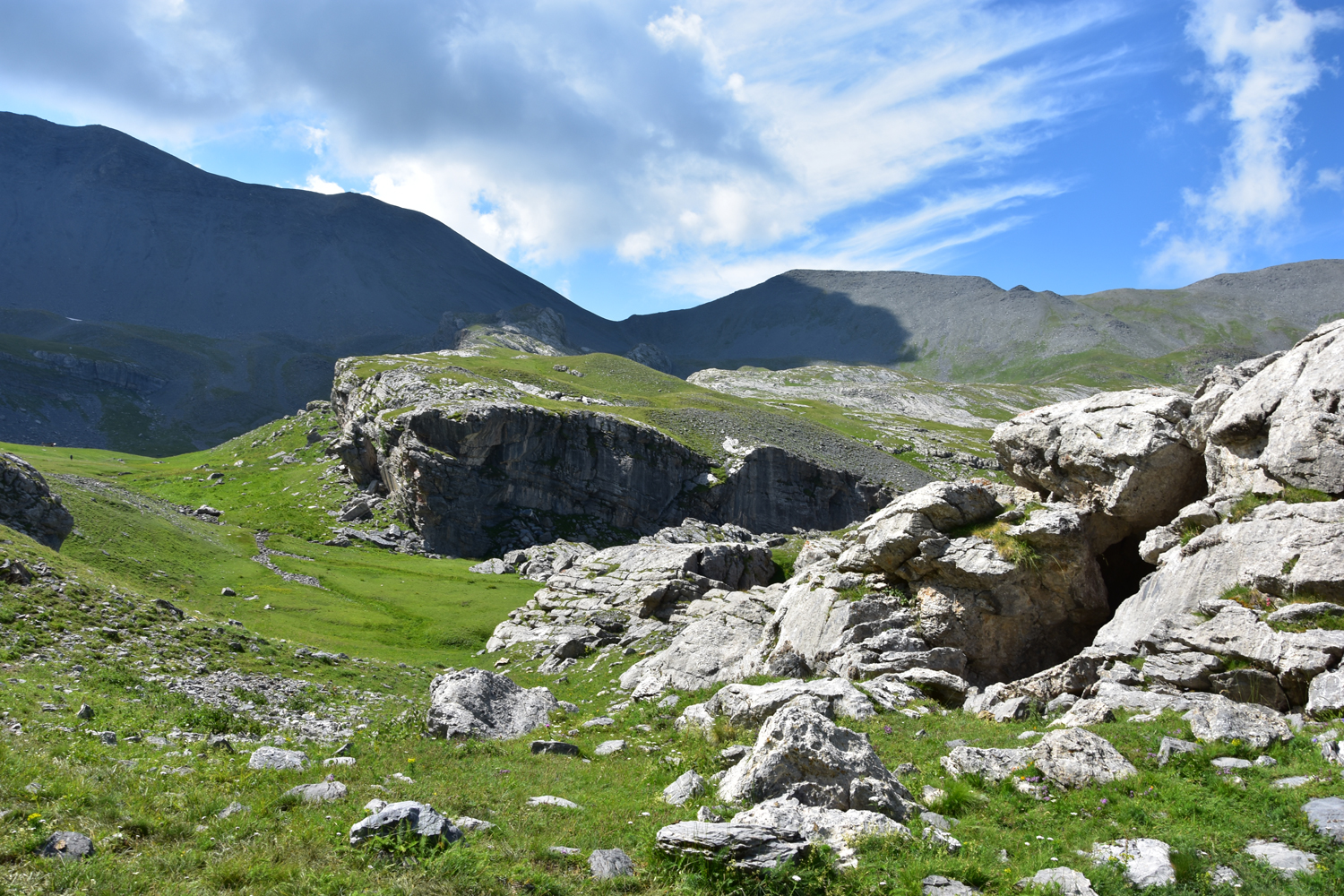 Über eine weite Hochfläche gelange ich zum grasigen Col des Moulinés. Der Regen hat inzwischen wieder aufgehört. Der Weiterweg zieht sich allerdings noch gewaltig. Nach einer langen Querung von Grashängen geht es am Rande einer Schlucht wieder aufwärts zu den Portes de Longon. Erneut setzt Regen ein. Über weite Almwiesen erreiche ich schließlich mein Tagesziel, das Refuge de Longon, eine Alm mit Übernachtungsmöglichkeit.