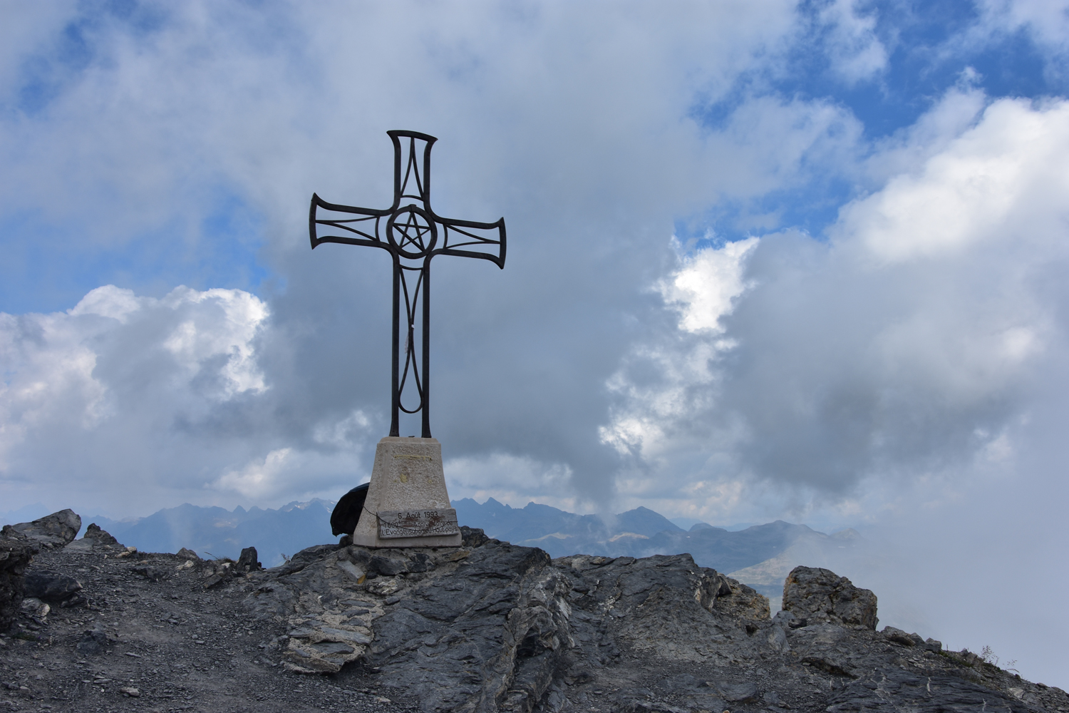 Mein Tourenpartner wandert schon weiter, während ich meinen Rucksack deponiere und mich auf den Weg zum Mont Mounier mache. Wenn ich ehrlich bin: Besonders attraktiv sieht der Berg nicht aus, es handelt sich eher um einen gigantischen Schutthaufen. Das Wetter ist ein wenig instabil, auch ein Gewitter erscheint nicht ausgeschlossen. Aber versuchen kann man es ja, solange es nicht anfängt zu blitzen und zu donnern! Der Vorgipfel (Petit Mounier) ist schnell erreicht, aber der Hauptgipfel ist schon in Wolken eingehüllt. Da die Orientierung am Kamm keine Probleme bereitet und sich die technischen Schwierigkeiten in Grenzen halten (eher T2 als T3), gehe ich weiter. Die Aussicht vom Gipfel entfällt allerdings. Als ich wieder am Rucksackdepot ankomme, setzt ein Regenschauer ein, begleitet von gelegentlichem Donner.