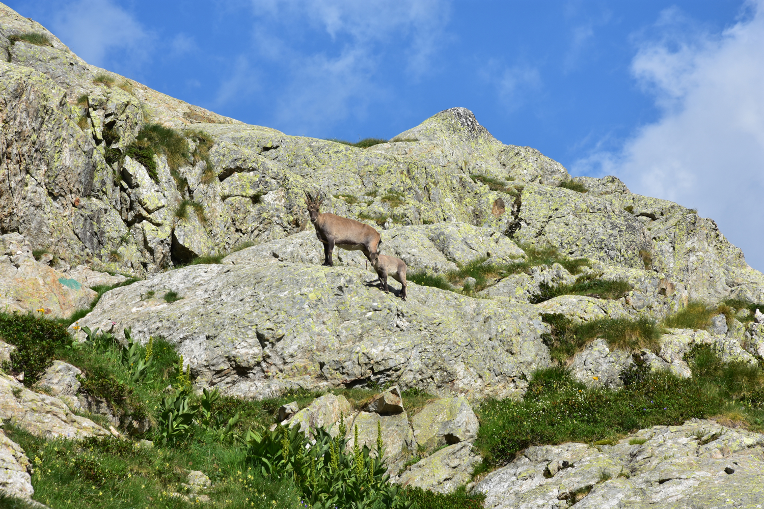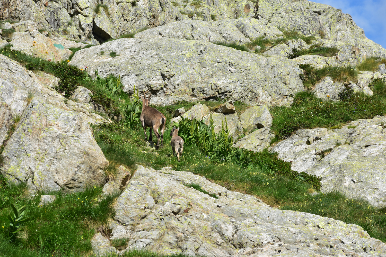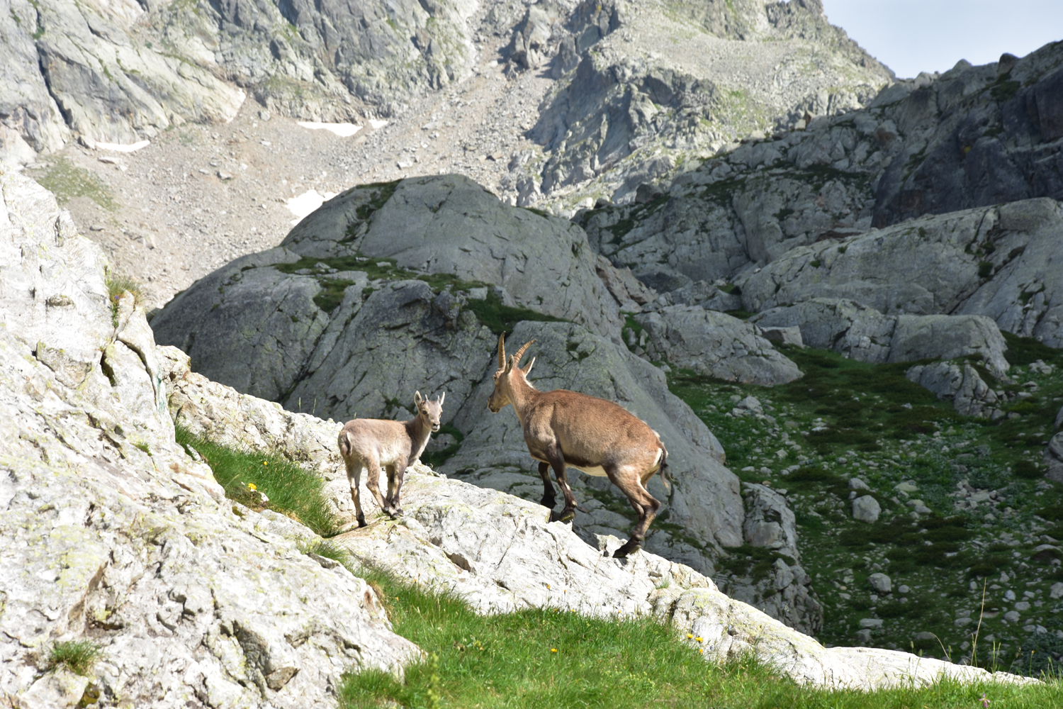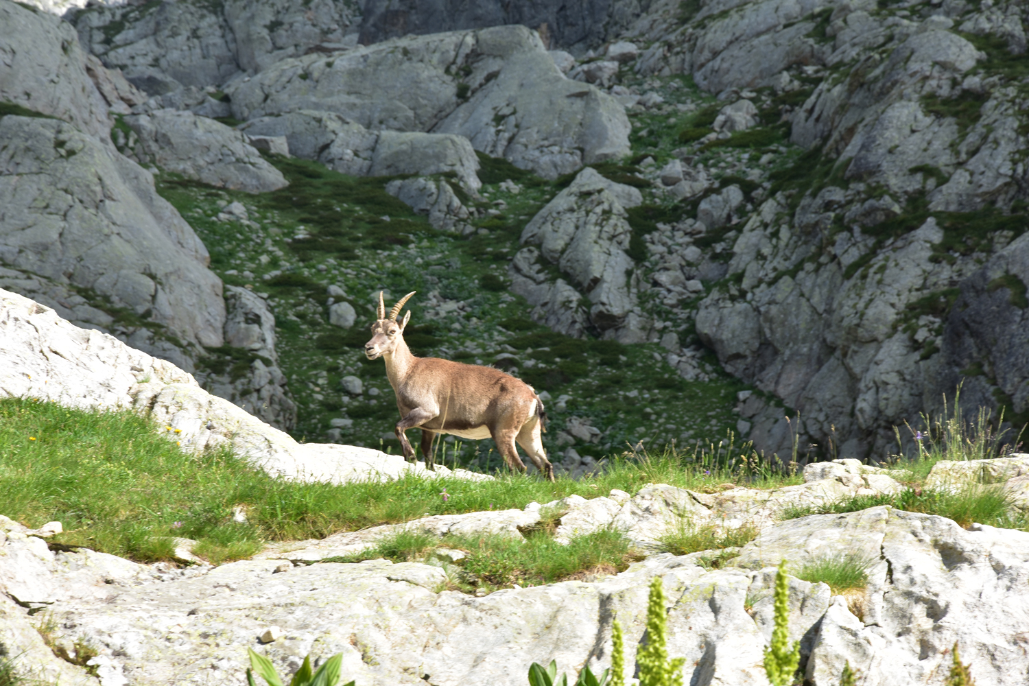 Auch beim Abstieg vom Pass nach Osten ist ein wenig Trittsicherheit angesagt, aber die Schwierigkeiten halten sich in Grenzen. Über Blockwerk geht es hinunter zum Bach unterhalb der Staumauer des Lac de la Fous. Diese Staumauer ist offensichtlich ein beliebter Steinbock-Spielplatz. Nach Ankunft am Refuge de Nice bietet sich nochmal eine Gelegenheit, die schönen Tiere zu beobachten. Nur wenige Meter von der Hütte entfernt kommt uns eine Steingeiß mit ihrem Jungen entgegen.
