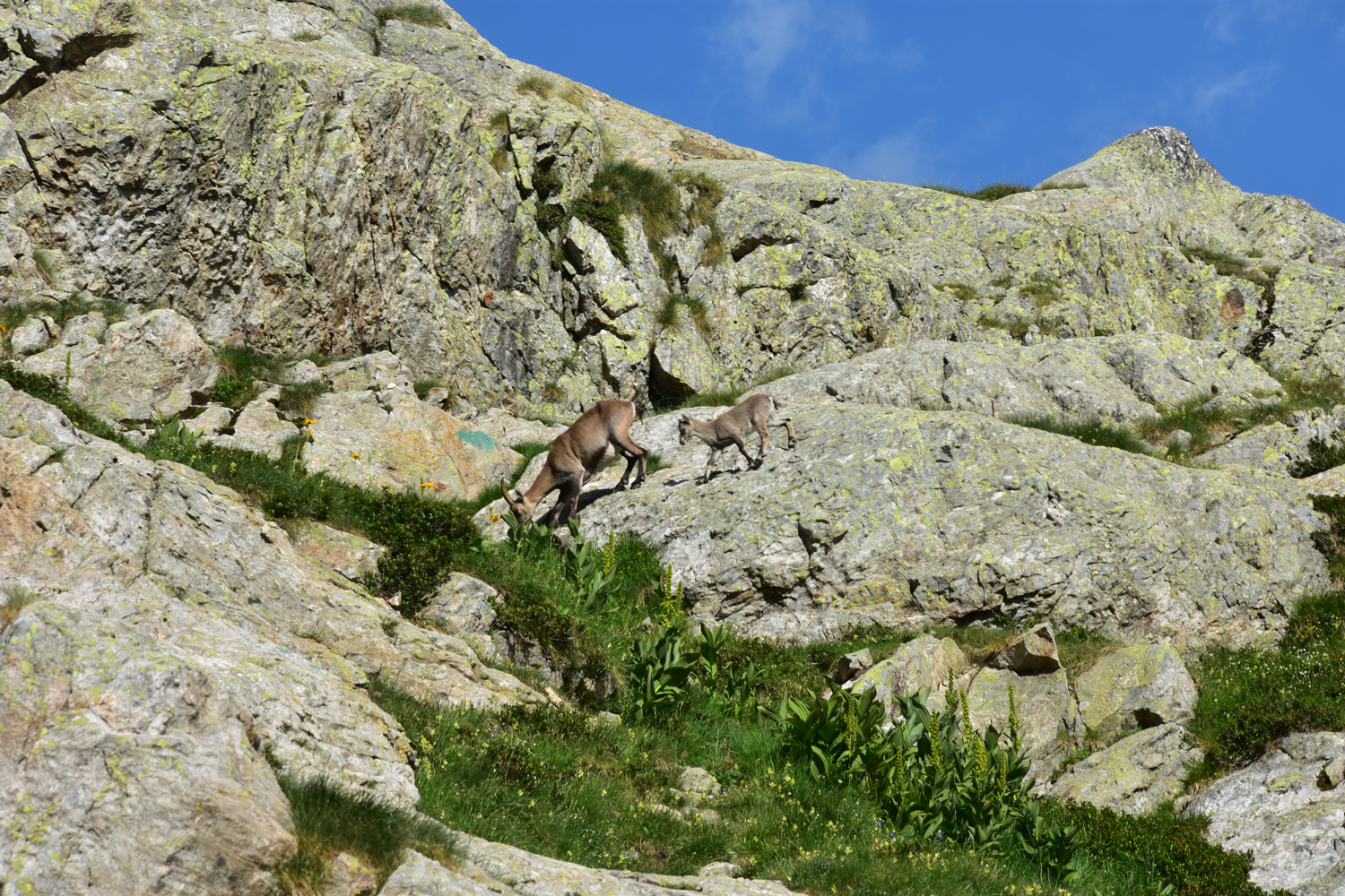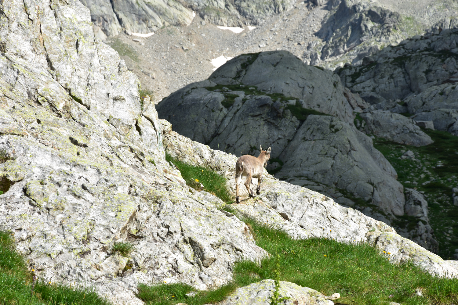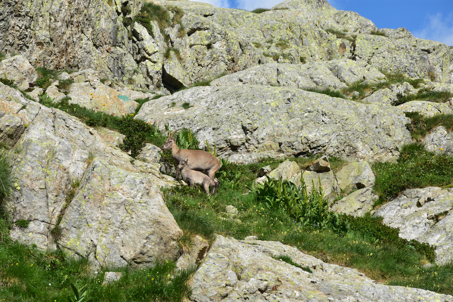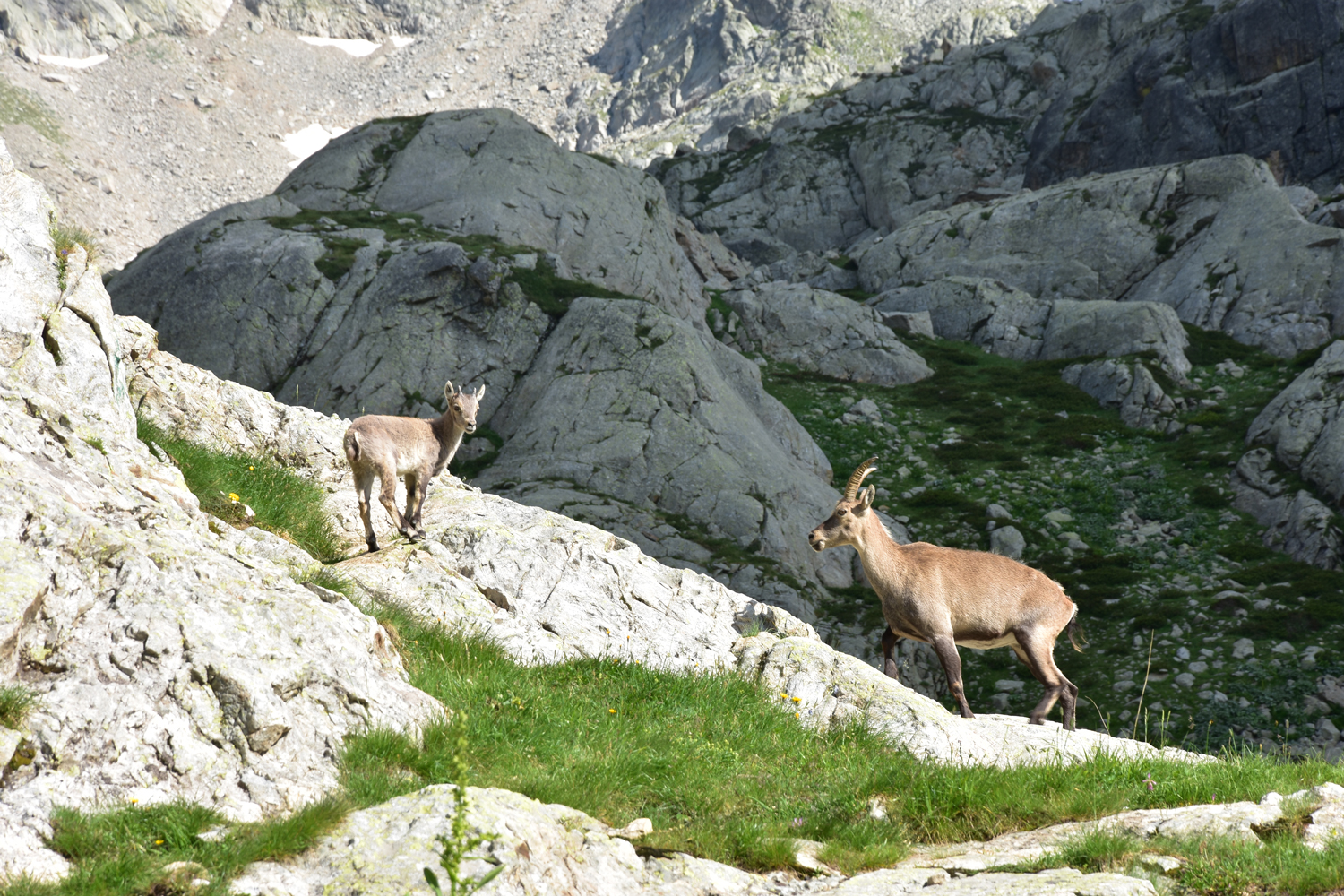 Auch beim Abstieg vom Pass nach Osten ist ein wenig Trittsicherheit angesagt, aber die Schwierigkeiten halten sich in Grenzen. Über Blockwerk geht es hinunter zum Bach unterhalb der Staumauer des Lac de la Fous. Diese Staumauer ist offensichtlich ein beliebter Steinbock-Spielplatz. Nach Ankunft am Refuge de Nice bietet sich nochmal eine Gelegenheit, die schönen Tiere zu beobachten. Nur wenige Meter von der Hütte entfernt kommt uns eine Steingeiß mit ihrem Jungen entgegen.