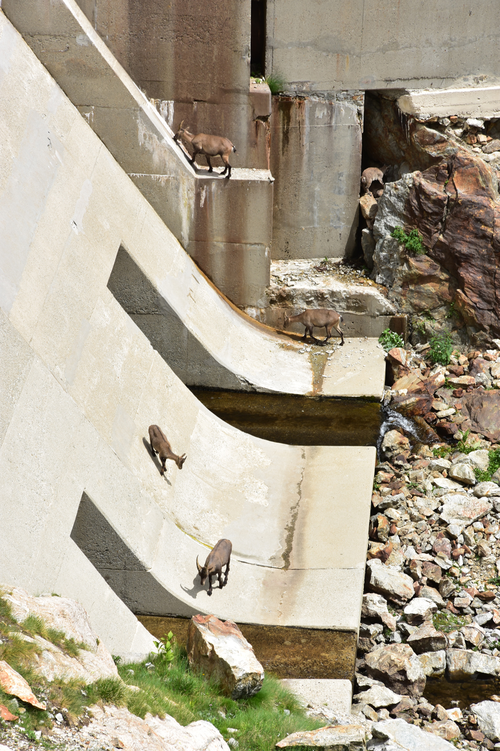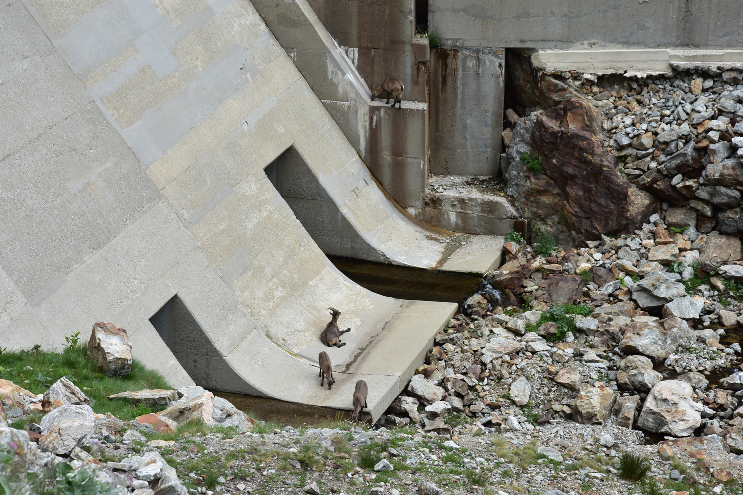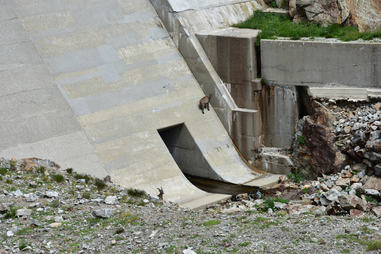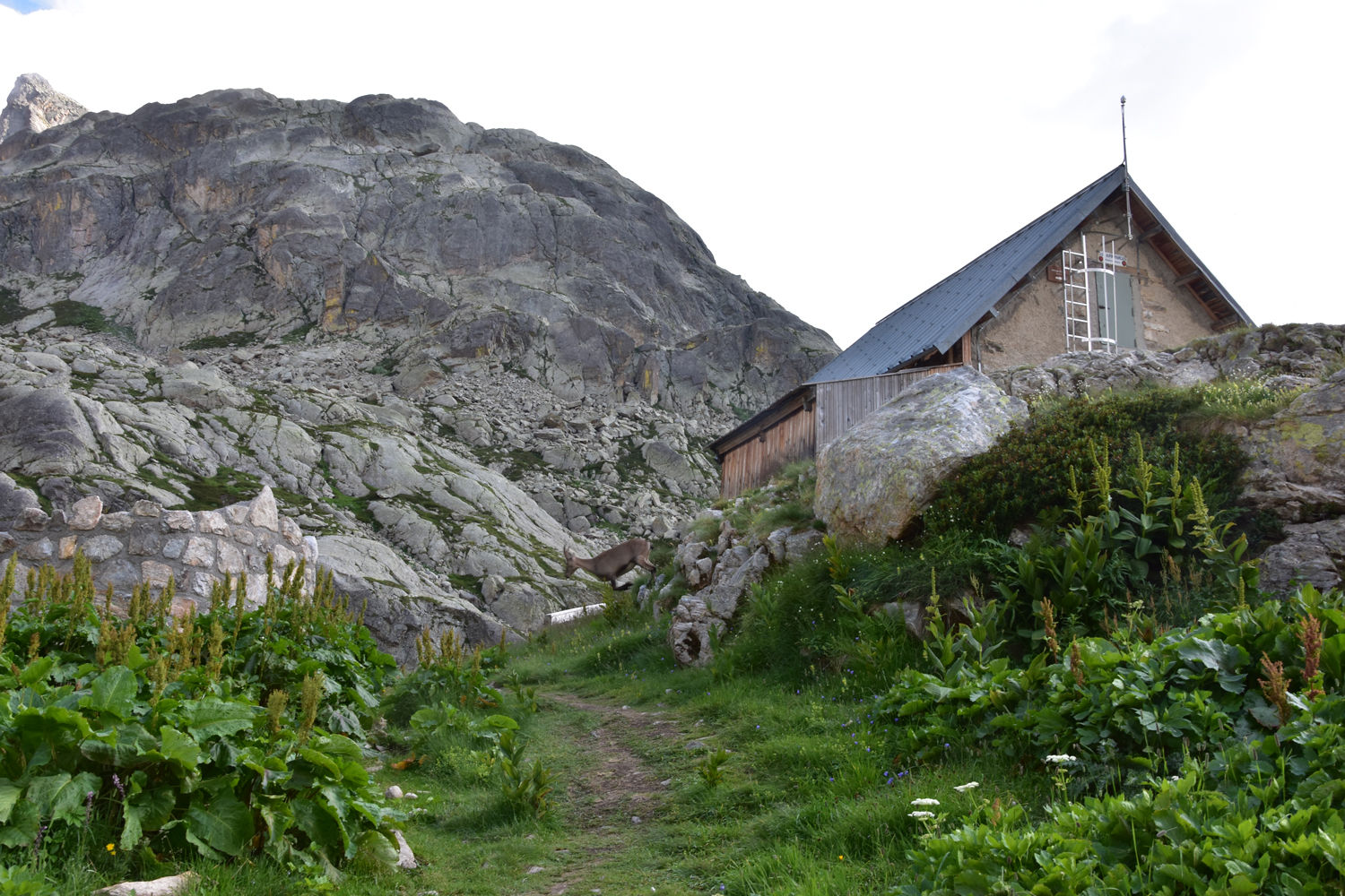 Auch beim Abstieg vom Pass nach Osten ist ein wenig Trittsicherheit angesagt, aber die Schwierigkeiten halten sich in Grenzen. Über Blockwerk geht es hinunter zum Bach unterhalb der Staumauer des Lac de la Fous. Diese Staumauer ist offensichtlich ein beliebter Steinbock-Spielplatz. Nach Ankunft am Refuge de Nice bietet sich nochmal eine Gelegenheit, die schönen Tiere zu beobachten. Nur wenige Meter von der Hütte entfernt kommt uns eine Steingeiß mit ihrem Jungen entgegen.