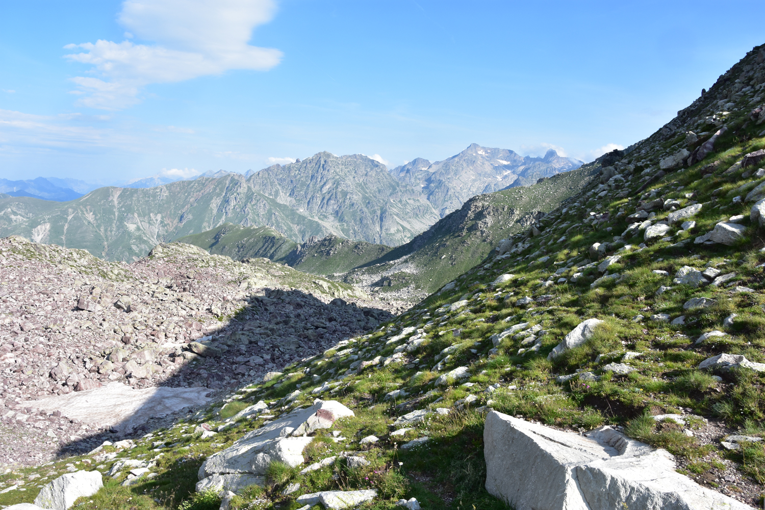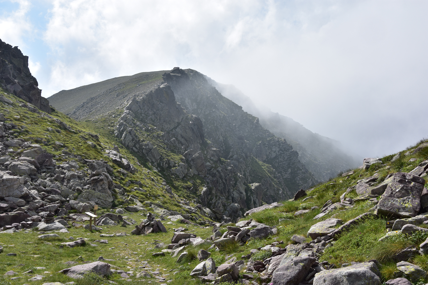 Nach dem Abstieg zu den Lacs du Diable erreichen wir wenige Minuten später den Pas du Diable, wo wir – jedenfalls den Namen nach zu urteilen – das Reich des Teufels wieder verlassen. Das Wetter ist leider nicht mehr so herrlich wie zuvor; inzwischen sind Wolken aufgezogen und beeinträchtigen die Sicht auf die benachbarten Gipfel. Über weite Geröll- und Grashänge steigen wir hinab zum Col de Raus und noch tiefer zur Baisse de Saint Véran.
