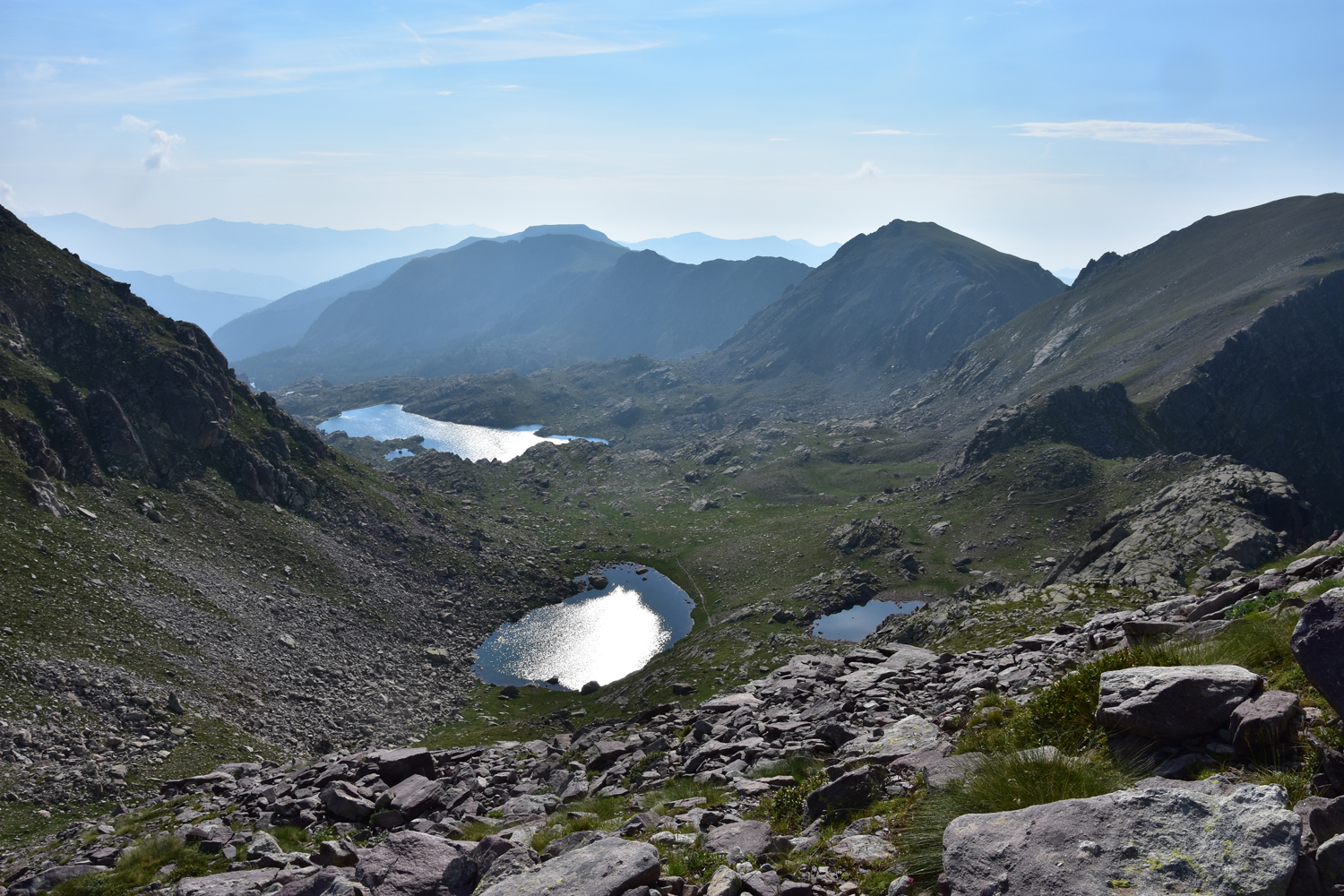 Wir starten bei schönstem Wetter am Refuge des Merveilles und wandern gemächlich durch die herrliche Seenlandschaft oberhalb der Hütte. Bei den Lacs du Diable deponieren wir die Rucksäcke und zweigen vom GR 52 ab, um noch einen Gipfel mitzunehmen. Die Cime du Diable, immerhin fast 2700 m hoch, lässt sich von hier auf gutem Weg erreichen. Vielleicht kann man vom Gipfel schon das Mittelmeer sehen! Diese Hoffnung erfüllt sich leider nicht, da es etwas zu dunstig dafür ist. Trotzdem: Der Aufstieg lohnt sich.