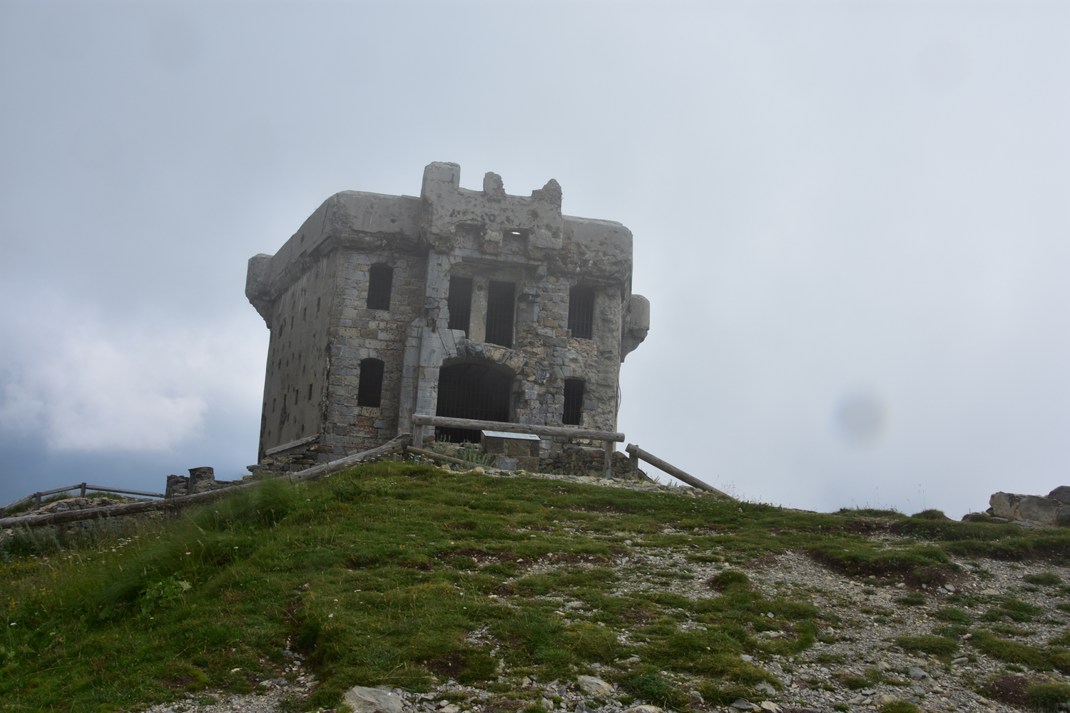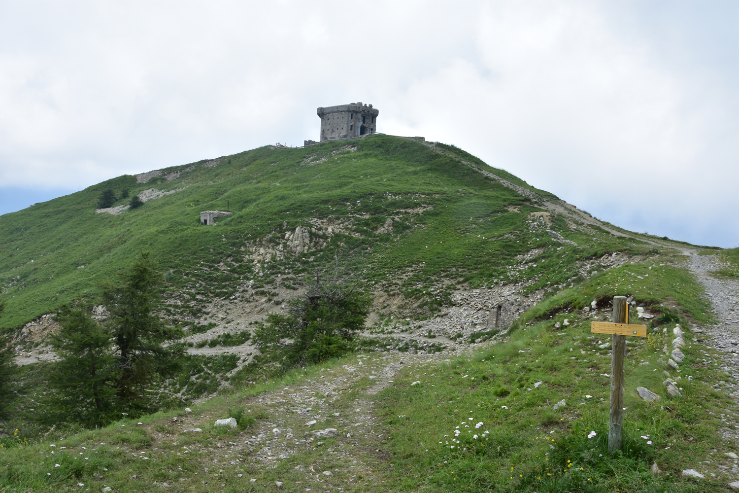 Bei bewölktem Himmel packen wir den Gegenaufstieg an, der uns zur markanten Festungsanlage "Pointe des Trois Communes" führt. Vielleicht wäre es besser gewesen, auf eine ausführliche Besichtigung der Anlage zu verzichten, denn ziemlich plötzlich beginnt es zu blitzen und zu donnern. Ungünstigerweise verläuft der Weg in diesem Bereich direkt am Kamm, was natürlich das Risiko eines Blitzeinschlags vergrößert; soweit möglich, versuchen wir den Kamm zu meiden. Zum Glück ist das Gewitter bald vorbei, dafür regnet es jetzt in Strömen. Unter dem Dach einer Hütte warten wir ab, bis der Regen nachlässt. Kurze Zeit später geht es wieder los, aber der Weg zum Camp d'Argent ist nicht mehr weit.