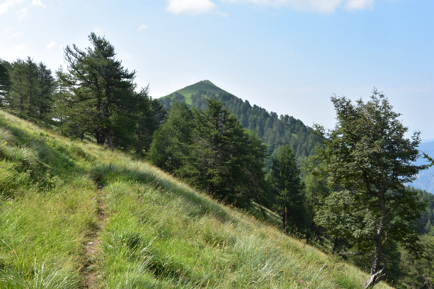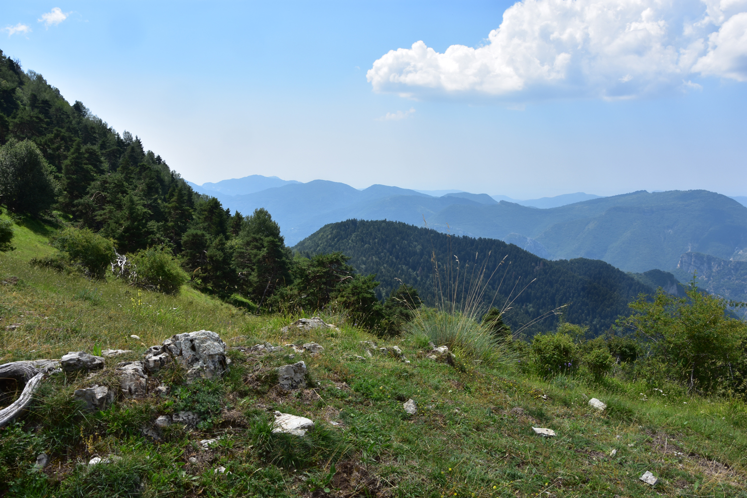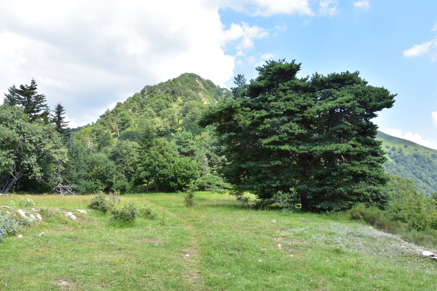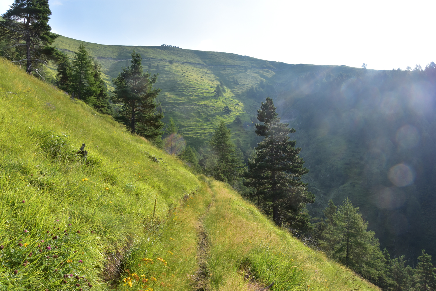 Wenige Meter nach dem Camp d'Argent zweigt ein schattiger Waldweg von der Straße nach links ab. In einer langen Querung, mal abwärts, mal aufwärts, wandern wir hinüber zu den Cabanes Vieilles, einer früheren militärischen Anlage. Hier wendet sich der Weg nach Süden, wobei nochmal eine Höhe von knapp 2000 m erreicht wird, bevor es zur Baisse de Ventabren und zur Baisse de la Déa hinuntergeht. Der Pass bietet sich an für eine kurze Pause.