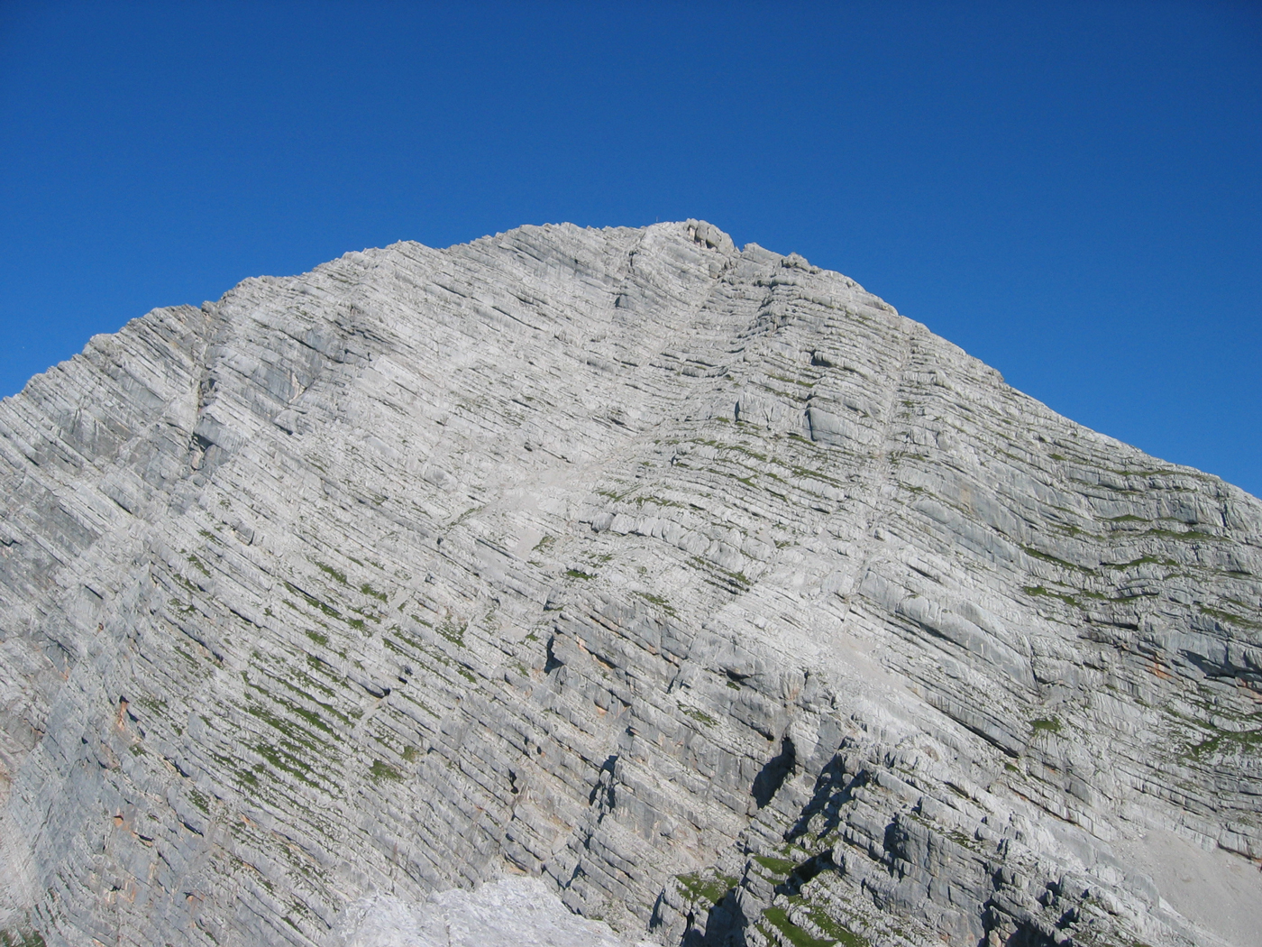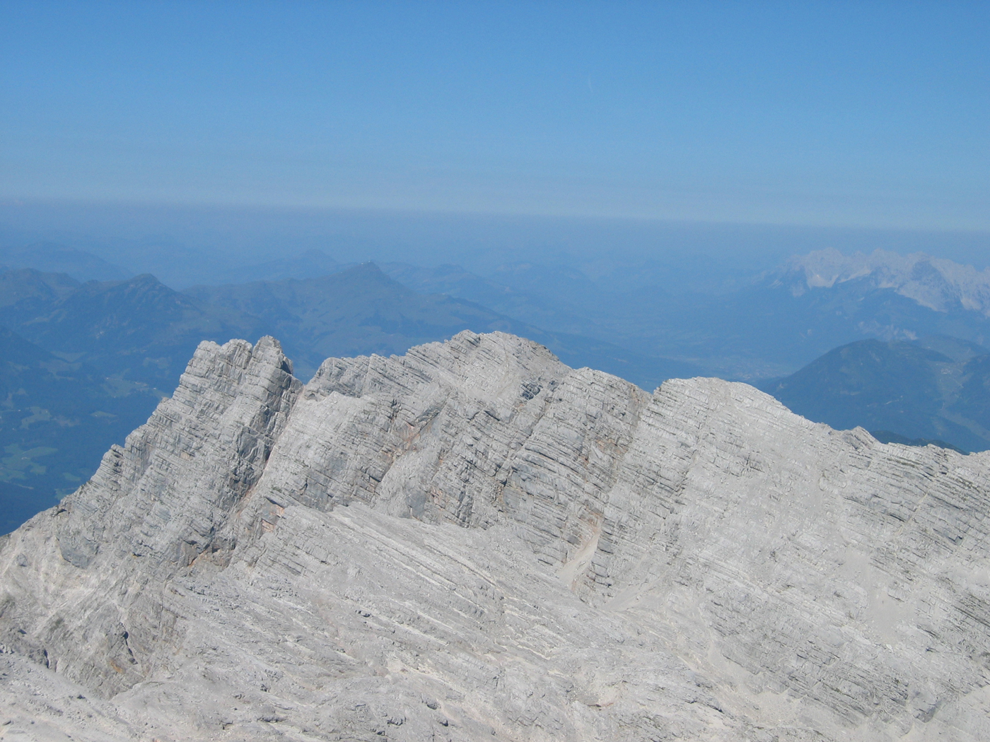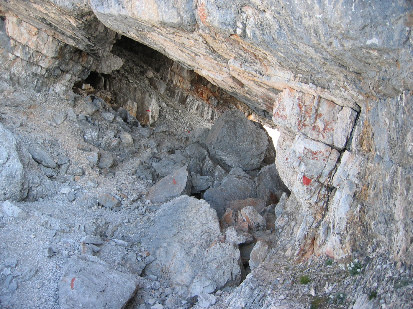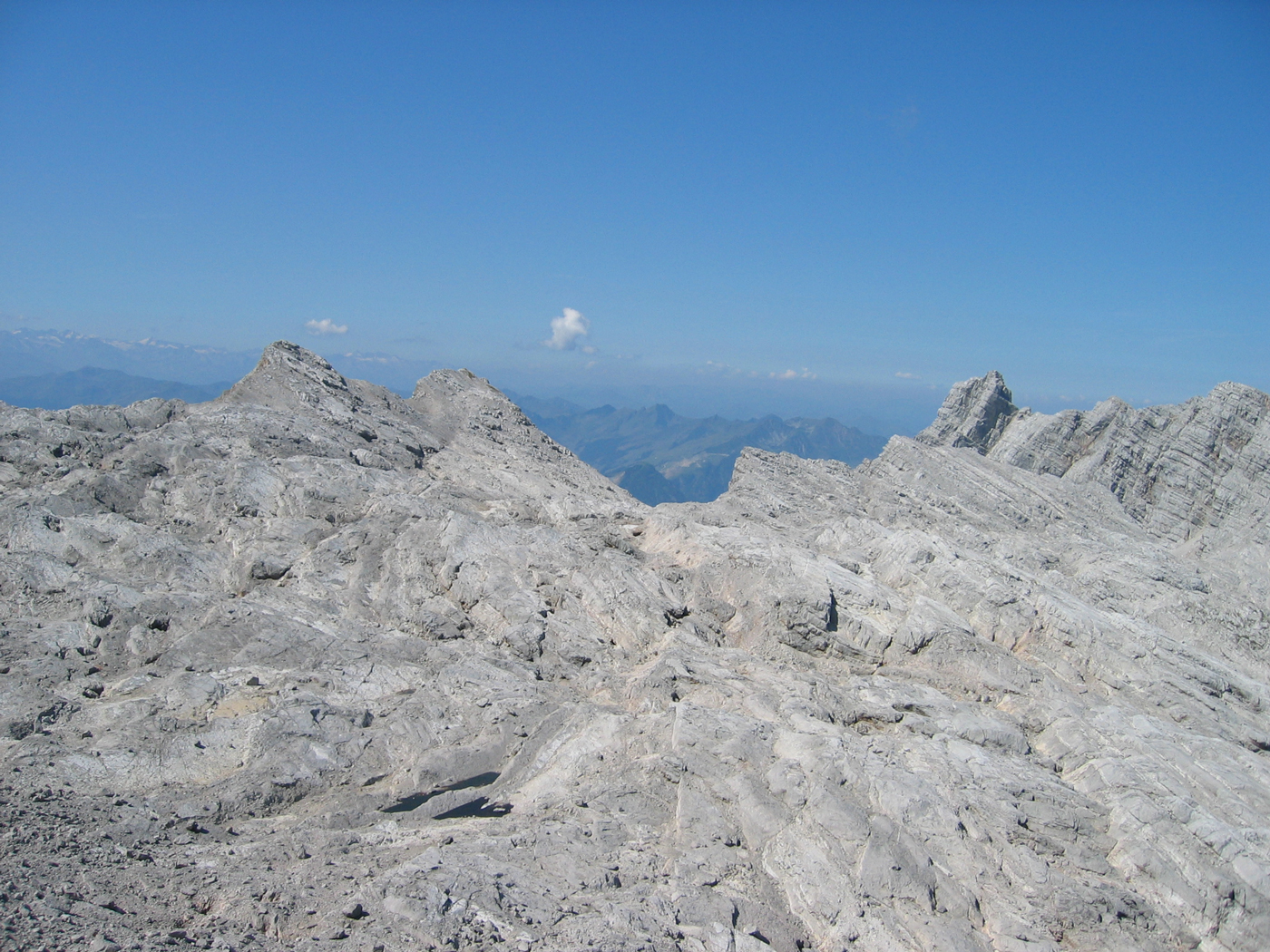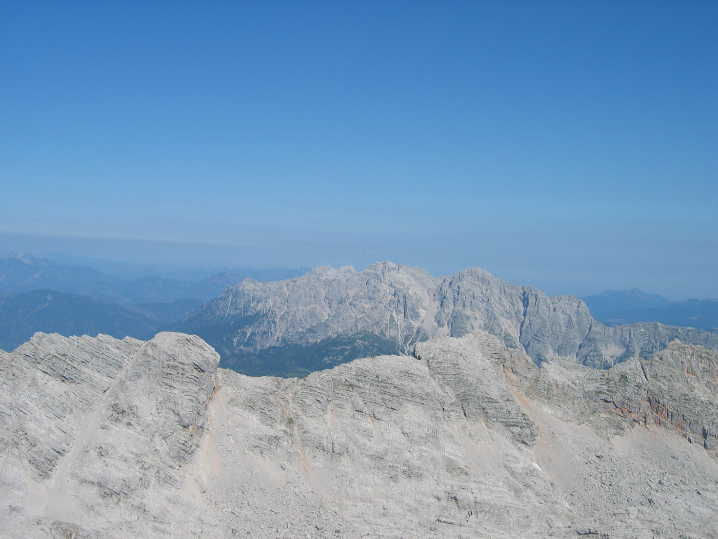 Heute ist – wie seit Wochen – wieder ein heißer Sommertag, der schon beim Aufstehen um 6 Uhr für Schweißtropfen sorgt. Auf einem guten Weg mit einfachen Kraxelstellen geht es von der Passauer Hütte über die Felsbänder der Südflanke hinauf auf das Birnhorn. Der drahtseilgesicherte Abstieg auf der Nordseite führt zu einem Sattel namens Kuchelnieder; von hier könnte man zur Passauer Hütte zurückkehren.