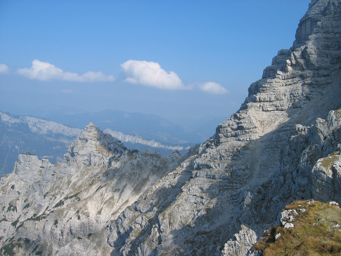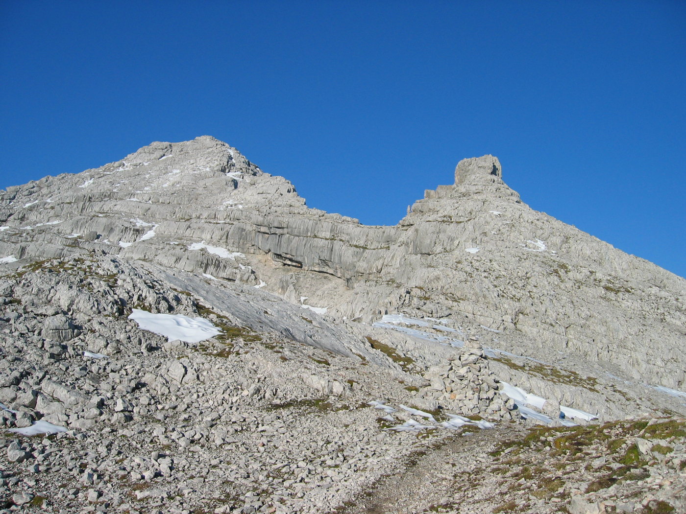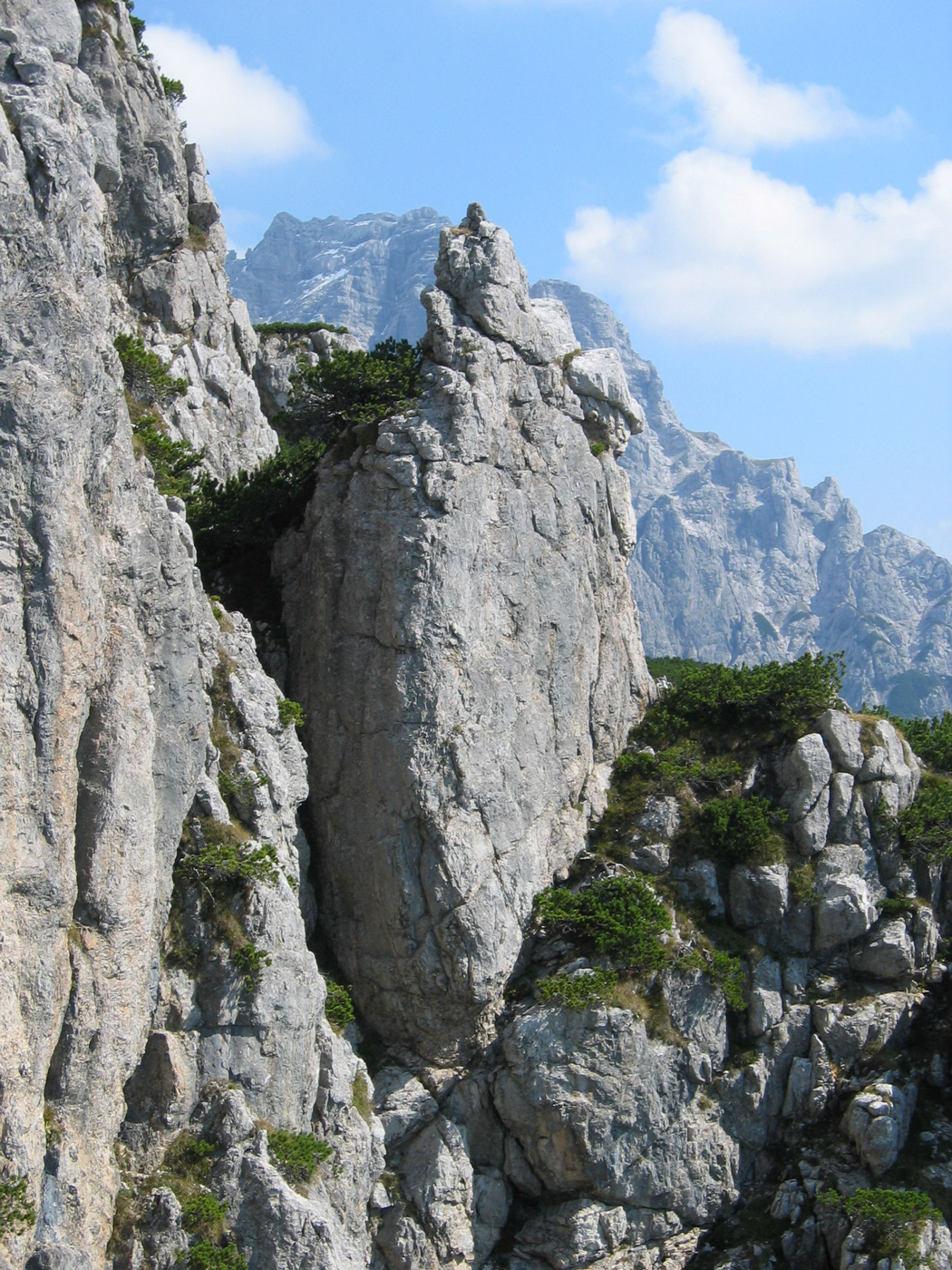 An der schon erwähnten Verzweigung wendet sich der Weg, nun deutlich absteigend, nach Süden zu einer Karstfläche, bevor man kurz vor dem wenig bedeutenden Schaflegg wieder den Verbindungsgrat erreicht. Der Weiterweg in südwestlicher Richtung ist zunächst genussreich und ohne Probleme. Erst kurz vor dem Seehorn (für "Andersgläubige" Ulrichshorn) geht es noch einmal richtig zur Sache. Eine steile, einigermaßen ausgesetzte Felsrinne will erklommen werden, was aber durch ein Drahtseil wesentlich erleichtert wird.