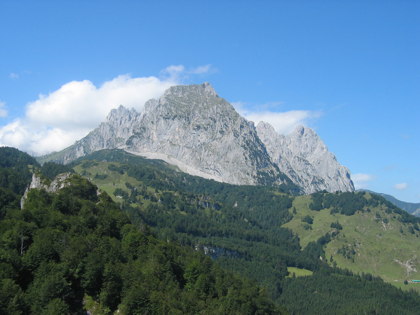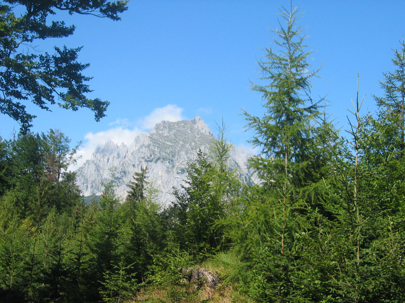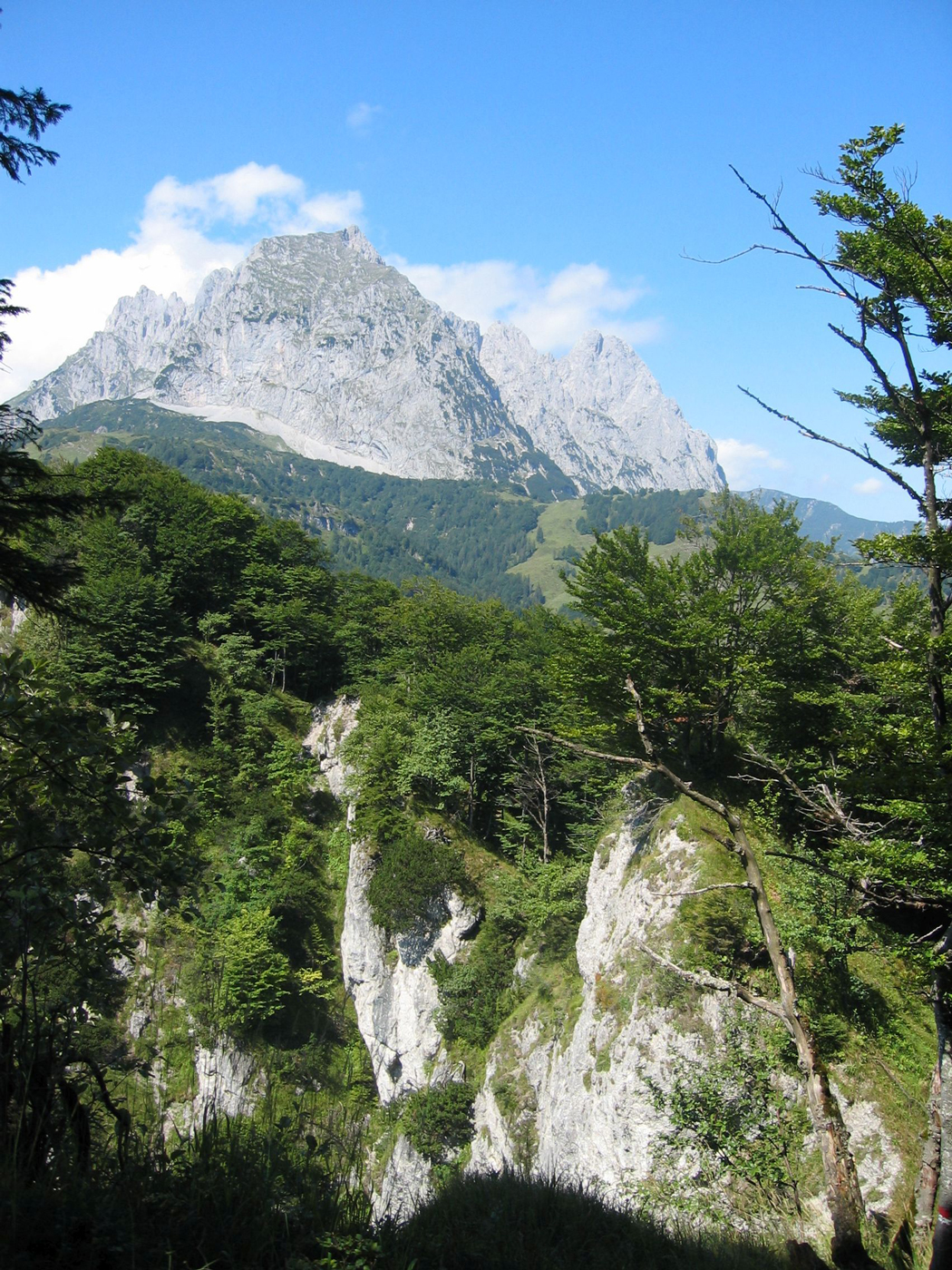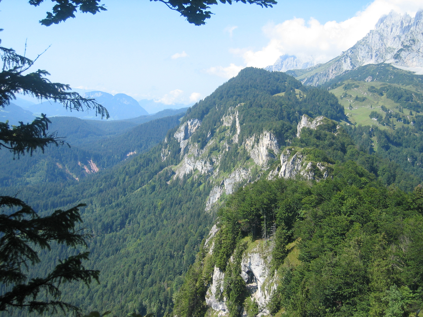 Der Wilde Kaiser gehört auf jeden Fall zu den spektakuläreren Gebirgsgruppen, sonst würde er nicht so heißen. Der wilde Teil dieser Gruppe beginnt allerdings noch nicht in St. Johann. Heute geht es erst einmal über die einfachen Mugel des Vorkaisers. Trotzdem ist es eine nette Wanderung, sobald man den geschäftigen Ort verlassen hat. Auf Waldwegen, teilweise recht steil, steige ich hinauf zum Schatterberg. Danach geht es ziemlich gemütlich über den Gscheuerkopf zur Niederalm. Auch der Weiterweg zum höchsten Punkt der heutigen Etappe, dem Gamskögerl, ist angenehm zu gehen.