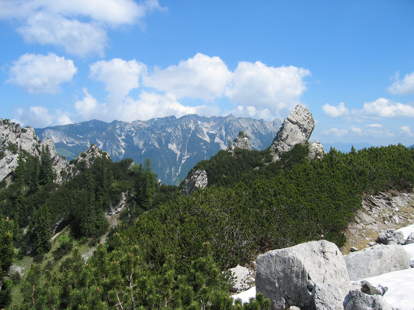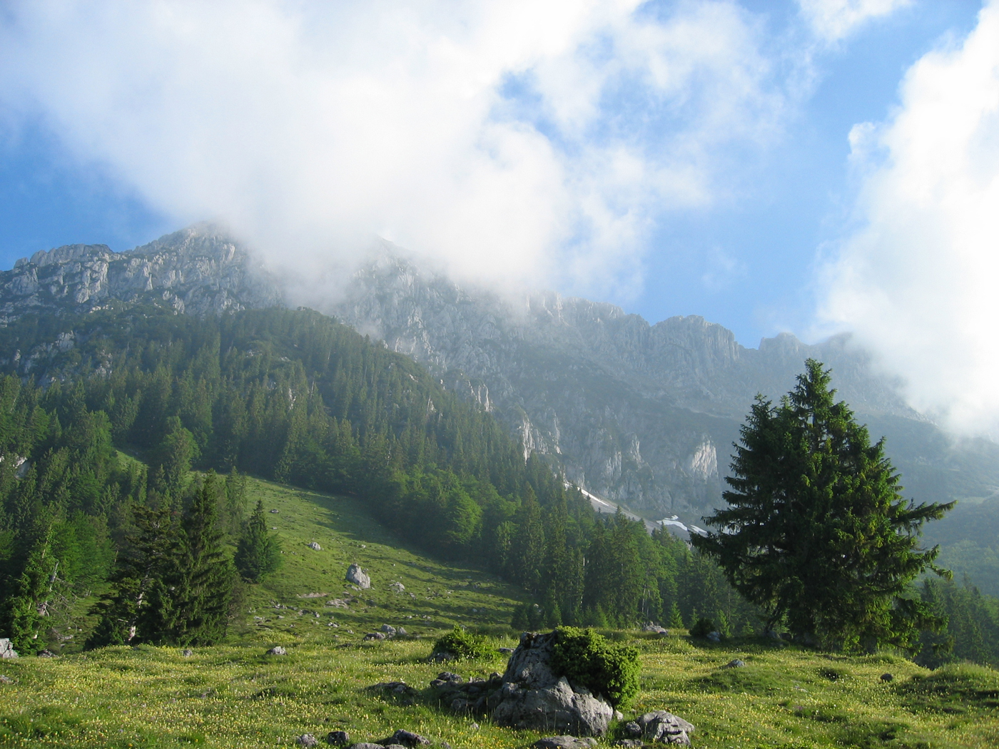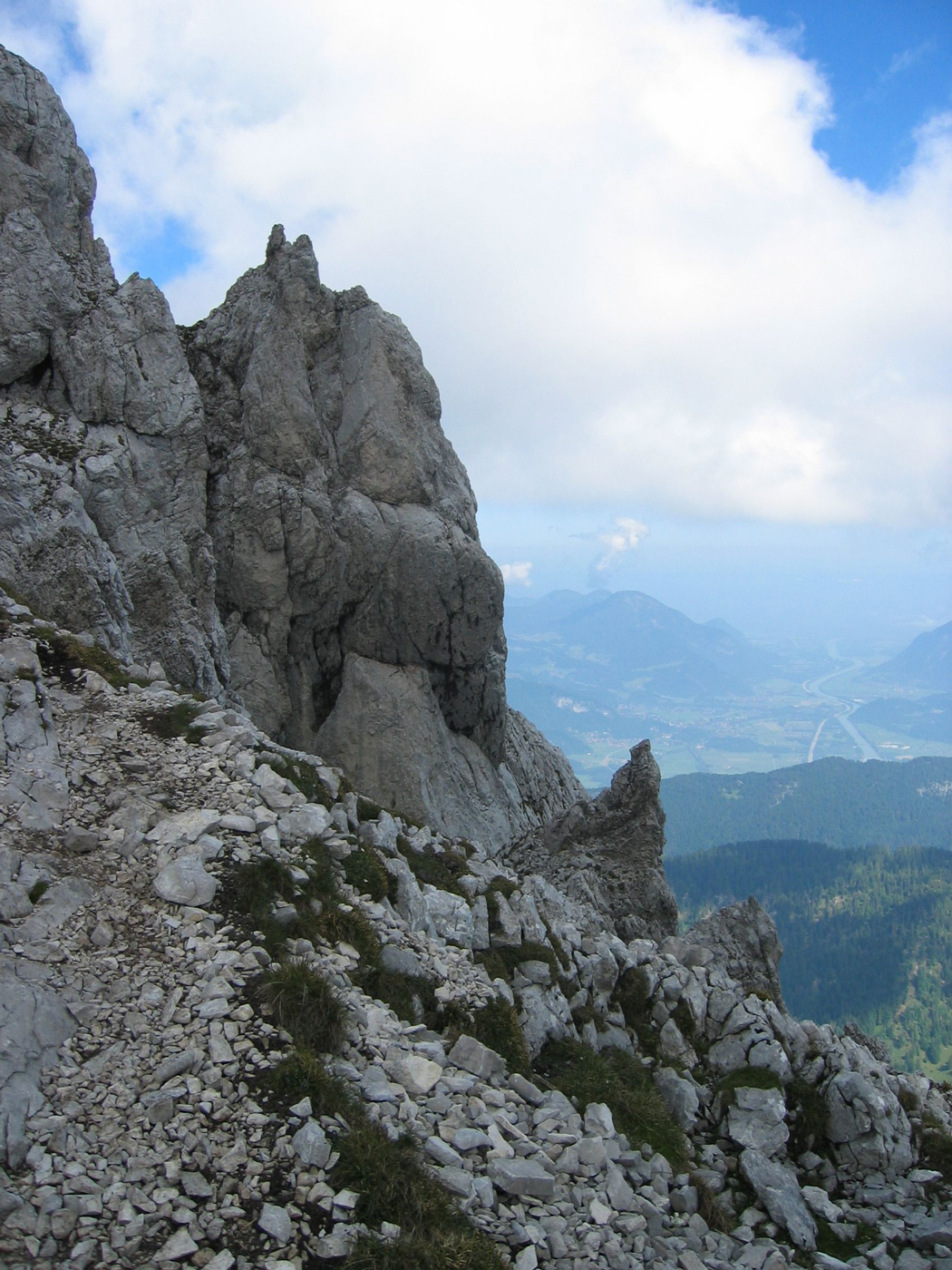 Eine sonntägliche Tagestour soll meine Durchquerung des Wilden Kaisers abschließen, die ich im letzten Jahr nicht mehr ganz geschafft habe. Früh am Morgen fahre ich über die Inntalautobahn nach Scheffau, um mein Auto dort abzustellen. Auf einfachen Almwegen steige ich auf zur Kaiser-Hochalm, dem Anschlusspunkt der letztjährigen Tour. Den Gipfelaufstieg zum Scheffauer kenne ich schon von einer früheren Unternehmung, 25 Jahre ist es her! Die Aussicht allerdings war damals im September 1980 eindeutig besser, heute ist die Luft etwas diesig.