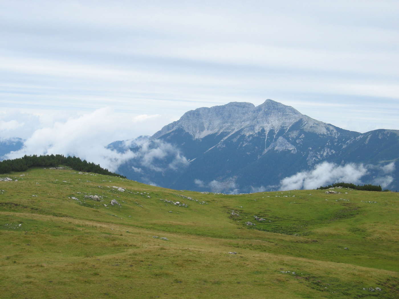 Nach einer schönen USA-Reise, unter anderem mit Besteigung des Mount Whitney (meines ersten und einzigen Vierzehntausenders), sollte die Kondition locker für eine Überschreitung des Rofanstocks ausreichen. Von Kramsach aus geht es, vorbei an Pletzachalm und Hochalm, auf den Roßkogel. Das Panorama ist durch Wolken beeinträchtigt, aber es bleibt im Wesentlichen trocken, und für morgen ist bestes Wetter angesagt.
