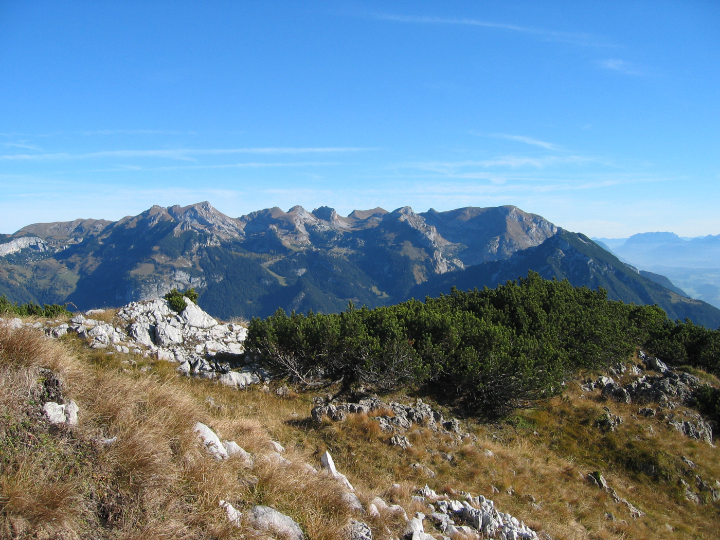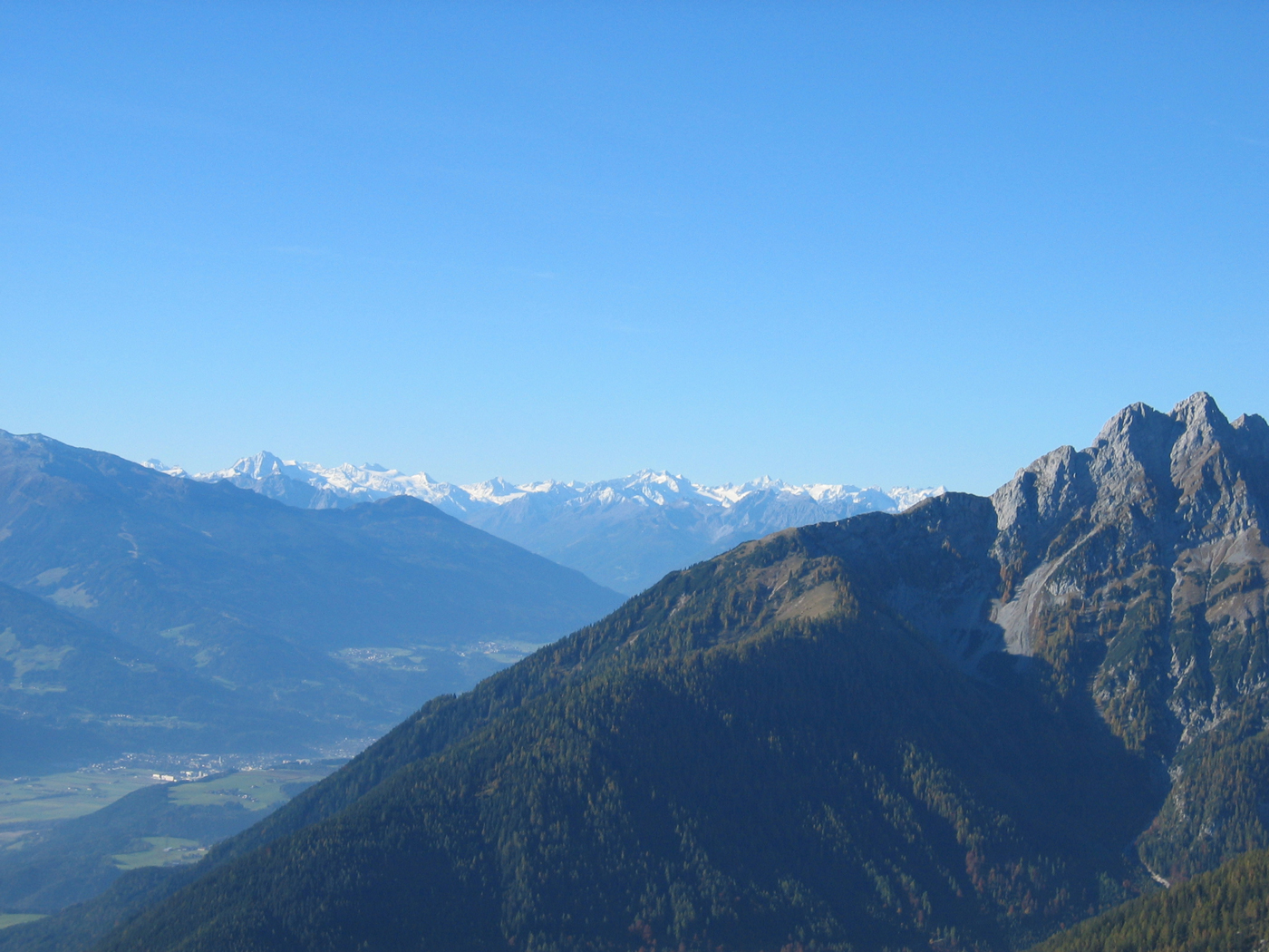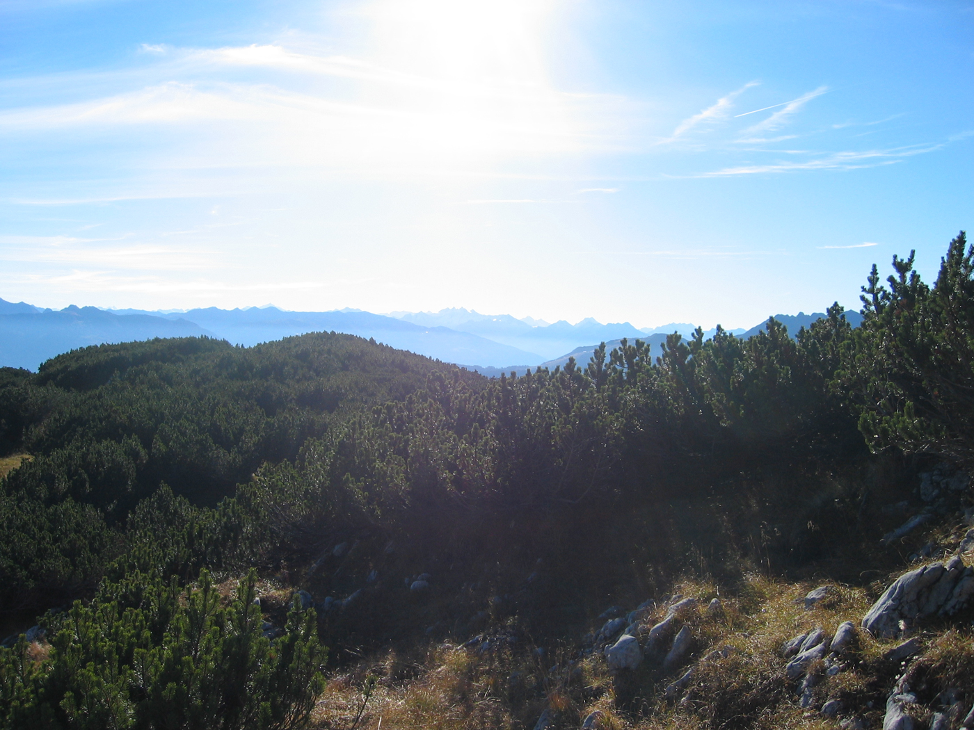 Ich hatte nicht damit gerechnet, so spät im Jahr meine Ost-West-Durchquerung noch fortsetzen zu können, aber die stabile Schönwetterphase Mitte Oktober muss einfach ausgenützt werden. Von Maurach am Achensee steige ich über die Heiterlahn-Alm auf das Stanser Joch. Im Gegensatz zum bisherigen, nicht besonders attraktiven Aufstiegsweg, beginnt hier eine wunderbare, bequeme Wanderung über den Stanser Kamm: Seierjoch (Ochsenkopf), Gamskarspitze, Schlössl und Kaserjochspitze heißen die Gipfel(chen), die sich ohne nennenswerte Anstrengung erreichen lassen. (Als Alternative zur Gratüberschreitung könnte man natürlich auch den Wanderweg 234 nehmen, der südlich des Kamms verläuft und ebenfalls zum Kaserjoch führt. Nach meiner Ansicht wäre das aber weniger reizvoll.) Die Überschreitung ist meist problemlos; nur im Bereich Schlössl sind auch anspruchsvollere Stellen zu bewältigen. Nach einem Zwischenabstieg zum Kaserjoch nehme ich noch als höchsten Gipfel des Tages die Rappenspitze mit.