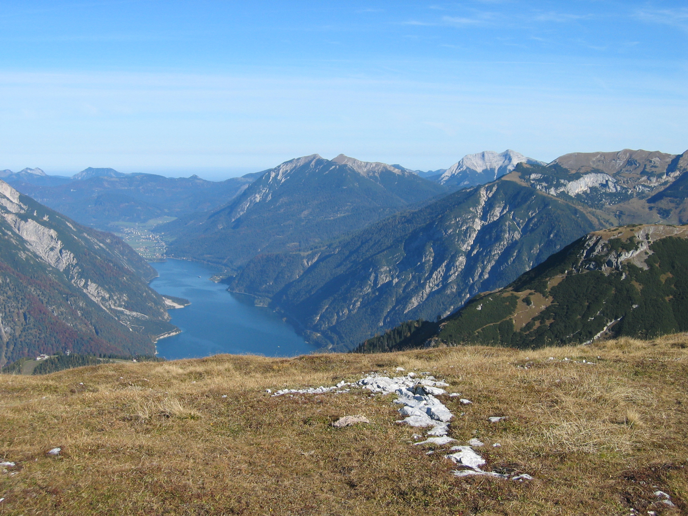 Der Abstieg, schon recht spät am Nachmittag, erfolgt in nördlicher Richtung über die Dristl-Alm zur Falzthurn-Alm. Um nach Maurach zurückzukommen, ist jetzt noch ein längerer Talhatscher fällig; über Pertisau geht es am See entlang zum geparkten Auto.