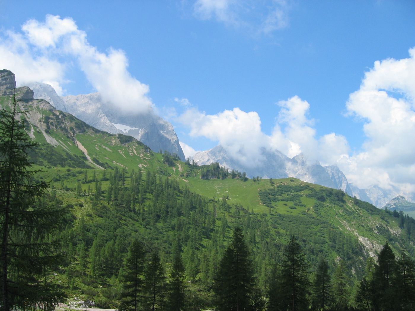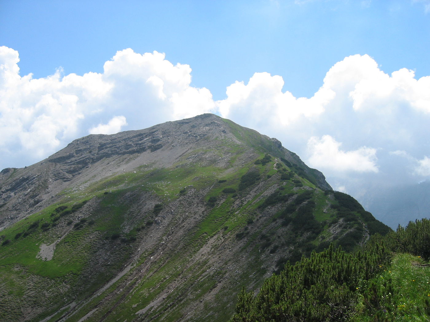 Das Karwendel ist nicht allzu weit entfernt von meinem Wohnort; daher ist es mir möglich, noch vor den Großen Ferien die Ost-West-Tour fortzusetzen. Dabei ist das Programm für heute überschaubar. Auf bequemen Wegen steige ich vom Wirtshaus Eng (Großer Ahornboden) zur Binsalm und weiter zum Binssattel, womit der Anschlusspunkt zur Sonnjoch-Besteigung vor einer Woche wieder erreicht ist. Nur noch eine halbe Stunde, dann bin ich auf dem Gipfel des Hahnkampl; hier liege ich ziemlich lange in der Sonne und genieße den schönen Tag. Ein gemütlicher Abstieg zur Lamsenjoch-Hütte schließt die Tour ab.