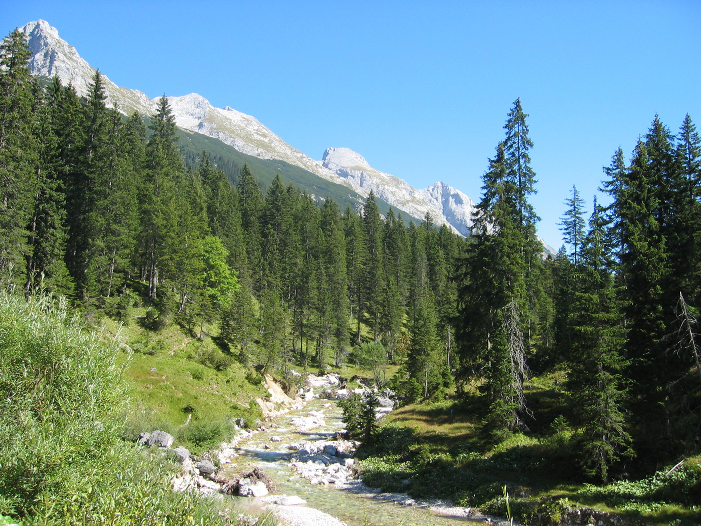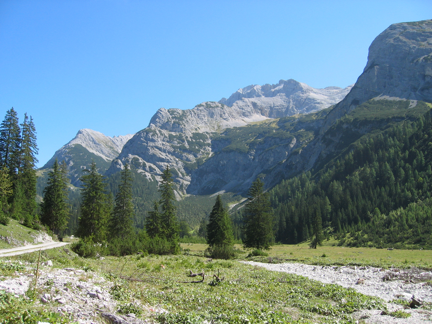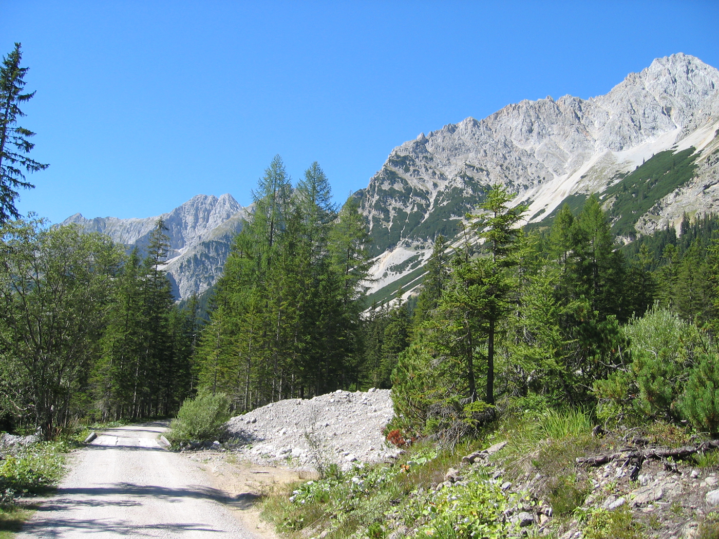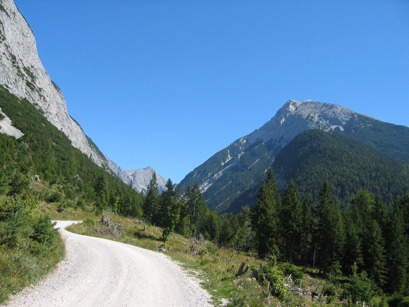 Auf der letzten Tour meiner Weitwanderung in Etappen bin ich bis zum Hochalmsattel gekommen, der knapp oberhalb des Karwendelhauses liegt. Eineinhalb Monate später breche ich bei schönstem Wetter erneut ins Karwendel auf, um in einer Viertagestour den westlichen Teil dieser reizvollen Gebirgsgruppe zu durchwandern. Von Scharnitz marschiere ich durch das Karwendeltal, immer wieder überholt von Mountainbikefahrern. Anscheinend bin ich heute der einzige, der zu Fuß den langen Weg zum Karwendelhaus zurücklegt. Trotzdem: Es ist eine wunderbare Wanderung, und es gibt viel zu sehen.