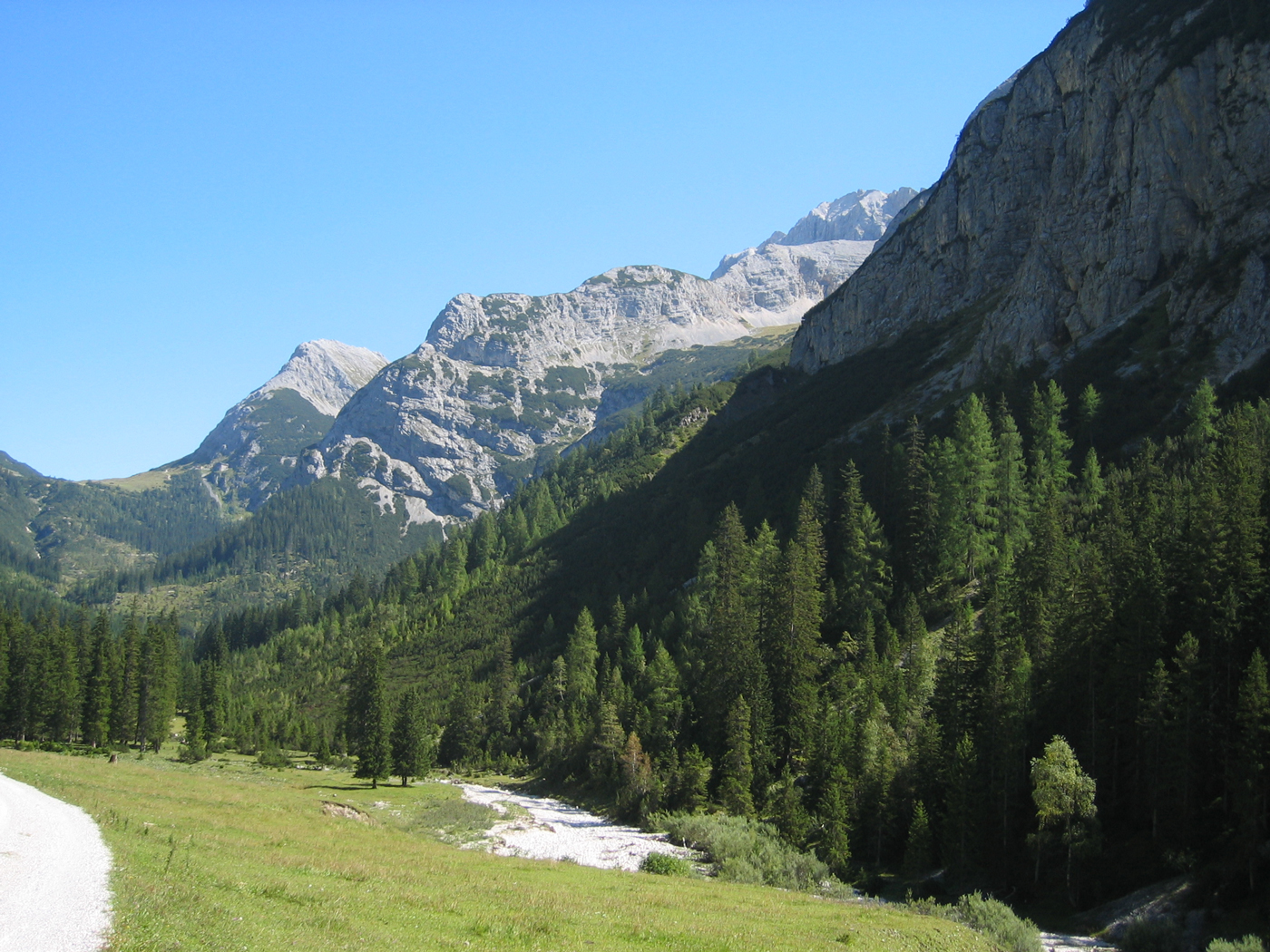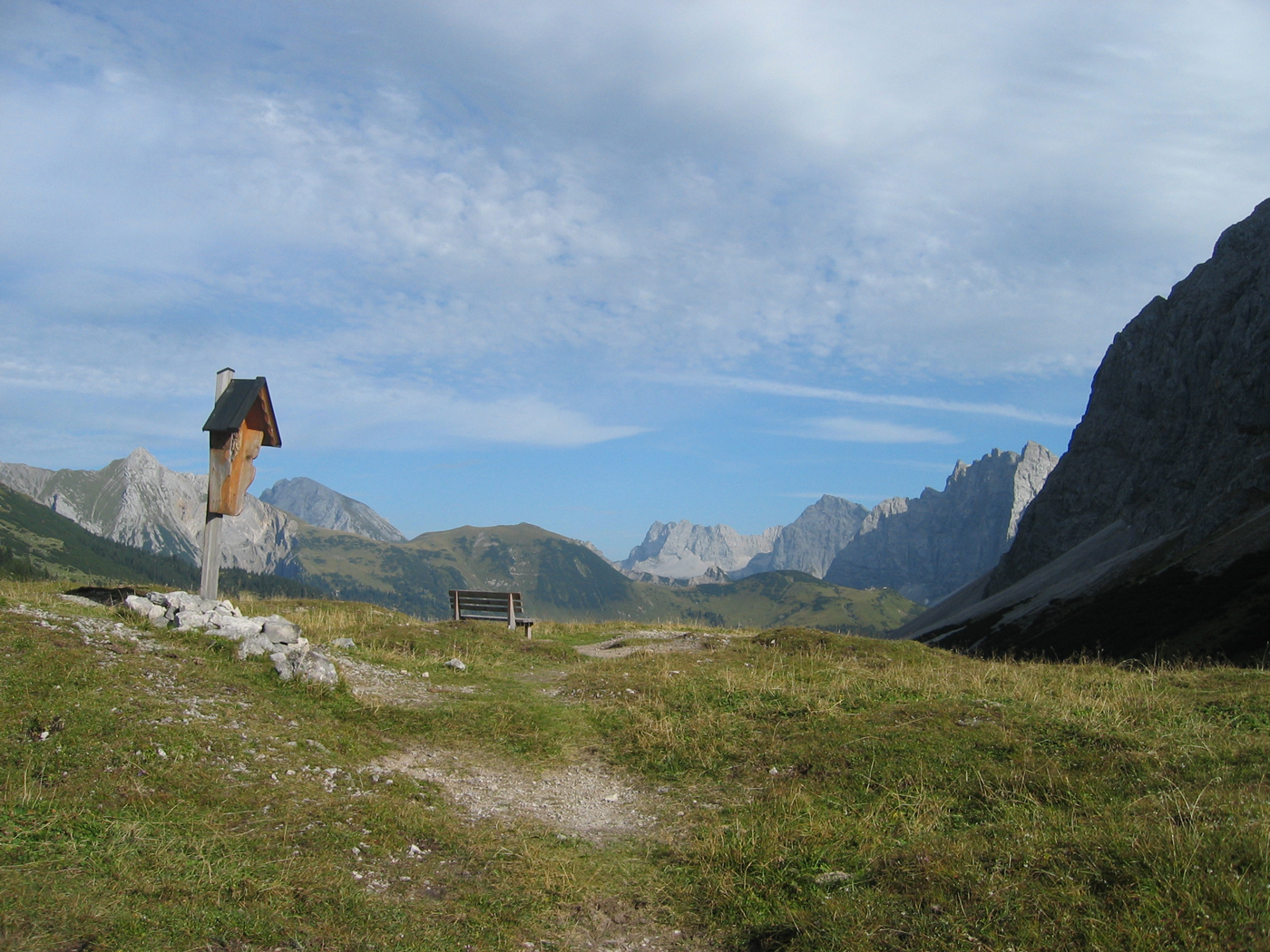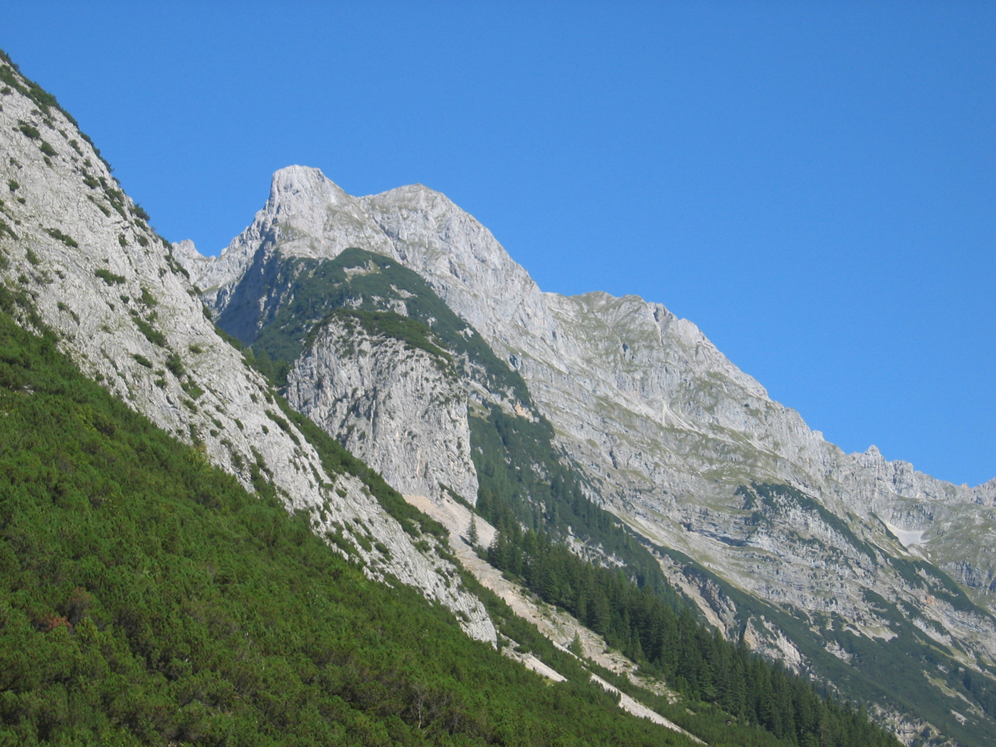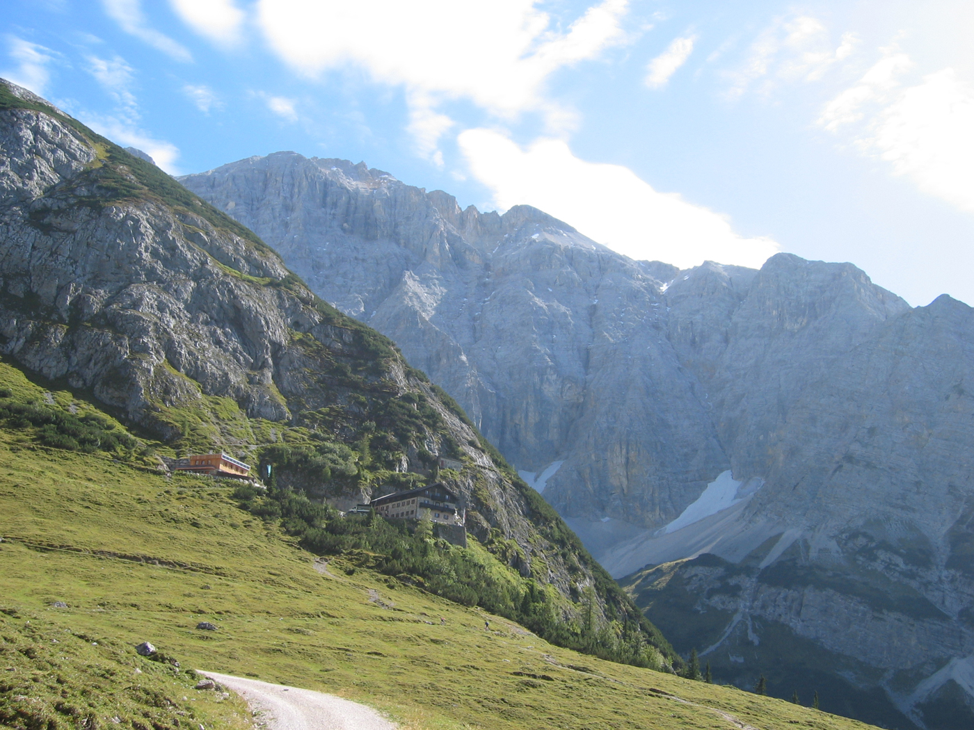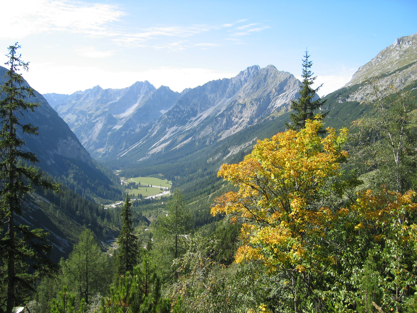 Auf der letzten Tour meiner Weitwanderung in Etappen bin ich bis zum Hochalmsattel gekommen, der knapp oberhalb des Karwendelhauses liegt. Eineinhalb Monate später breche ich bei schönstem Wetter erneut ins Karwendel auf, um in einer Viertagestour den westlichen Teil dieser reizvollen Gebirgsgruppe zu durchwandern. Von Scharnitz marschiere ich durch das Karwendeltal, immer wieder überholt von Mountainbikefahrern. Anscheinend bin ich heute der einzige, der zu Fuß den langen Weg zum Karwendelhaus zurücklegt. Trotzdem: Es ist eine wunderbare Wanderung, und es gibt viel zu sehen.