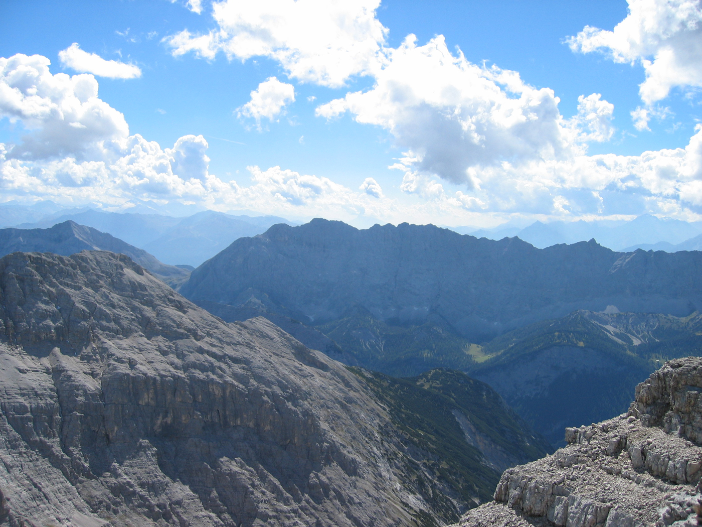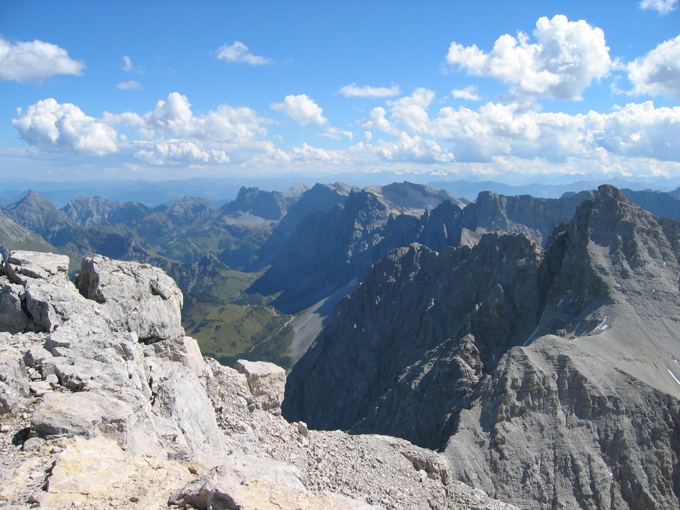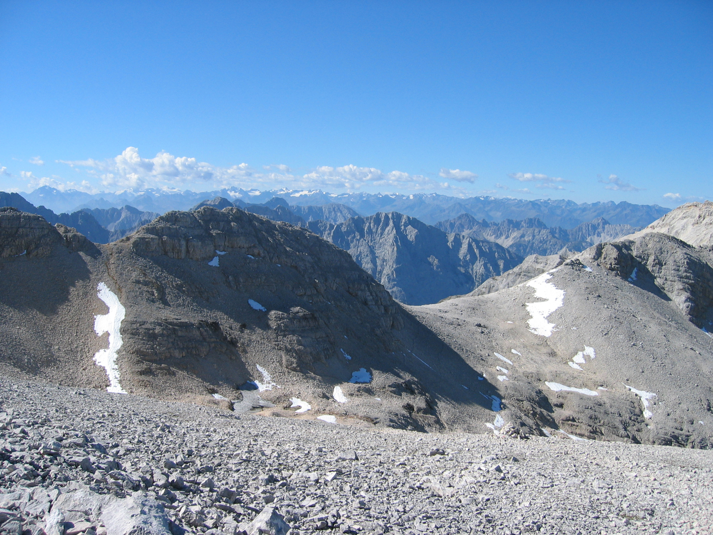 Beim weiteren Aufstieg geht es zunächst durch Latschengelände, später über weite Geröllfelder, die aber recht angenehm zu gehen sind. Gut drei Stunden nach meinem Aufbruch bin ich auf dem ersten Gipfel, der Westlichen Ödkarspitze. Bald darauf habe ich die Mittlere Ödkarspitze erreicht, wo die erste größere Pause fällig ist. Das Panorama ist überwältigend. Es folgt ein weiterer, ziemlich steiler Ab- und Aufstieg mit ein wenig Kraxelei, dann ist auch die Östliche Ödkarspitze geschafft. Über drahtseilgesicherte Felspassagen steige ich ab zum Schlauchkarsattel mit seiner winzigen Biwakhütte.