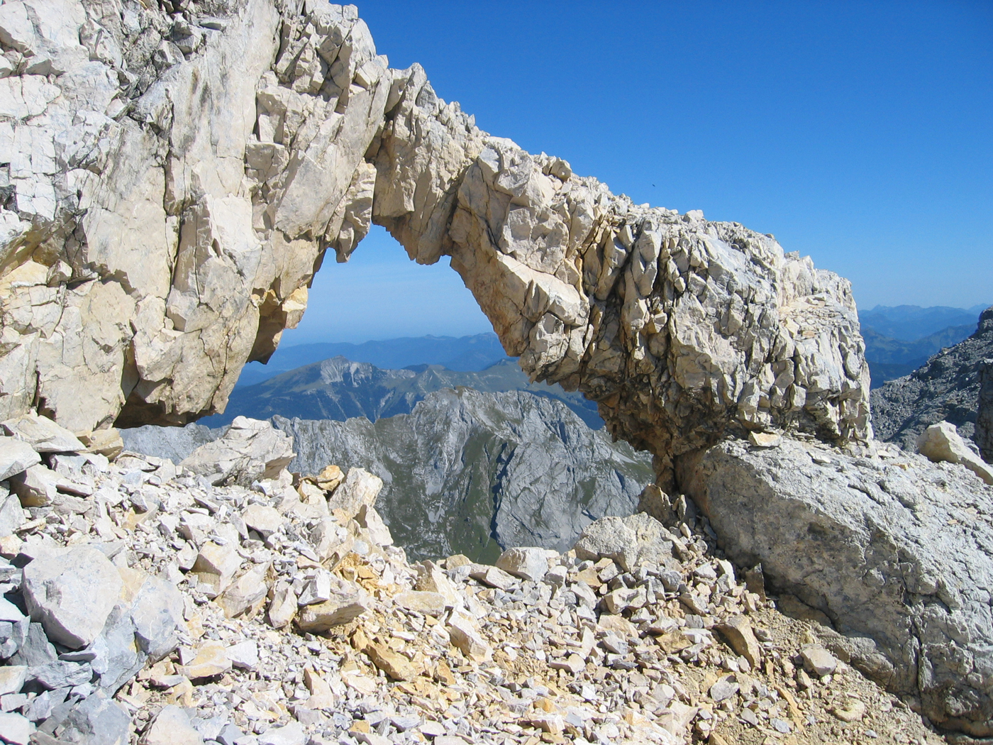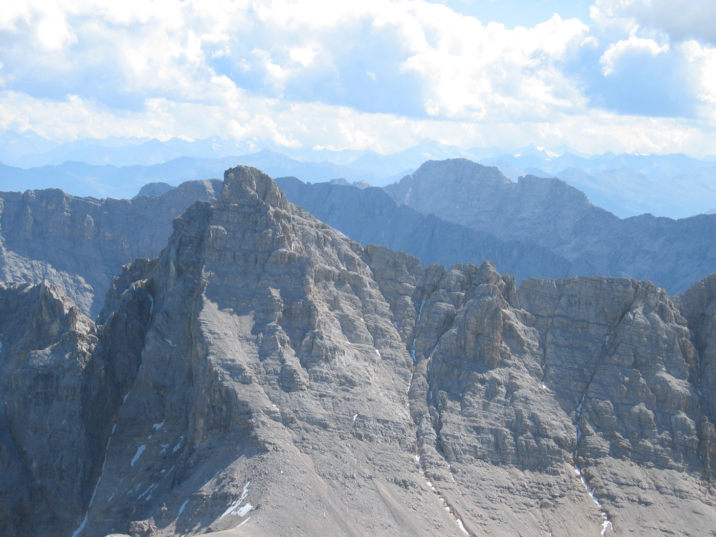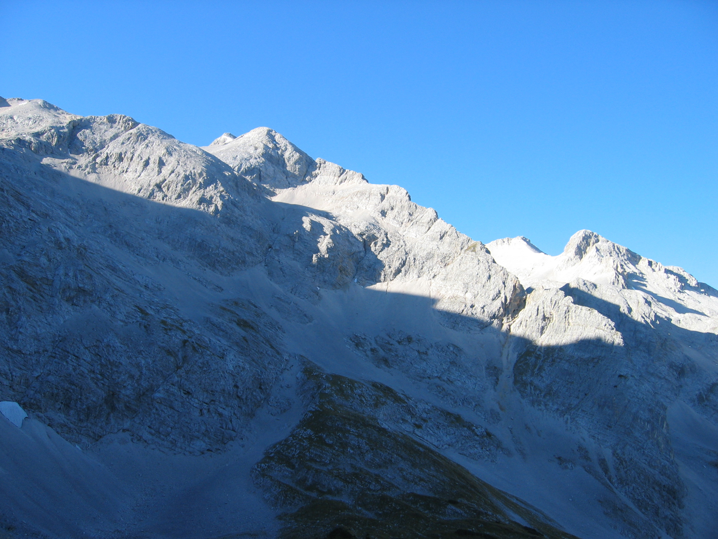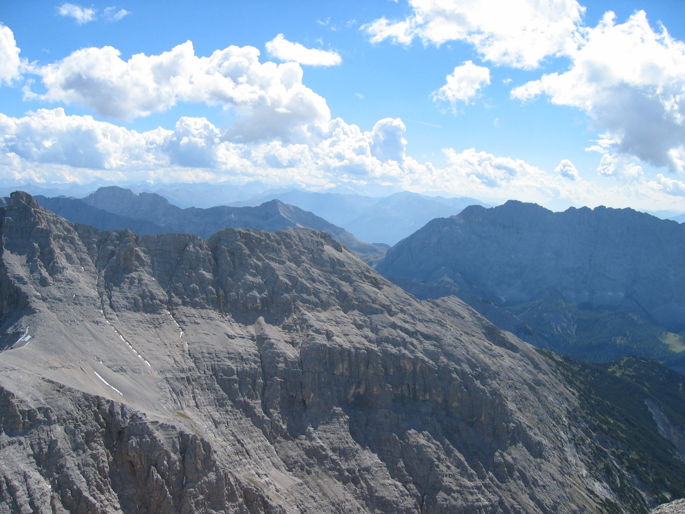 Beim weiteren Aufstieg geht es zunächst durch Latschengelände, später über weite Geröllfelder, die aber recht angenehm zu gehen sind. Gut drei Stunden nach meinem Aufbruch bin ich auf dem ersten Gipfel, der Westlichen Ödkarspitze. Bald darauf habe ich die Mittlere Ödkarspitze erreicht, wo die erste größere Pause fällig ist. Das Panorama ist überwältigend. Es folgt ein weiterer, ziemlich steiler Ab- und Aufstieg mit ein wenig Kraxelei, dann ist auch die Östliche Ödkarspitze geschafft. Über drahtseilgesicherte Felspassagen steige ich ab zum Schlauchkarsattel mit seiner winzigen Biwakhütte.