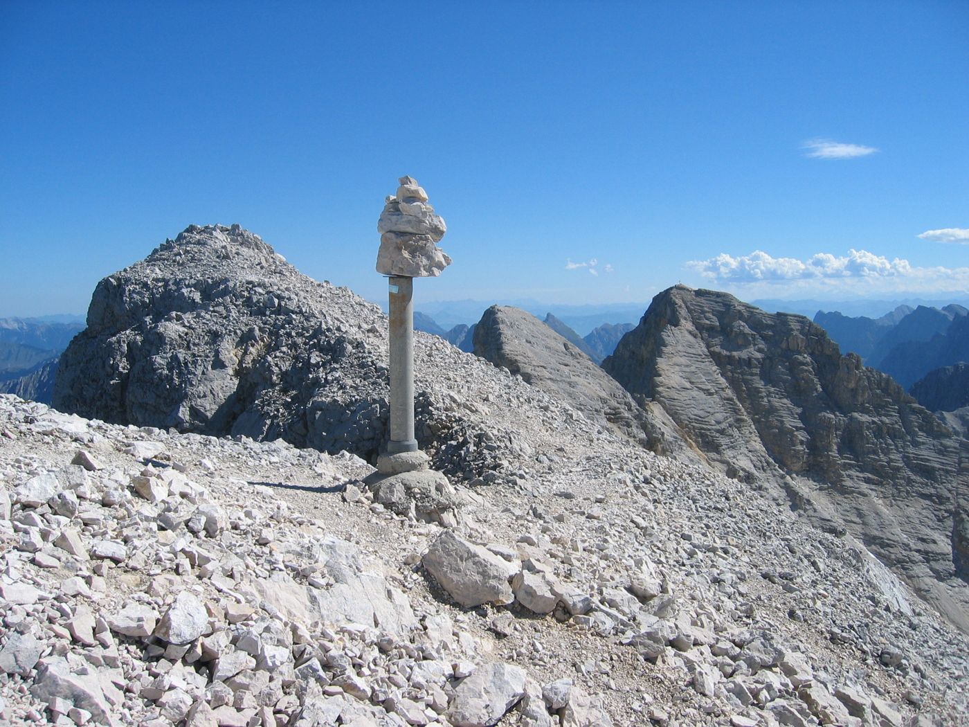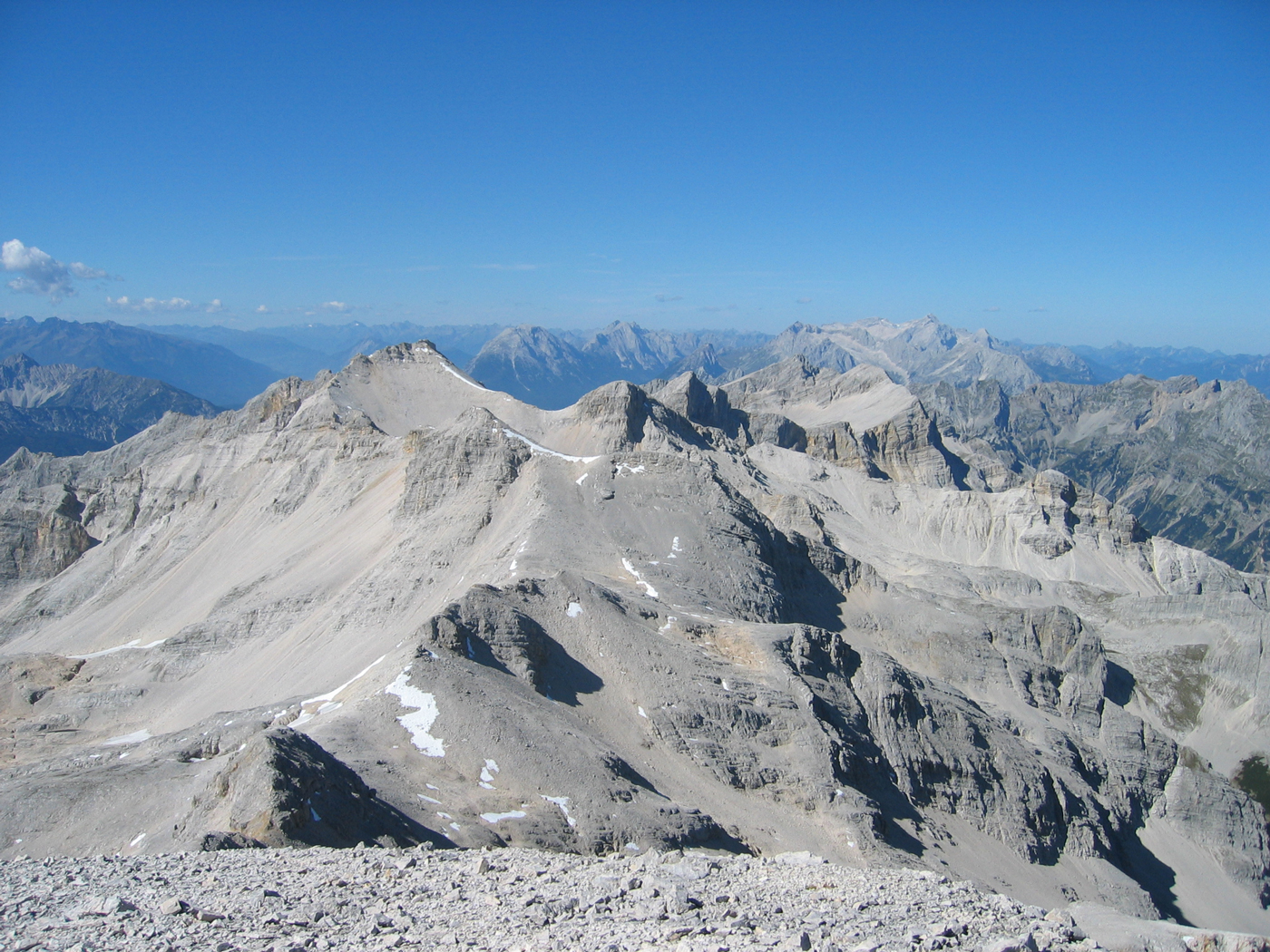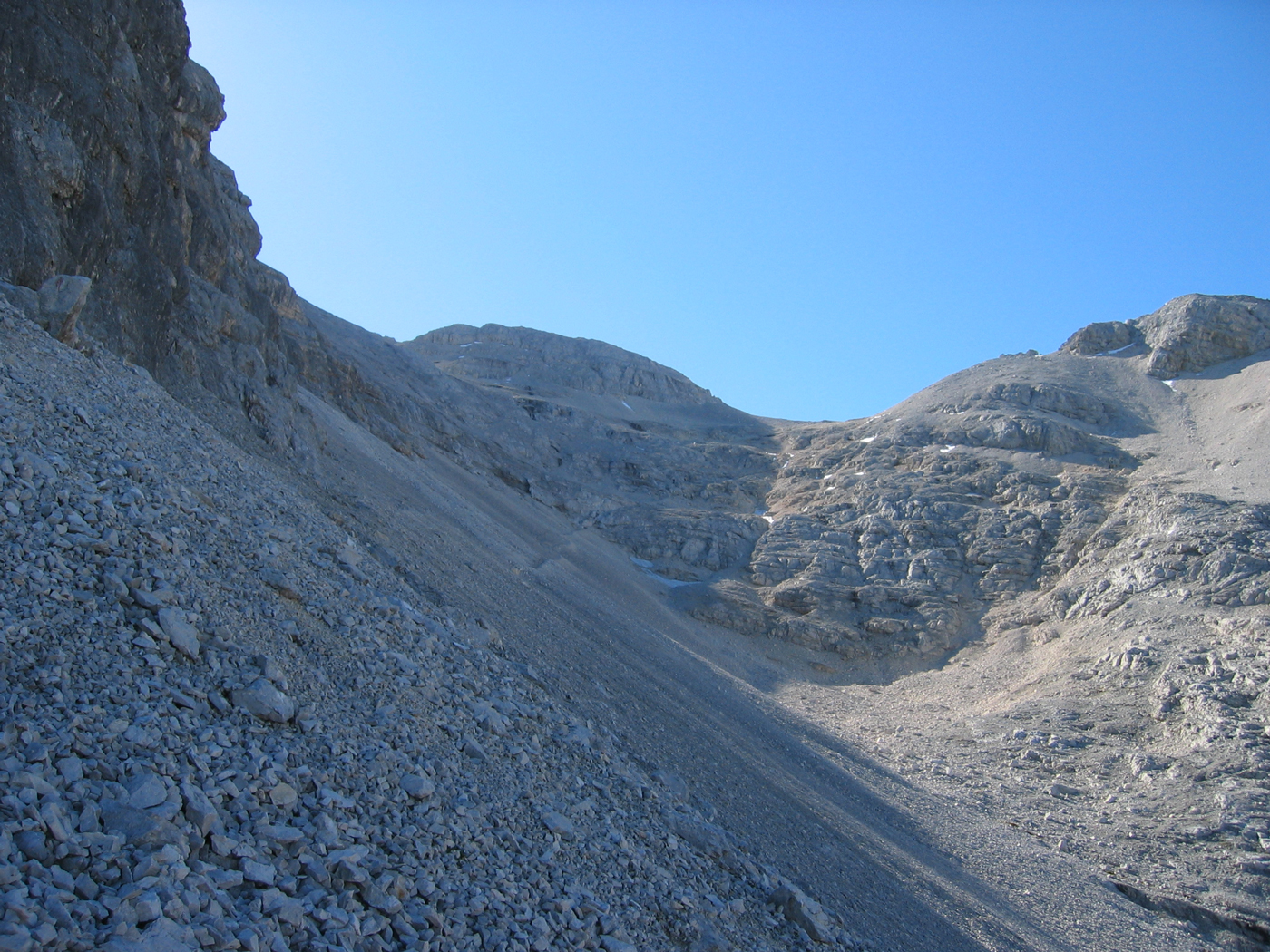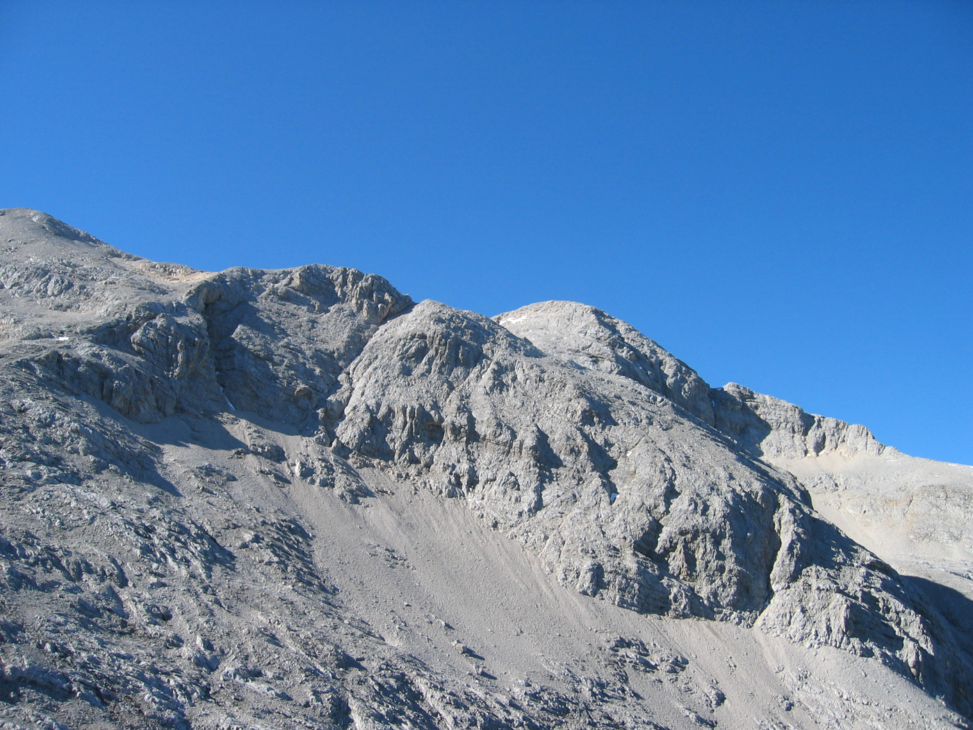 Der Schlauchkarsattel ist Ausgangspunkt für die Besteigung des höchsten Karwendelgipfels, der Birkkarspitze. Erfreulicherweise ist der übliche Hochbetrieb auf dem bröseligen Aufstiegsweg schon vorbei; den Gipfel habe ich ganz für mich allein. Nach ausgiebiger Pause kehre ich zum Schlauchkarsattel zurück. Über die weiten Geröllfelder des Schlauchkars, das seinen Namen bekanntlicherweise nicht ganz zu Unrecht trägt, komme ich wieder zur Abzweigung von heute morgen, und bald darauf zum Karwendelhaus.