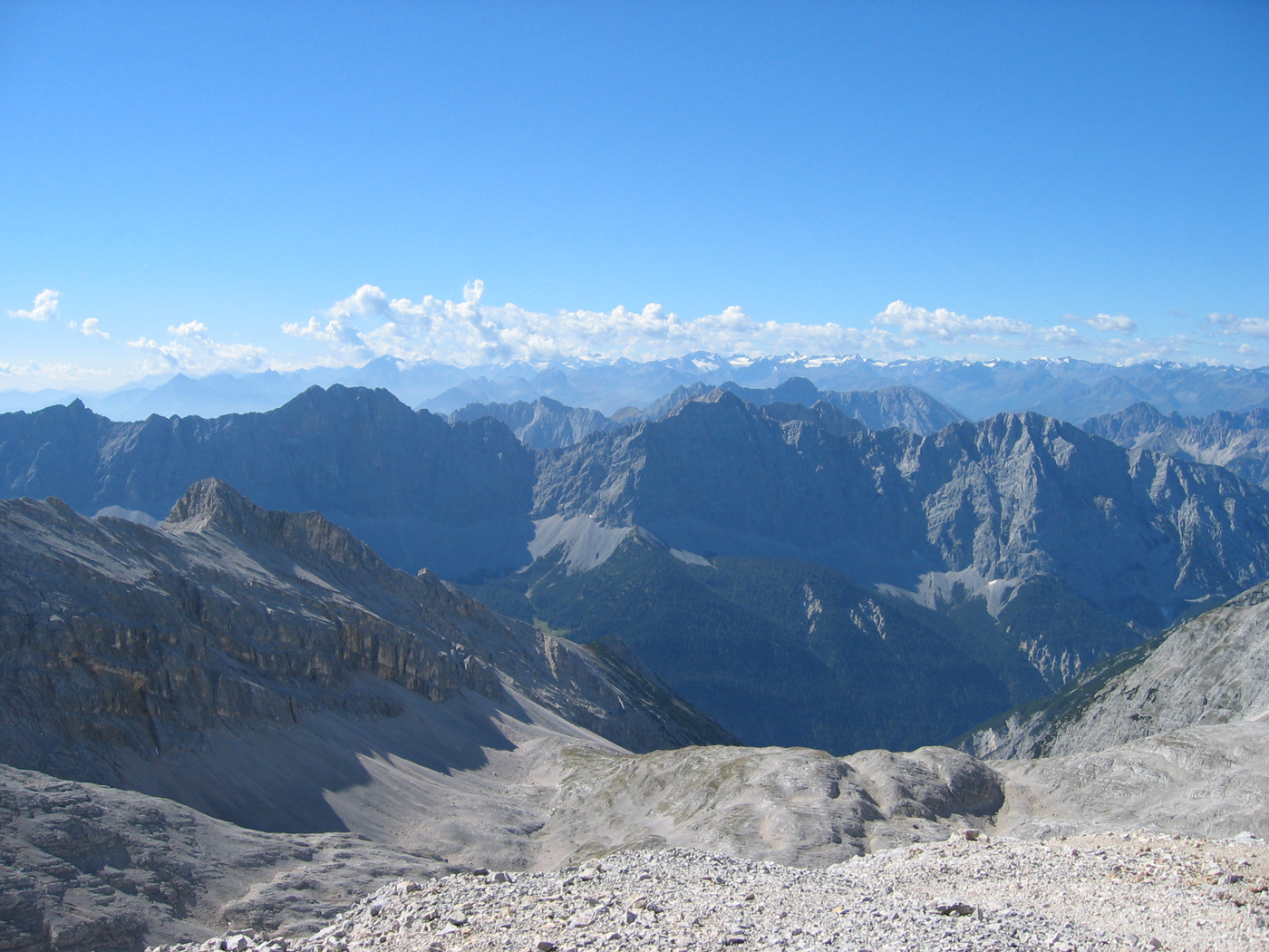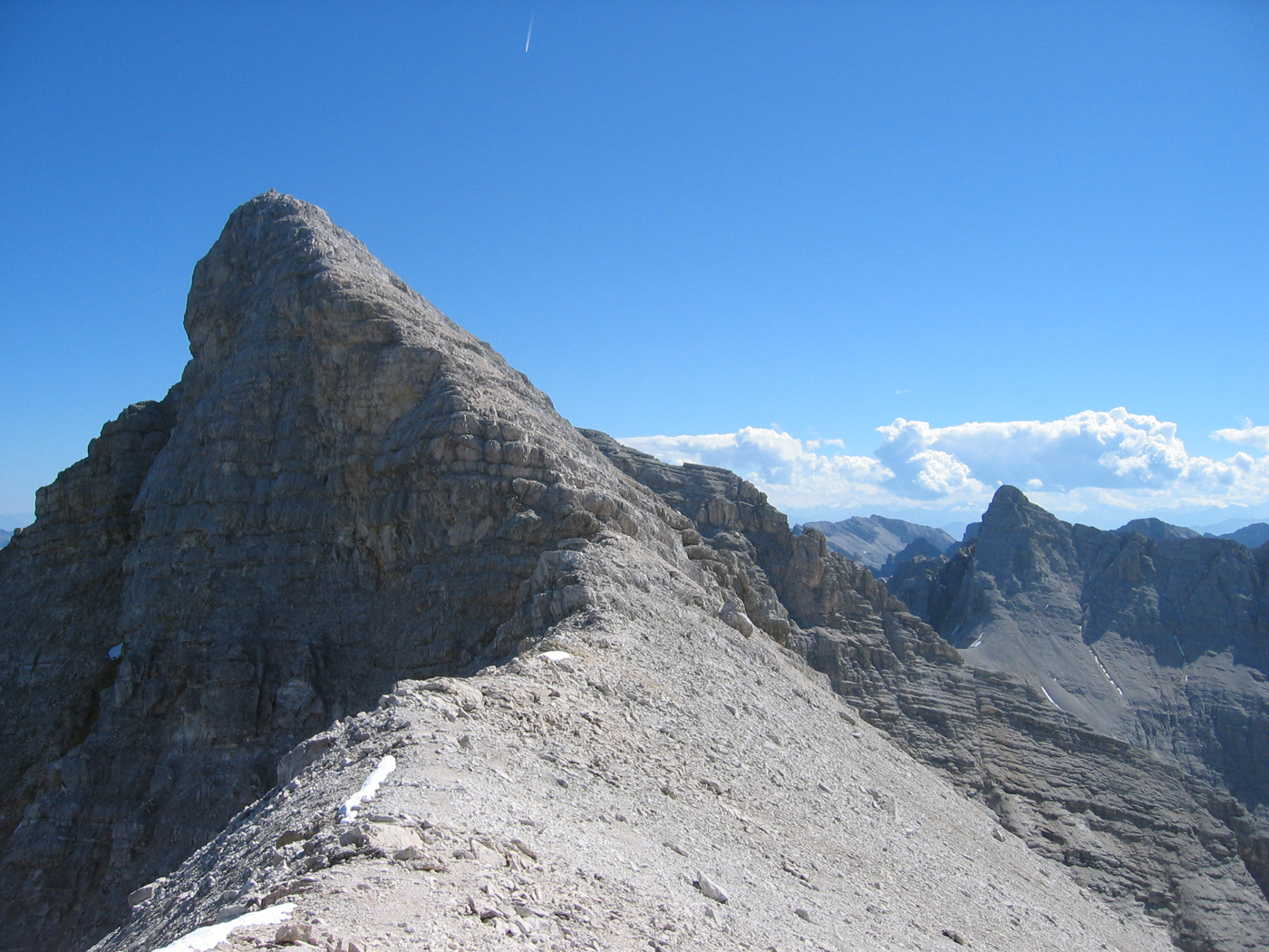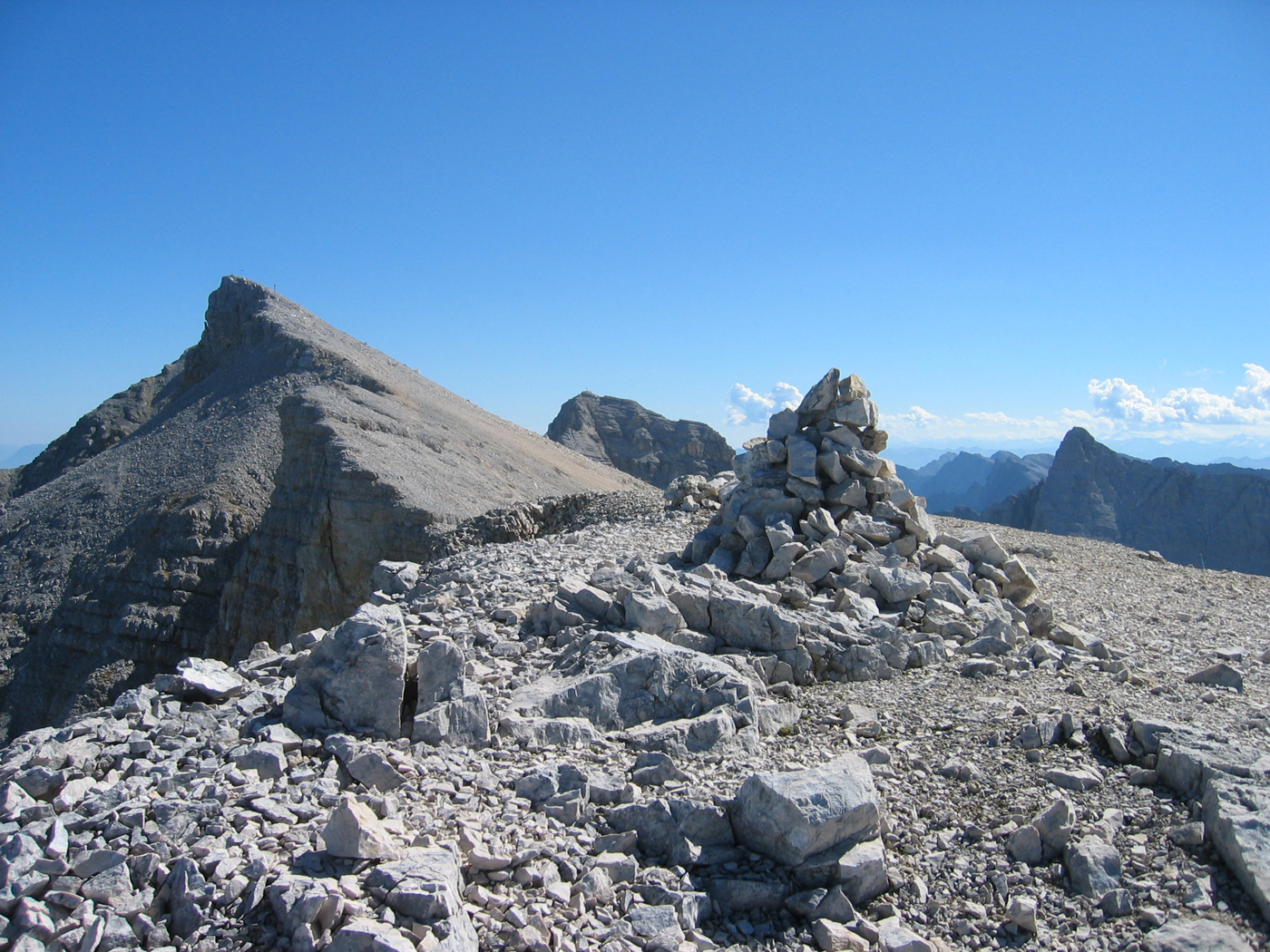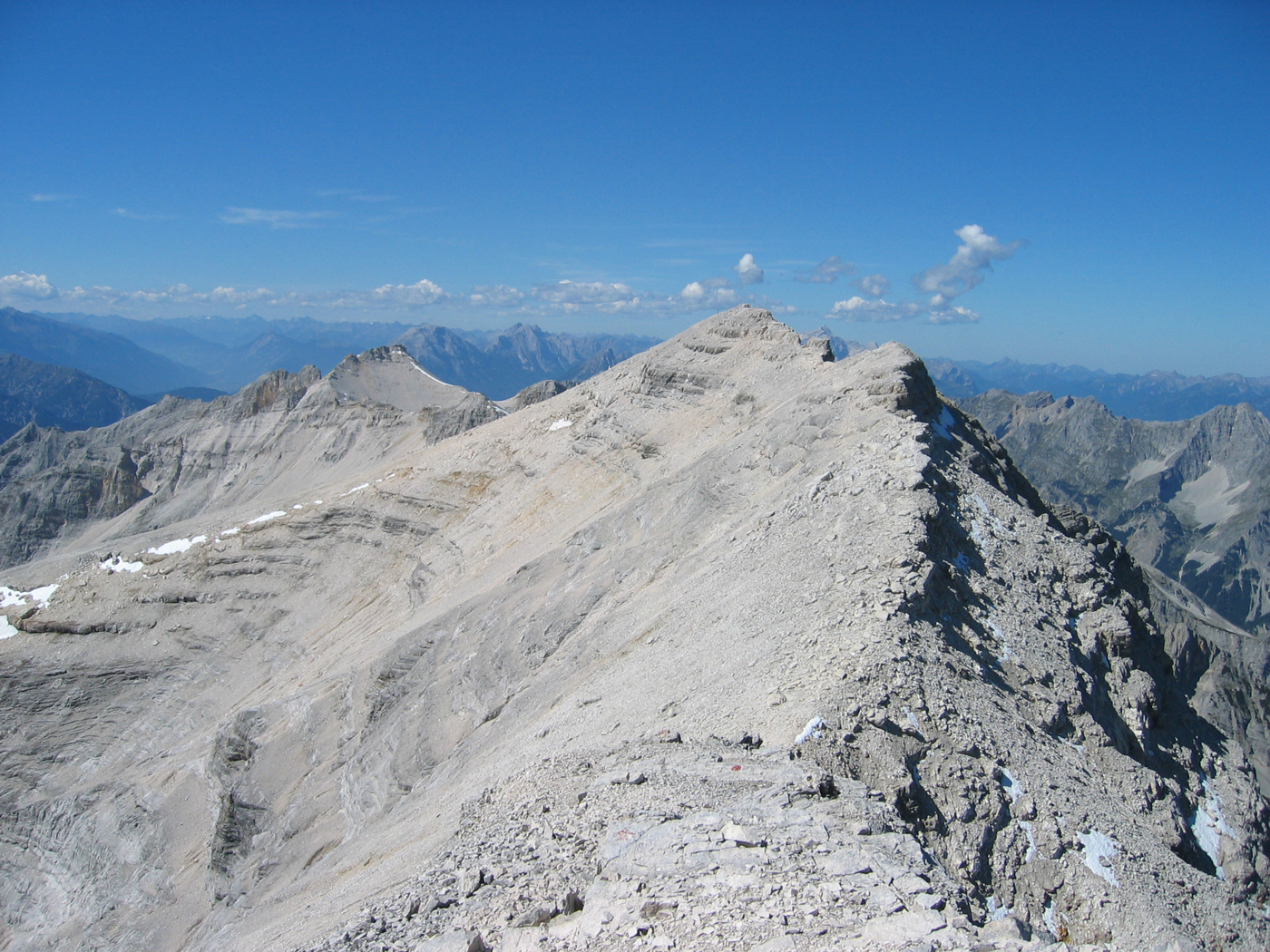 Der Schlauchkarsattel ist Ausgangspunkt für die Besteigung des höchsten Karwendelgipfels, der Birkkarspitze. Erfreulicherweise ist der übliche Hochbetrieb auf dem bröseligen Aufstiegsweg schon vorbei; den Gipfel habe ich ganz für mich allein. Nach ausgiebiger Pause kehre ich zum Schlauchkarsattel zurück. Über die weiten Geröllfelder des Schlauchkars, das seinen Namen bekanntlicherweise nicht ganz zu Unrecht trägt, komme ich wieder zur Abzweigung von heute morgen, und bald darauf zum Karwendelhaus.