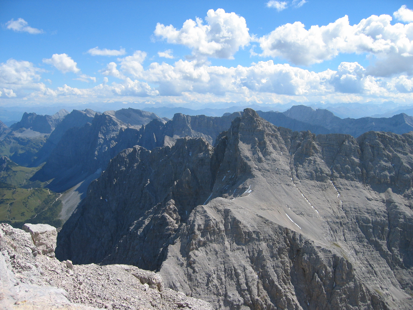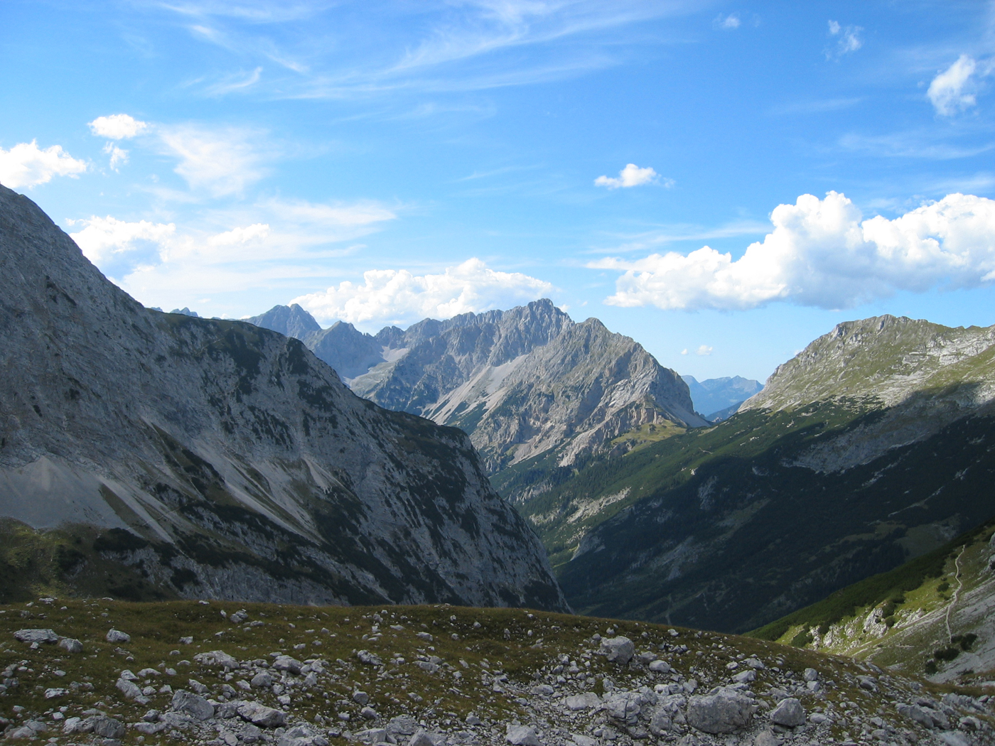 Die heutige Tour kenne ich im Wesentlichen schon von 1987. Damals (lang ist's her!) baute ich die Überschreitung der höchsten Karwendelgipfel in meine Nord-Süd-Durchquerung der Alpen ein und war begeistert. Diese Tour möchte ich auf jeden Fall wiederholen. Gleich hinter dem Karwendelhaus geht es steil hoch, aber bald wird der Wanderweg wieder zahmer. Unter dem Hochalmkreuz biege ich nach rechts ab und erreiche mit etwas Höhenverlust die Nördliche Ödkarscharte. Hier deponiere ich den Rucksack, um die Schlüsselstelle des für morgen geplanten Übergangs zur Pleisenhütte zu erkunden. Es handelt sich um einen Abstieg von etwa 100 Höhenmetern durch grasdurchsetzte Schrofen, mit Drahtseilen, deren Verankerungen nicht viel Vertrauen erwecken. Trotzdem komme ich gut mit dieser Passage zurecht; bald bin ich wieder oben am Sattel.
