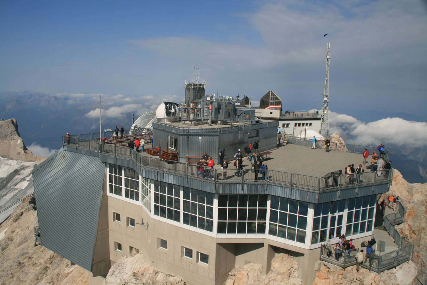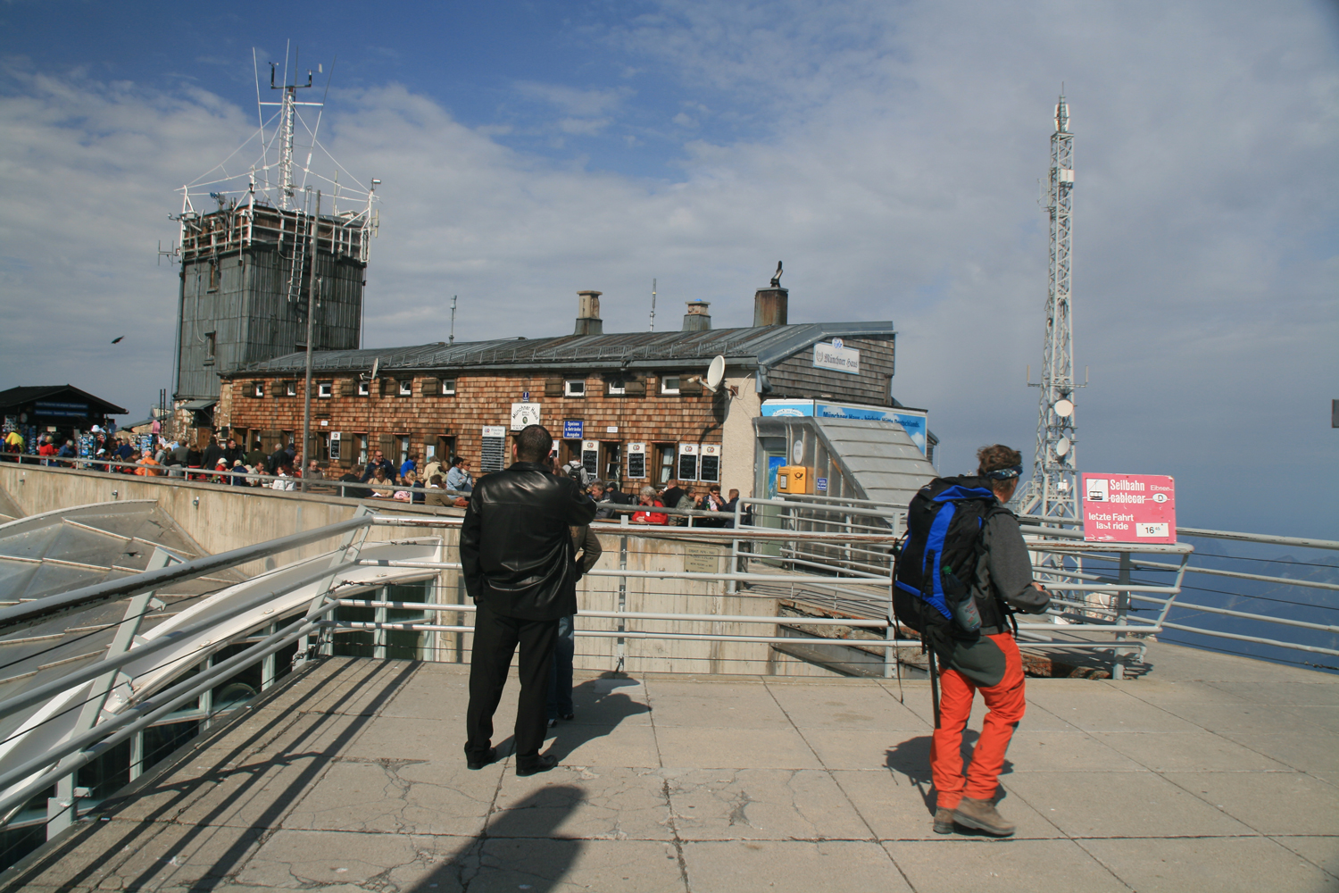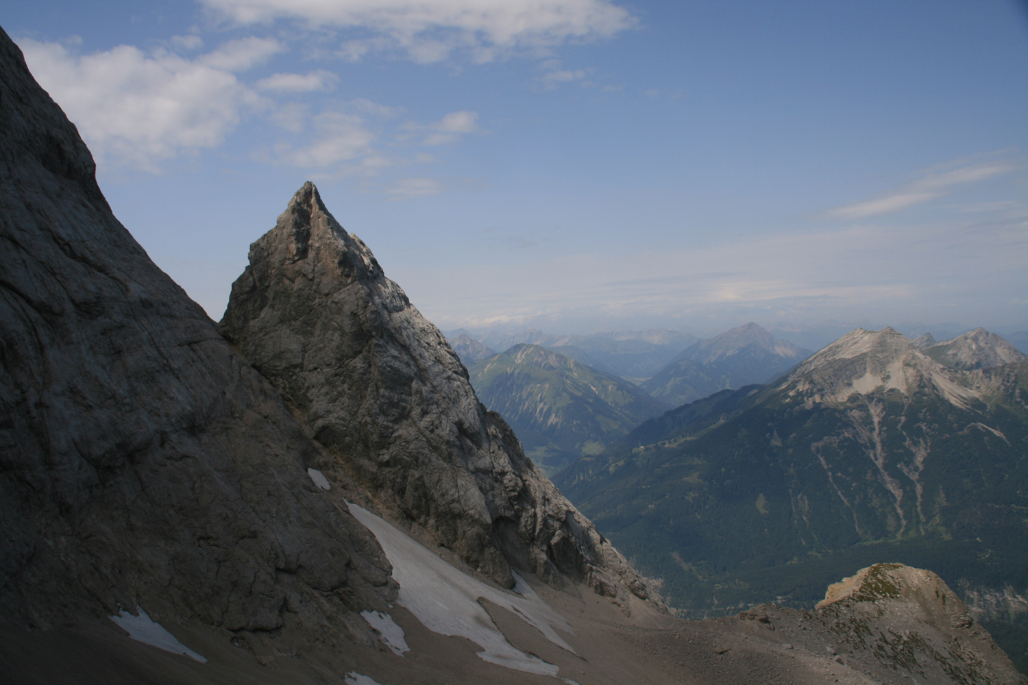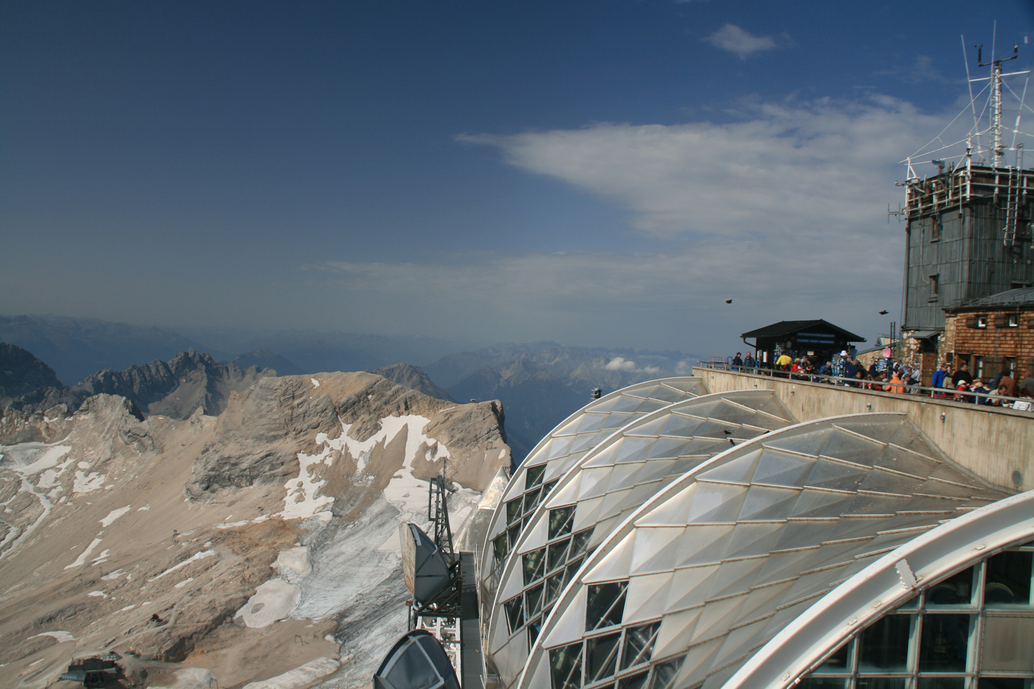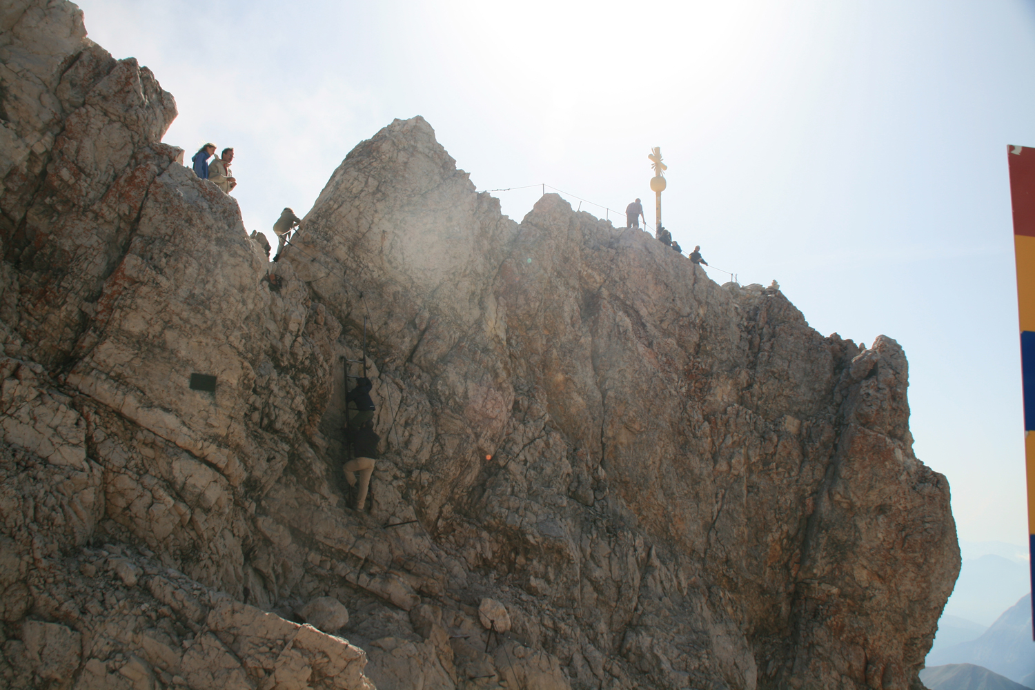 Die Zugspitze und den Betrieb, der auf ihrem Gipfelplateau herrscht, kenne ich von mehreren früheren Touren. Der Aufstieg von der Knorrhütte ist mir allerdings noch neu. Im ersten Teil ist der Weg sehr angenehm zu gehen, erst nach dem Sonn-Alpin wird es wegen des steilen Geröllfelds mühsam. Die leichten, teilweise gesicherten Kletterstellen machen keine Probleme, und bald betreten wir den betonierten Teil des Zugspitzgipfels. Der kurze Aufstieg zum Gipfelkreuz auf dem Ostgipfel erfordert vor allem Schnelligkeit. Wenn die kurze, ziemlich senkrechte Eisenleiter einmal frei wird, sollte man keine Sekunde zögern, sonst ist sie gleich wieder vom Gegenverkehr blockiert. Aber wir sind dieser Herausforderung gewachsen, der höchste Punkt von Deutschland ist erreicht.