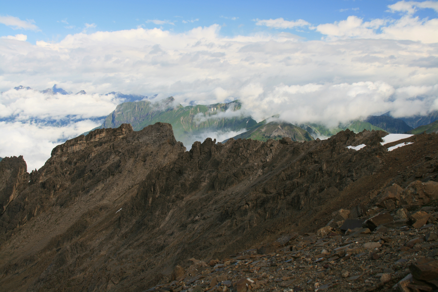 Überraschenderweise hat das Wetter in der Nacht umgeschlagen. Trotz des Regens verlasse ich die Muttekopfhütte und mache mich auf den Weg zur Muttekopfscharte. So viele Alpensalamander wie heute habe ich wohl noch nicht an einem Tag gesehen! Der Weg, den ich schon von früher kenne, macht im ersten Teil keine Probleme; erst kurz vor der Scharte ist ein wenig Kraxelei mit Drahtseilsicherungen angesagt. Gerade, als ich an der Muttekopfscharte ankomme, reißen die Wolken zumindest ein wenig auf. Auf diese Weise sind vom Muttekopf-Gipfel wenigstens einige Nachbarberge zu sehen.