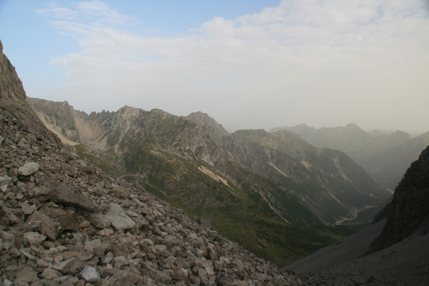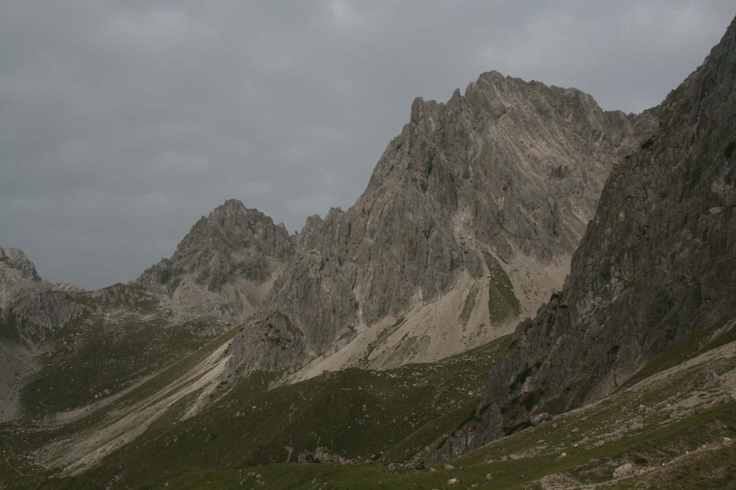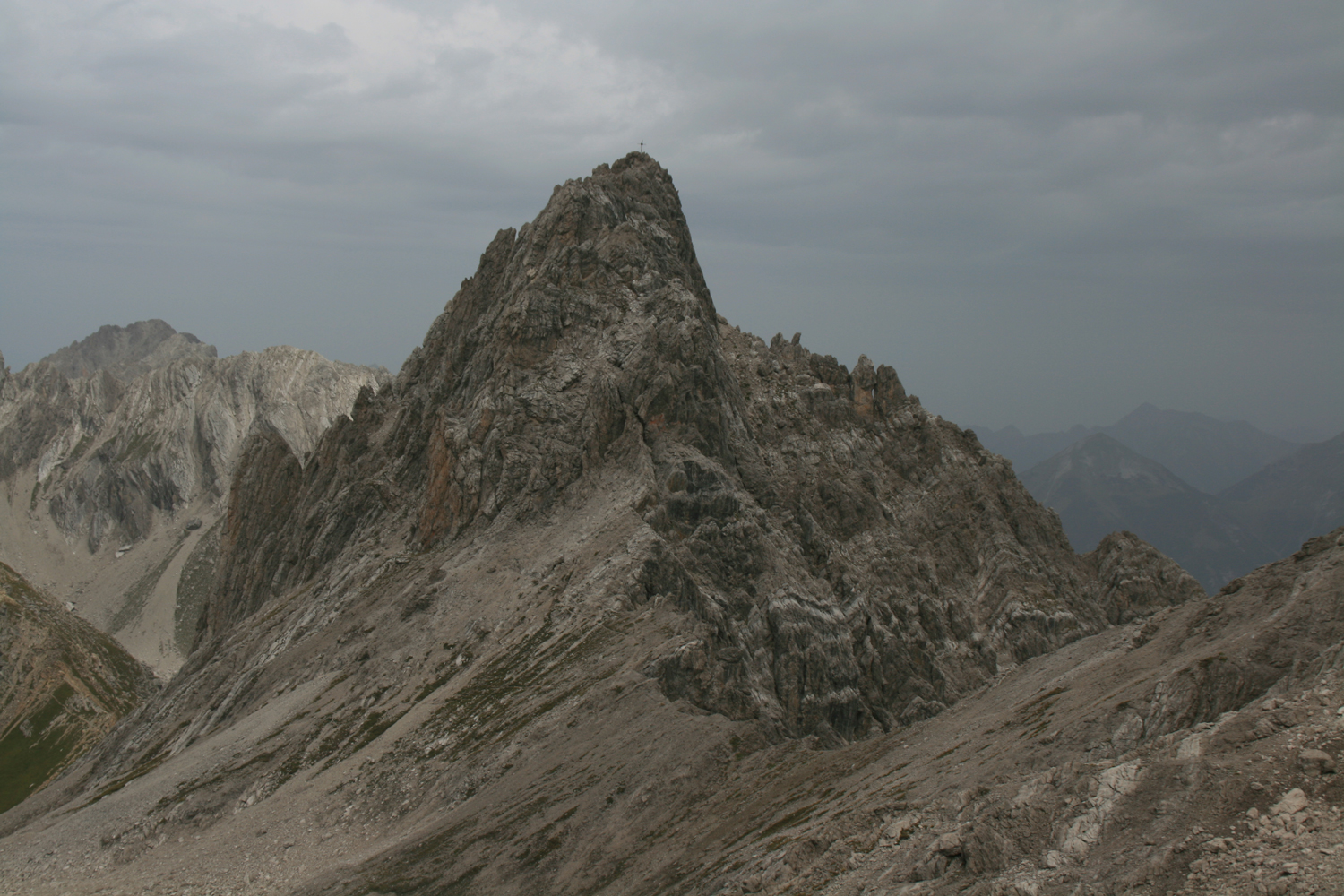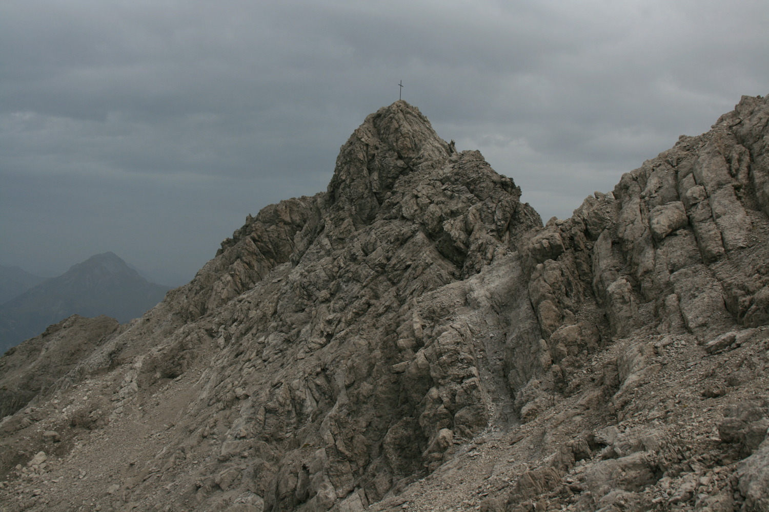 Da ich mich noch nicht ausgelastet fühle, breche ich bald wieder auf, mit leichtem Gepäck, um auf die Steinkarspitze zu steigen. Ein nicht allzu schwieriger Klettersteig (B bis C in der fünfteiligen Skala) führt durch die Ostflanke des Berges. Die Kraxelei (mit Klettersteig-Set) macht großen Spaß. Knapp unterhalb des Gipfels endet der Klettersteig, die letzten Meter (ein wenig ausgesetzt) sind ohne Sicherung zurückzulegen.