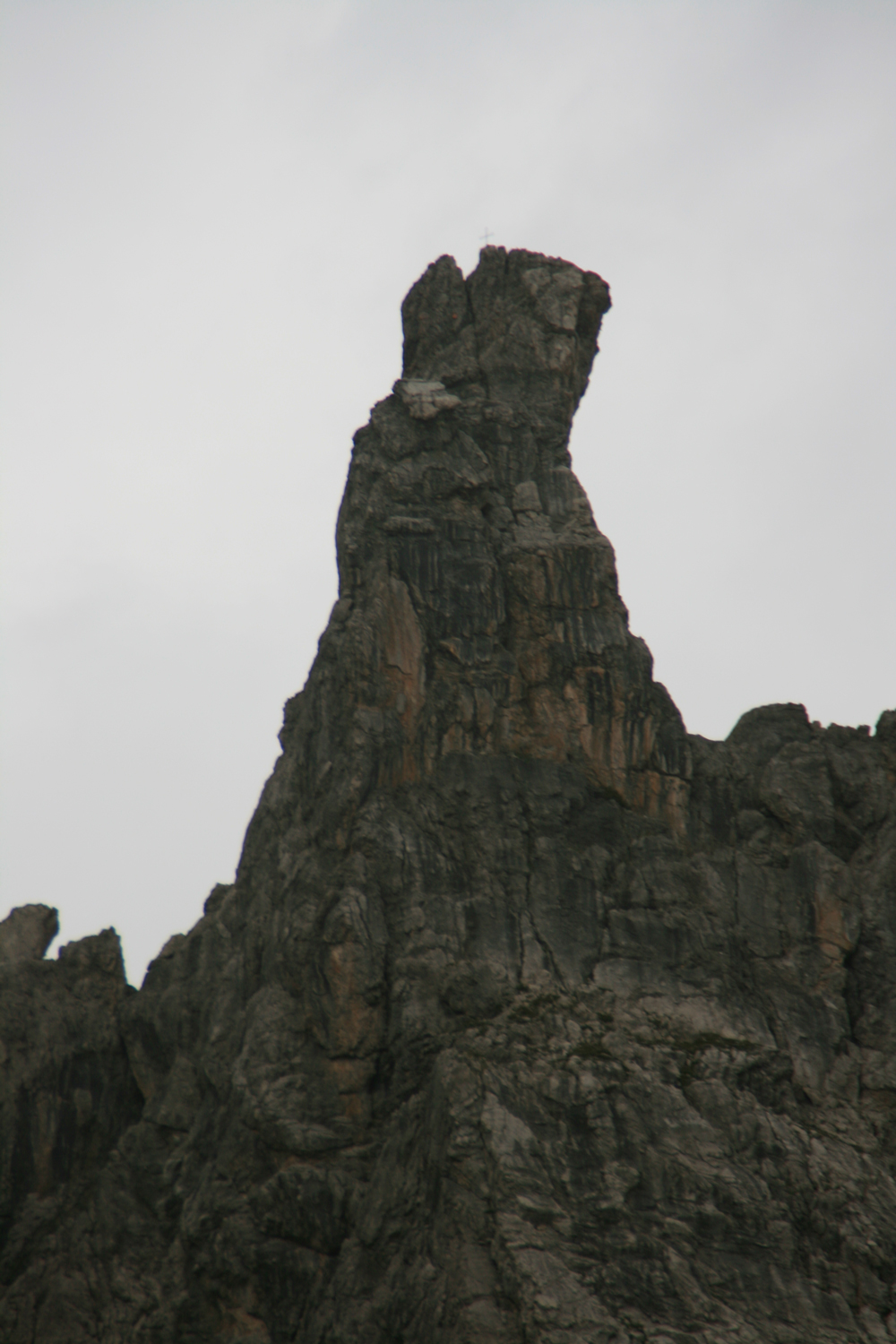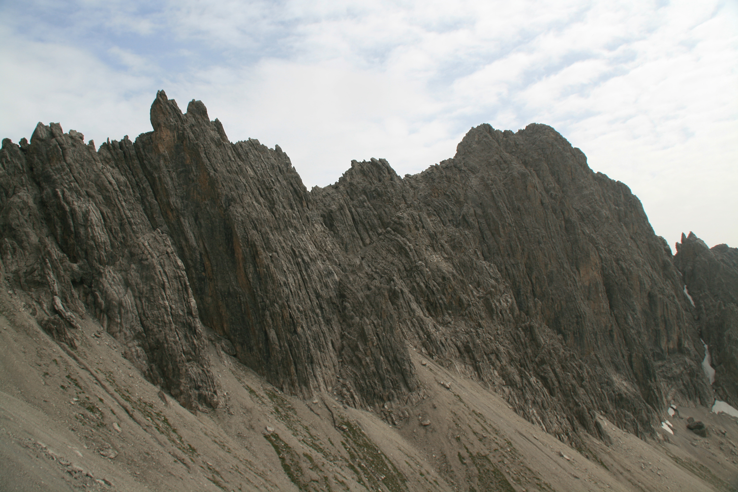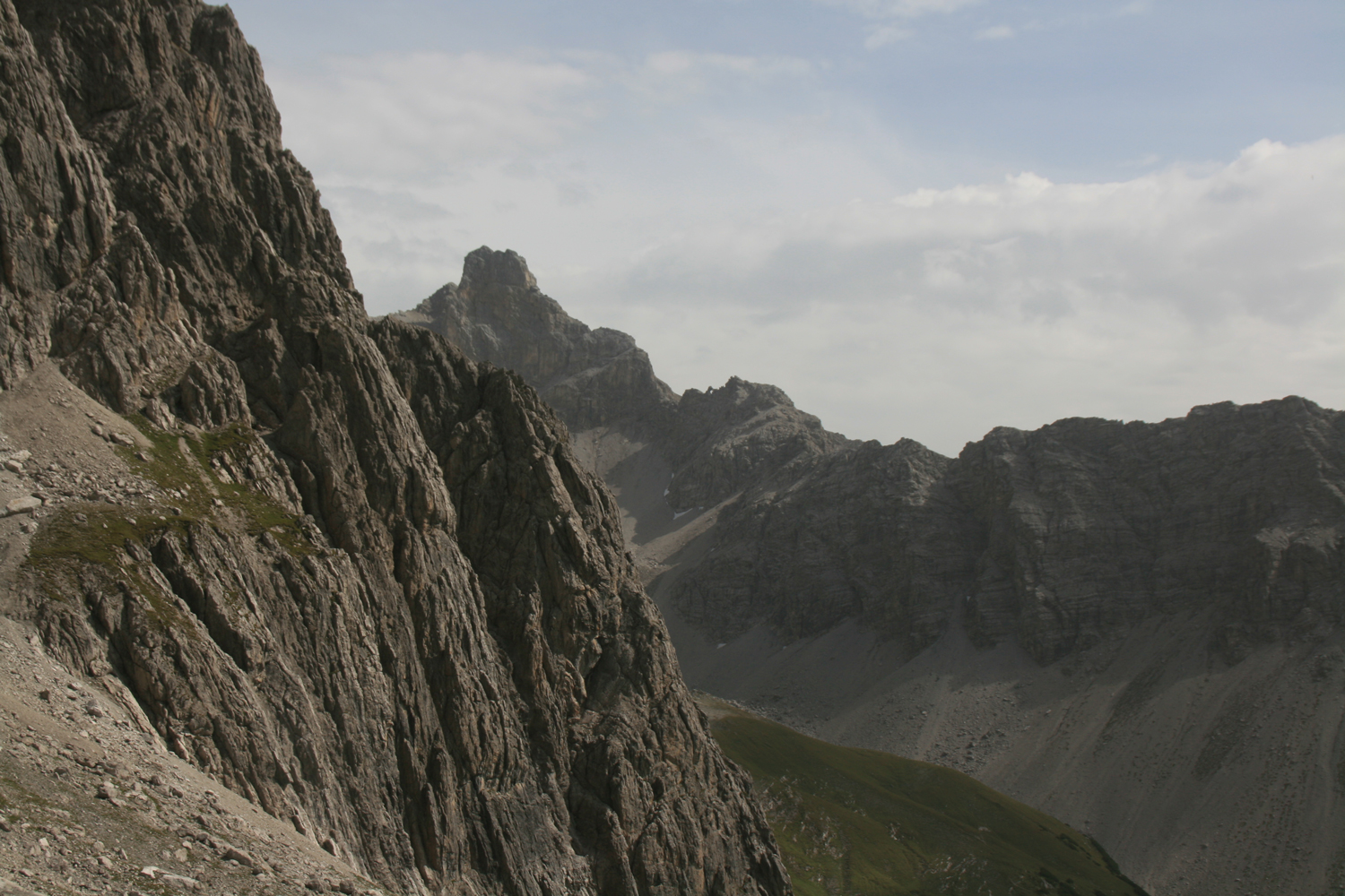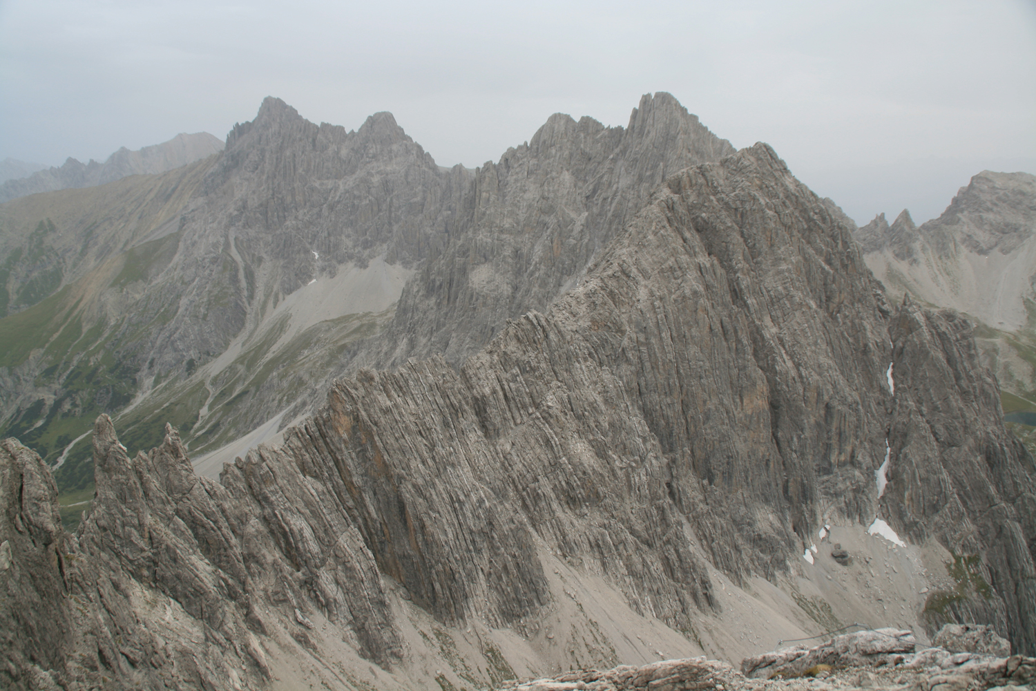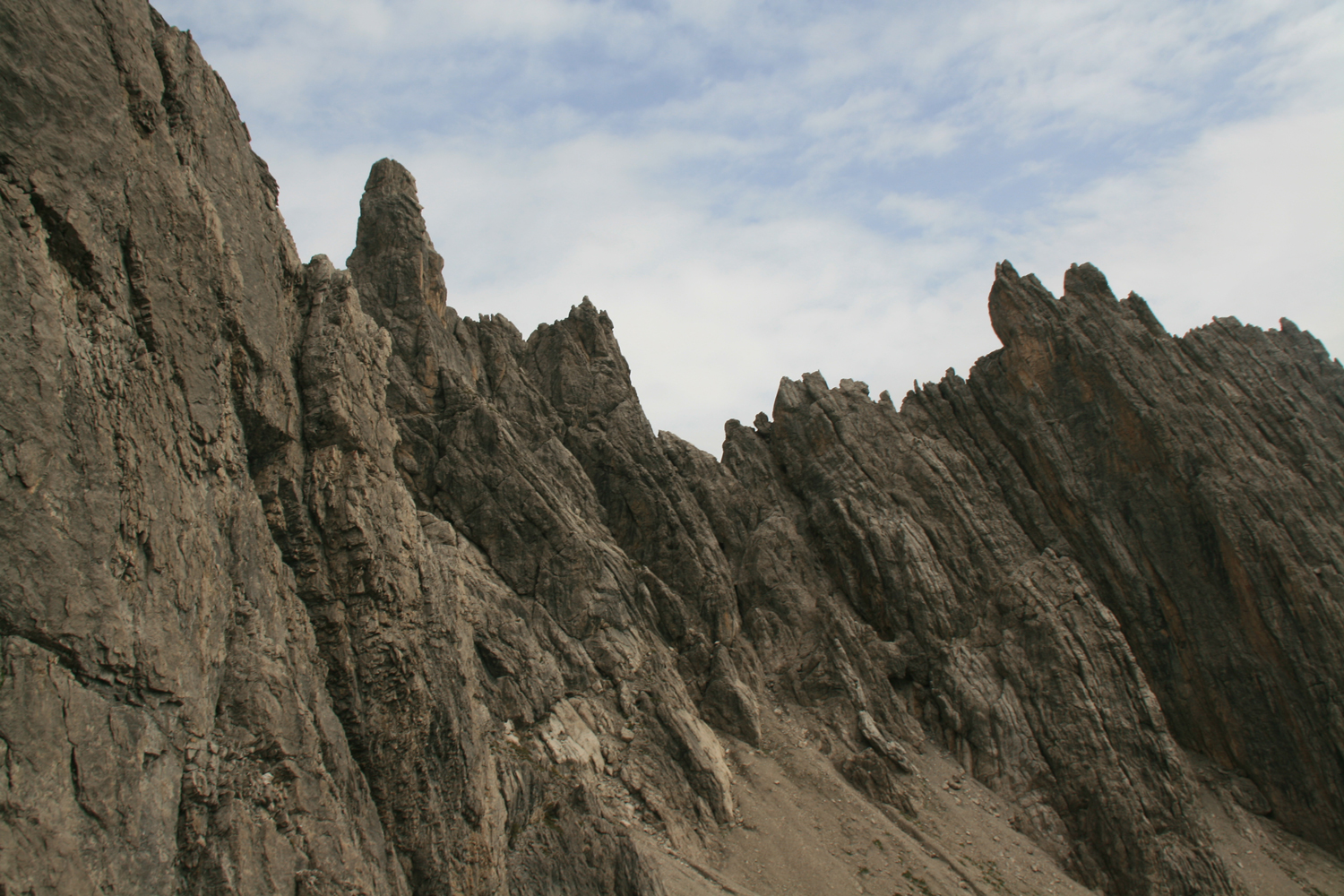 Da ich mich noch nicht ausgelastet fühle, breche ich bald wieder auf, mit leichtem Gepäck, um auf die Steinkarspitze zu steigen. Ein nicht allzu schwieriger Klettersteig (B bis C in der fünfteiligen Skala) führt durch die Ostflanke des Berges. Die Kraxelei (mit Klettersteig-Set) macht großen Spaß. Knapp unterhalb des Gipfels endet der Klettersteig, die letzten Meter (ein wenig ausgesetzt) sind ohne Sicherung zurückzulegen.