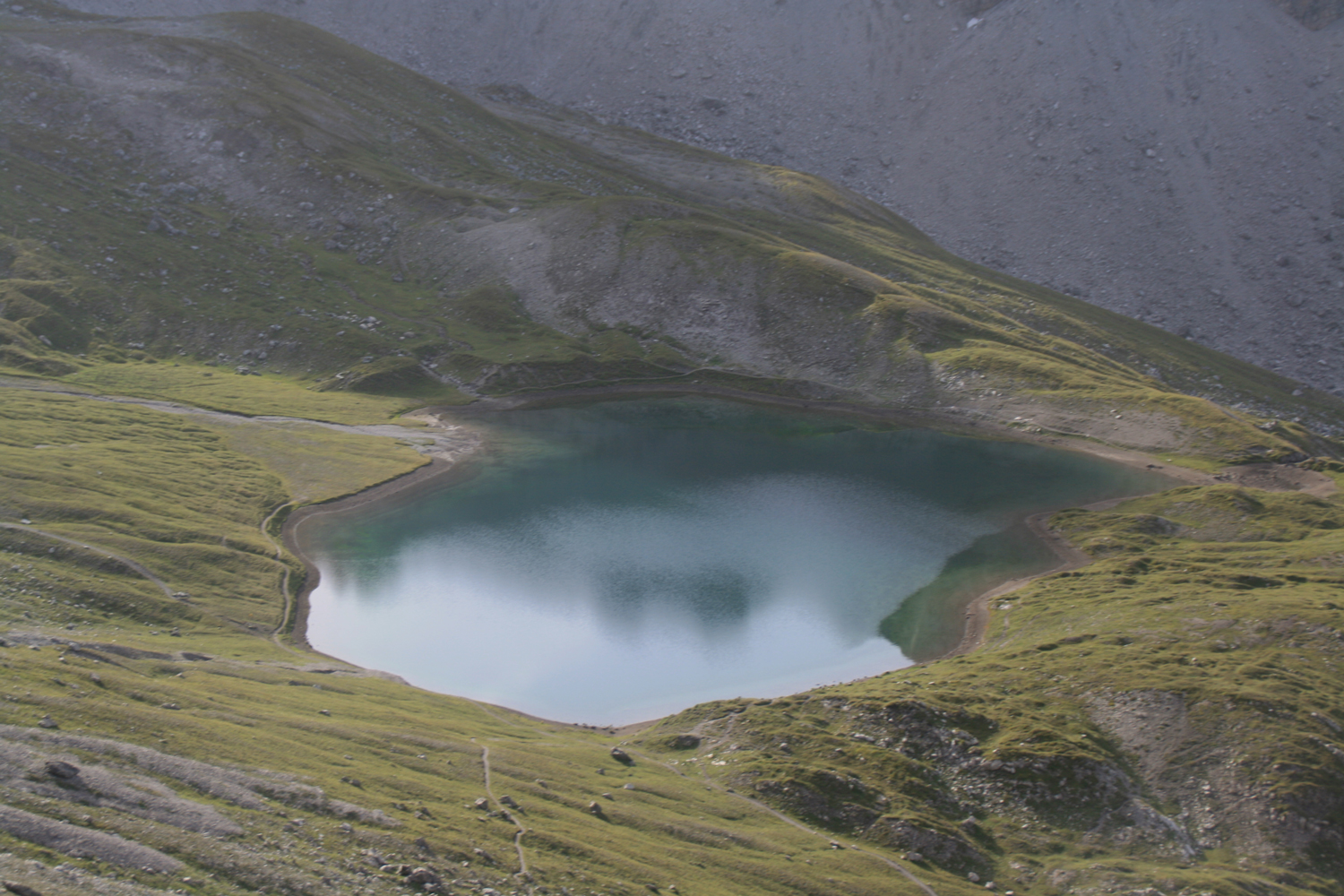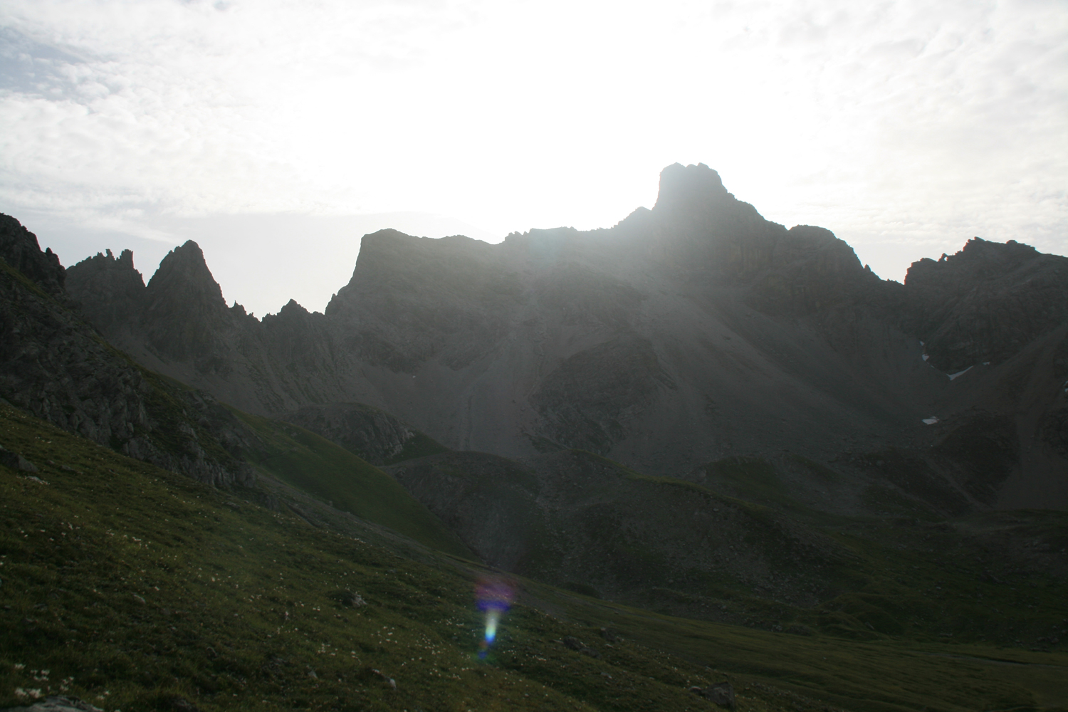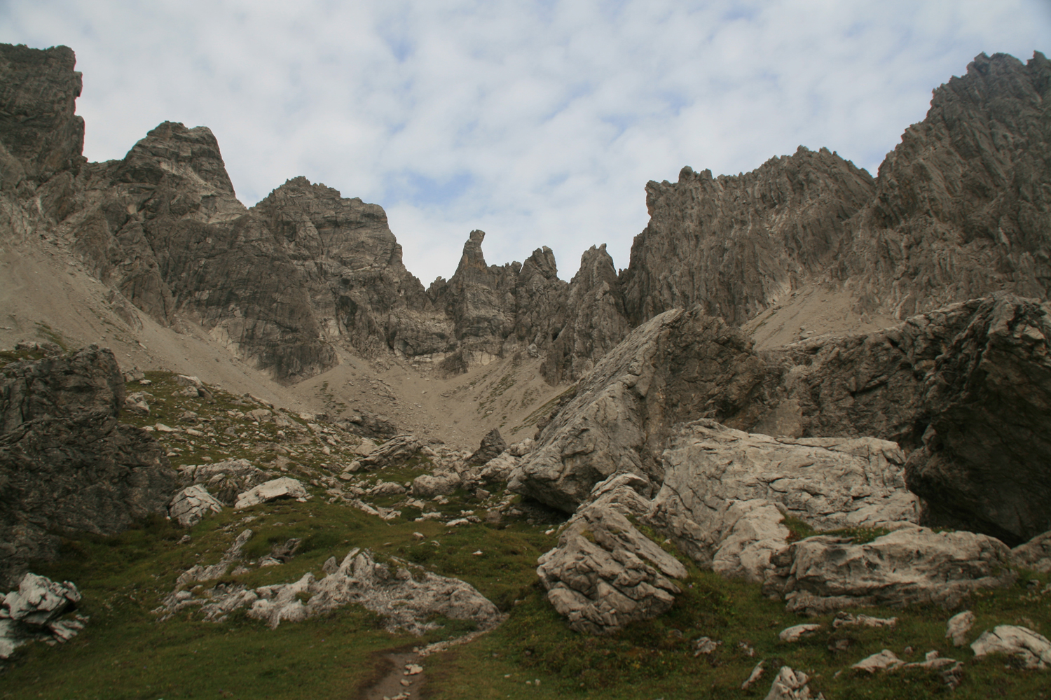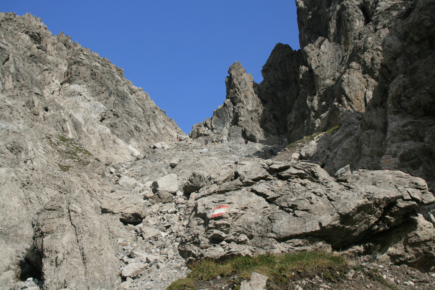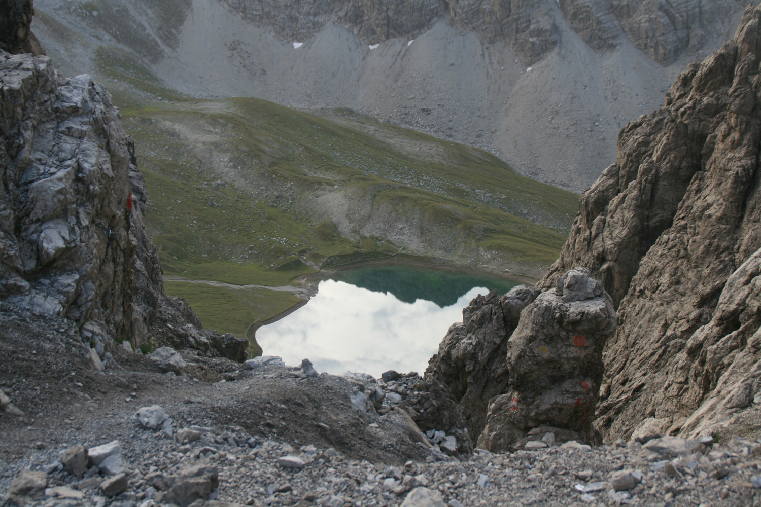 Der Abstieg erfolgt zunächst in nördlicher Richtung, in die Scharte vor den Parzinntürmen. Von hier geht es durch eine steile, ziemlich steinschlaggefährdete Rinne hinunter ins Kar. Hier fühle ich mich nicht besonders wohl, da ich leichtsinnigerweise ohne Helm unterwegs bin. Zum Glück ist niemand sonst unterwegs, und bald ist die kritische Passage geschafft. Über den einfachen Wanderweg kehre ich zur Steinseehütte zurück.