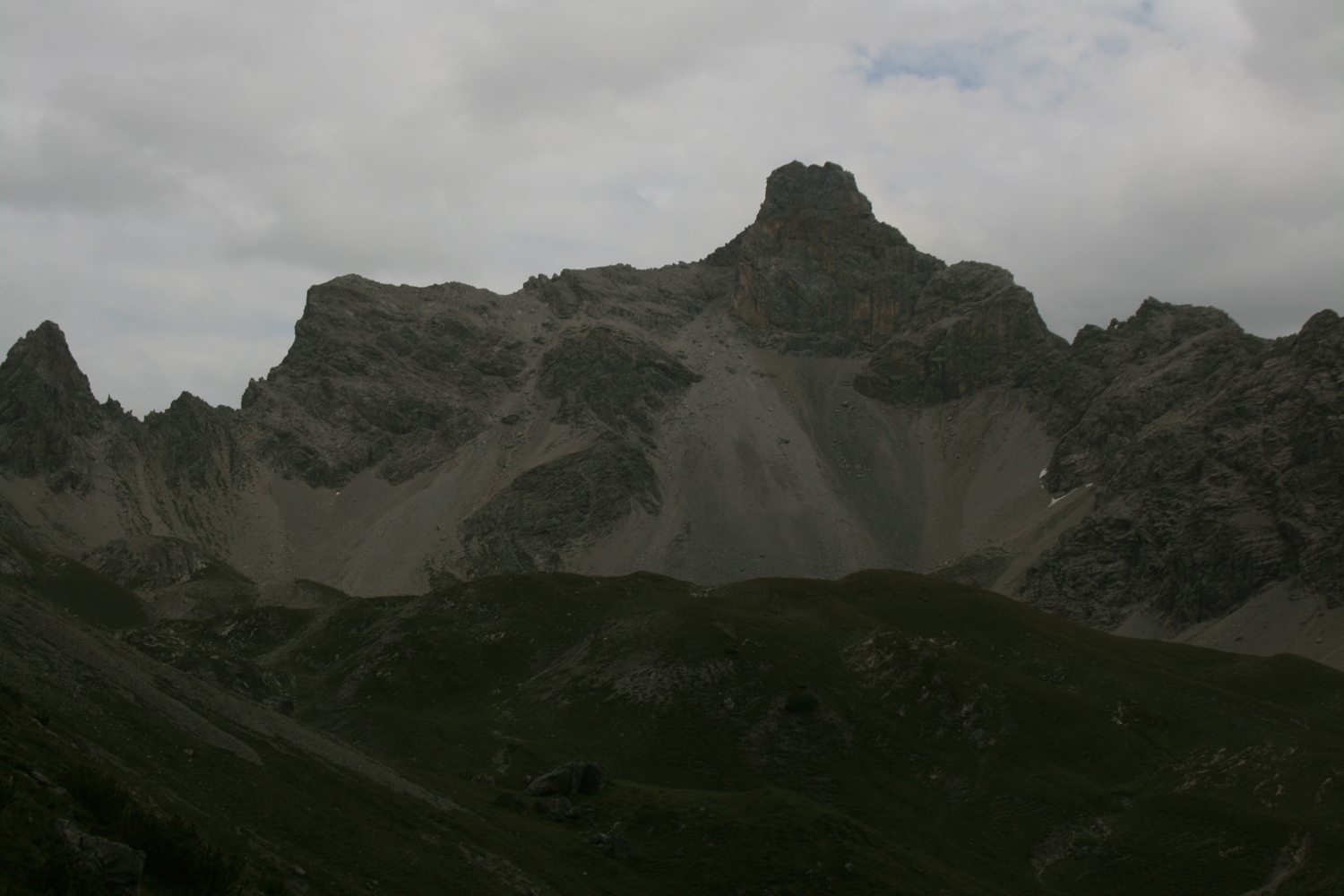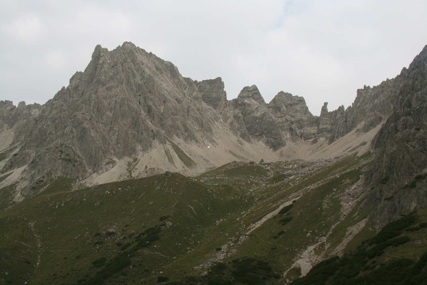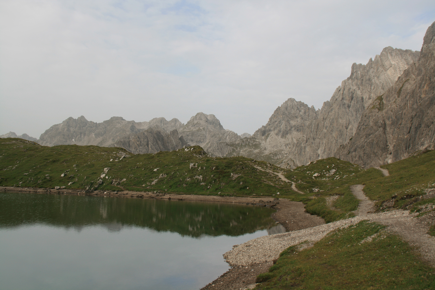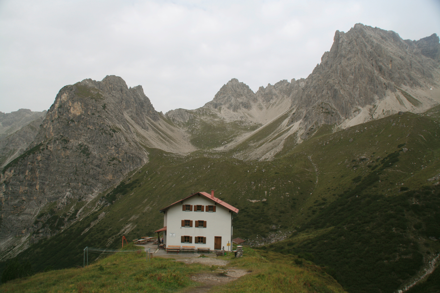 Auch am zweiten Tag meiner dreitägigen Wanderung durch die Lechtaler Alpen ist das Wetter im Prinzip recht freundlich. Allerdings gibt es einen Wolkenschleier, den die Sonnenstrahlen kaum durchdringen. Ich breche von der Hanauer Hütte auf, um über die Vordere (Westliche) Dremelscharte auf die andere Seite des Lechtaler Hauptkamms zu gelangen. Zuerst geht es durch Gras- und Latschengelände, später immer mehr durch Geröll, das aber nicht besonders mühsam zu begehen ist. Nach eineinhalb Stunden ist die Scharte erreicht, wo ein steiler Abstieg in Richtung Steinsee beginnt. Das lose Geröll erfordert vorsichtiges Gehen, an einigen Stellen helfen Drahtseil-Sicherungen. Allmählich wird der Steig flacher, die Wegverzweigung am Steinsee ist nicht mehr weit. Der See leuchtet nicht so blau, wie ich ihn kenne, sondern zeigt sich heute eher in Grau. Daher fällt der Verzicht auf das mögliche Badevergnügen (bei vielleicht 10°C) nicht besonders schwer. Knapp drei Stunden nach dem Aufbruch komme ich an der wunderschön gelegenen Steinseehütte an.