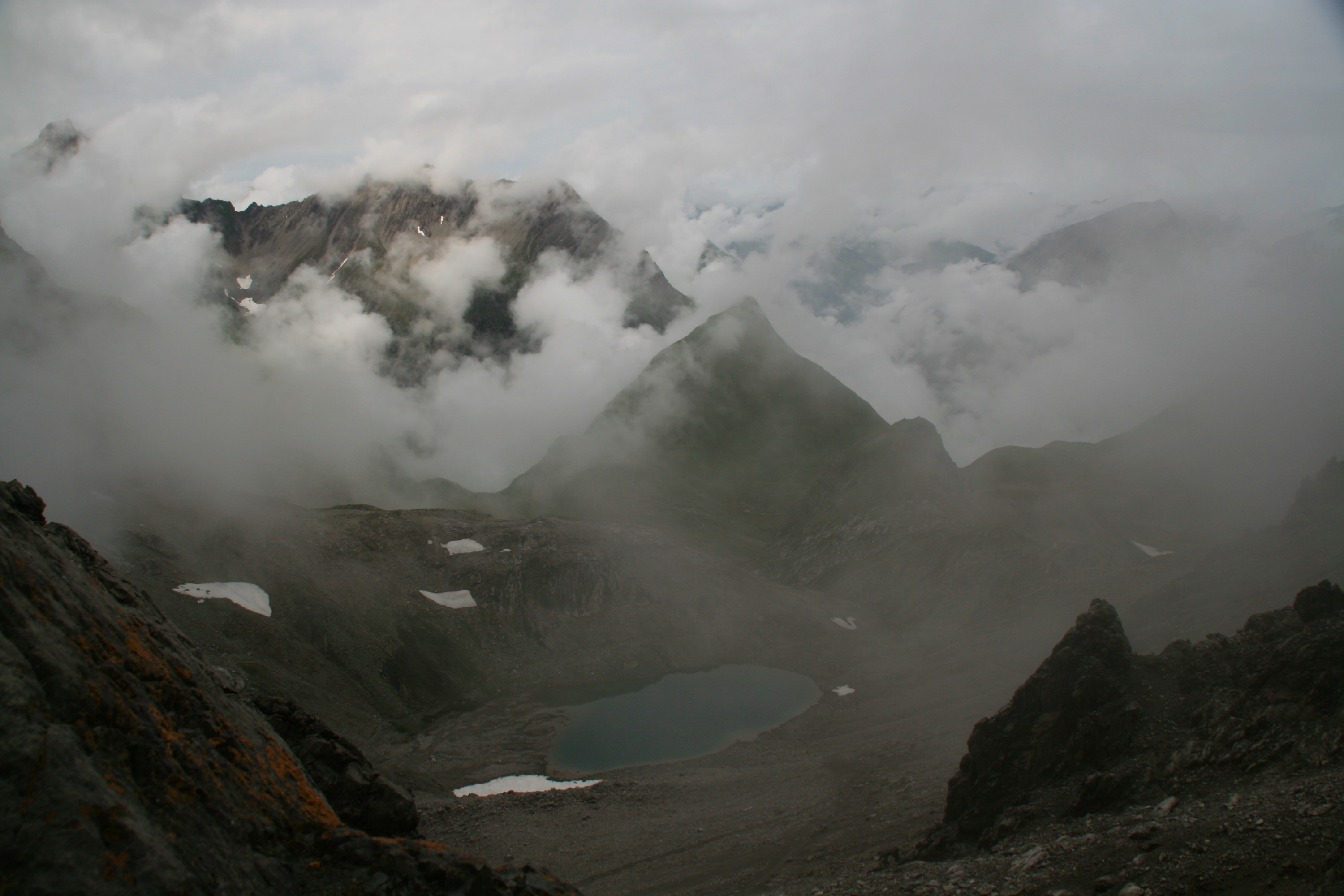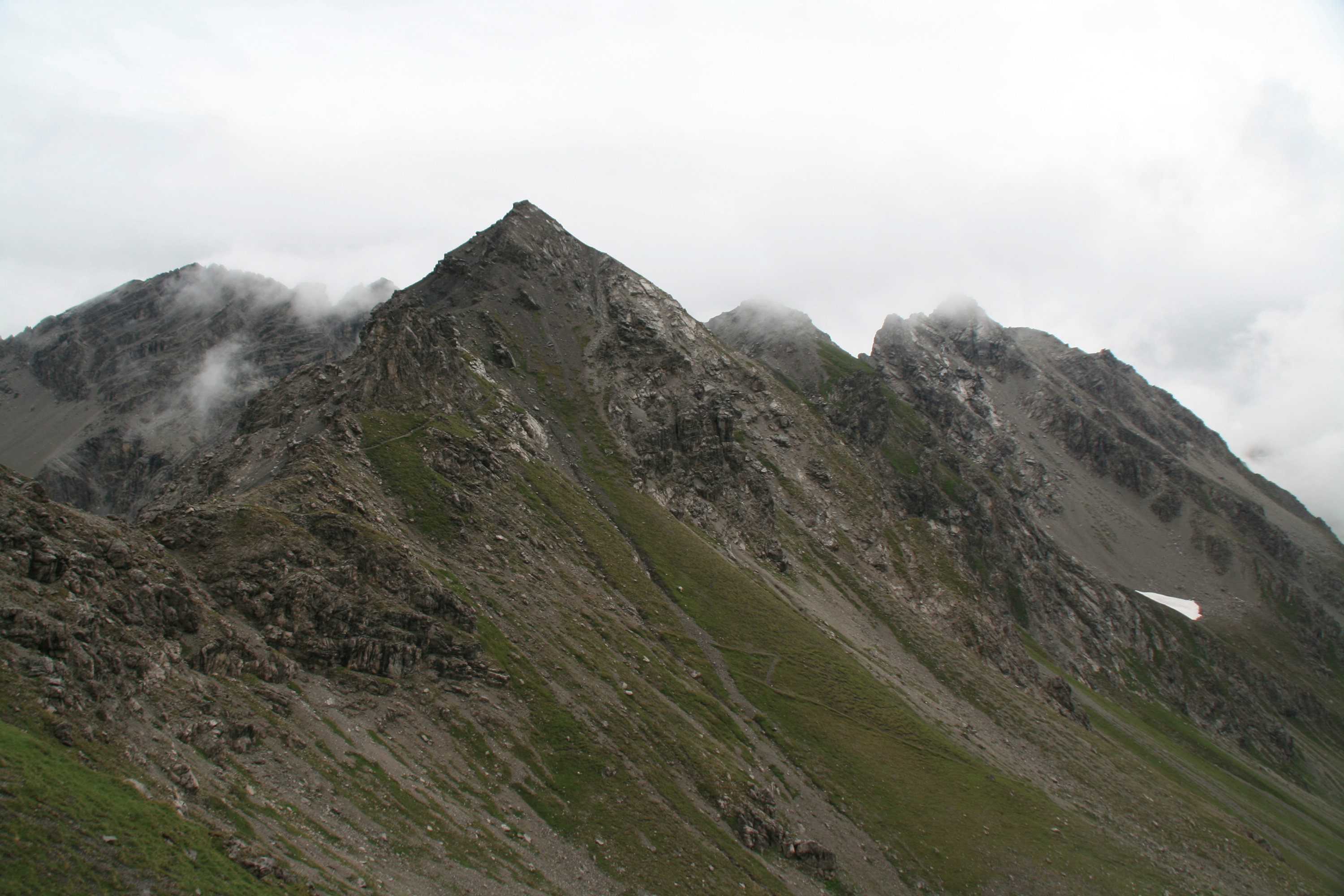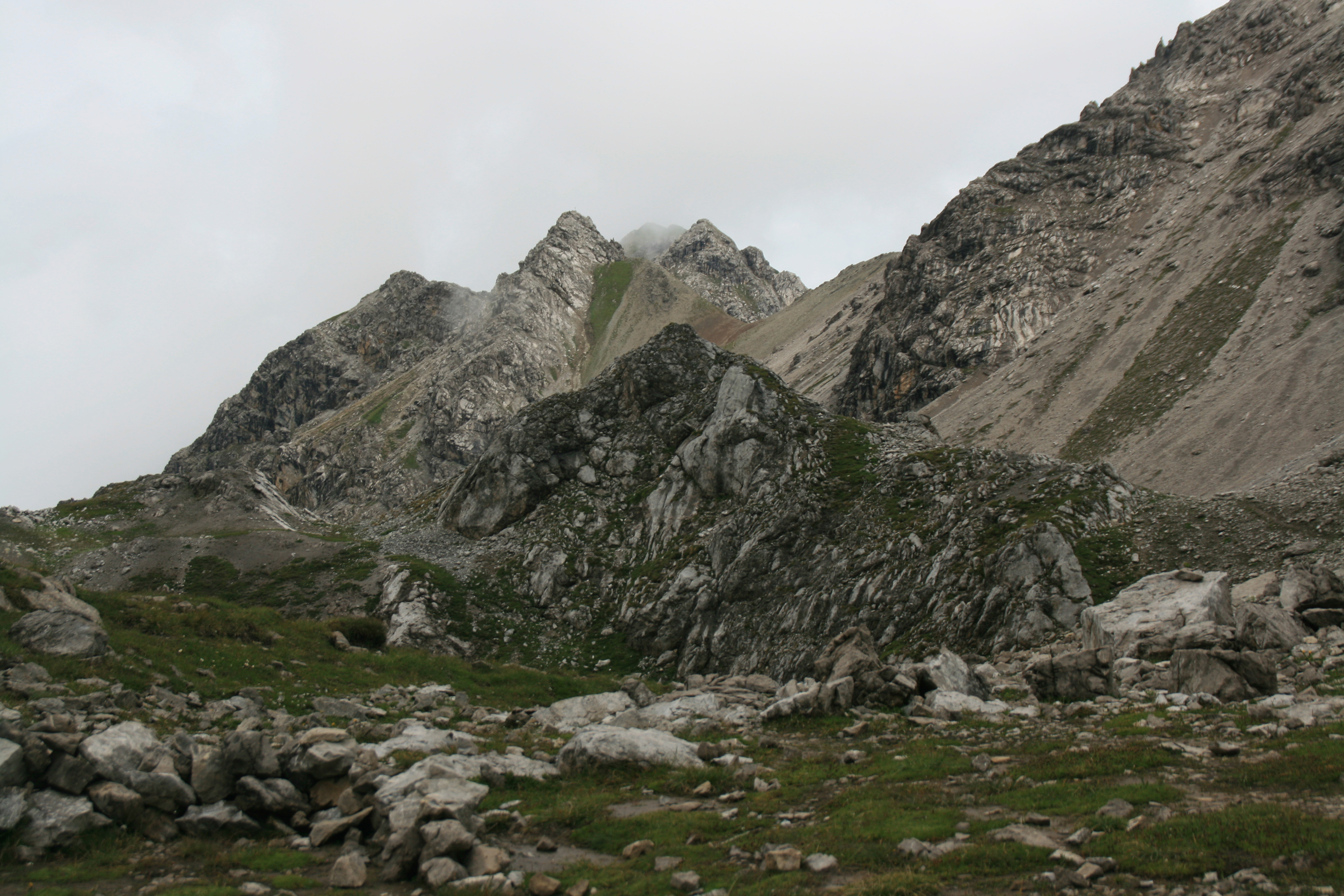Am zweiten Tag meiner Drei-Tages-Tour in den zentralen Lechtaler Alpen ist das Wetter leider deutlich schlechter als angesagt. Der Himmel ist bedeckt, und beim Abmarsch vom Württemberger Haus regnet es ein wenig. Wirkliche Probleme sehe ich nicht, da mir der Übergang zur Memminger Hütte von einer früheren Tour bekannt ist. Ein guter Weg führt unterhalb der Schieferspitze durch Geröllhänge und später durch Schrofengelände mit ein paar Drahtseil-Sicherungen zum ersten Gipfel, der Großbergspitze. Im Wesentlichen auf dem Kamm geht es dann weiter zum Großbergkopf, der fast die gleiche Höhe hat wie der erste Gipfel. (Besonders originell finde ich die Gipfelnamen nicht.)