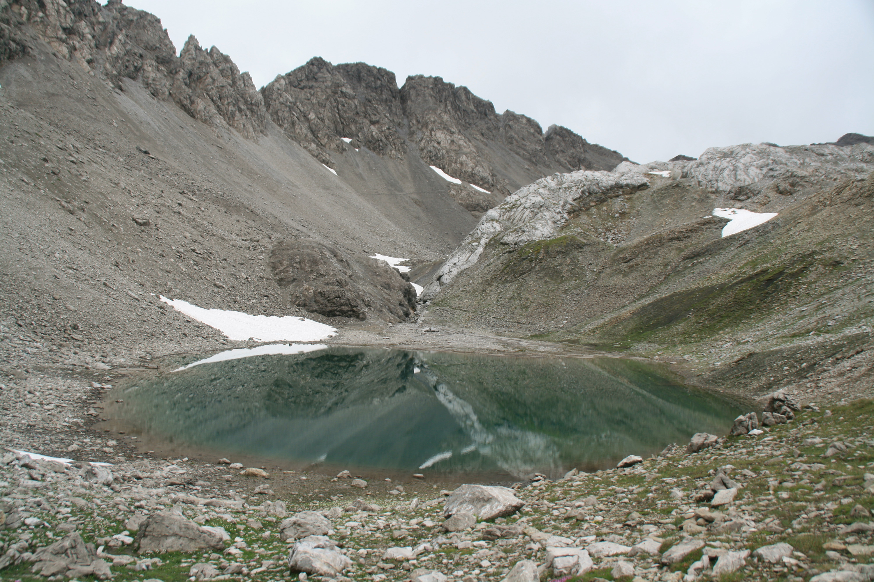 Ein etwas steilerer Abstieg bringt mich zum Großbergjoch, wo eine längere, bequem zu gehende Querung durch das Gebiet der Kleinbergalm beginnt. Kurz vor der Seescharte komme ich auf den Weg, auf dem für E5-Wanderer der lange und ein wenig gefürchtete Abstieg nach Zams beginnt. Jetzt am Mittag ist dieser Trubel allerdings schon vorbei.