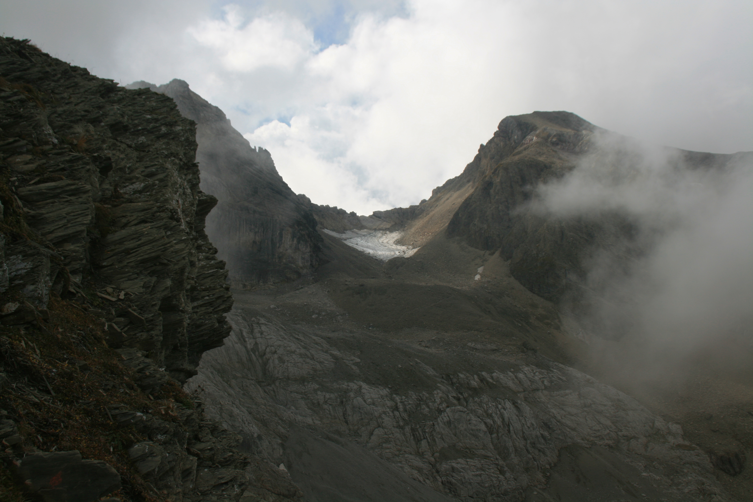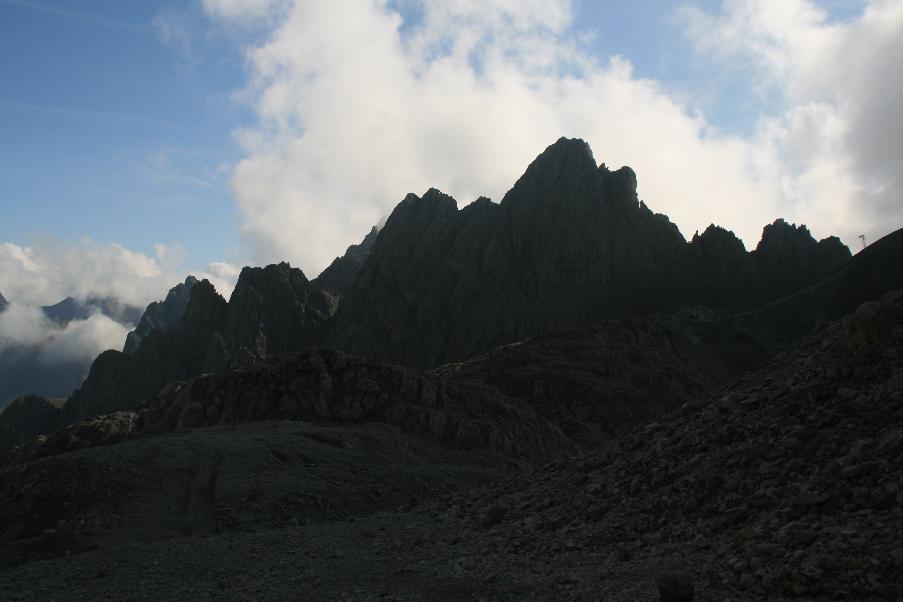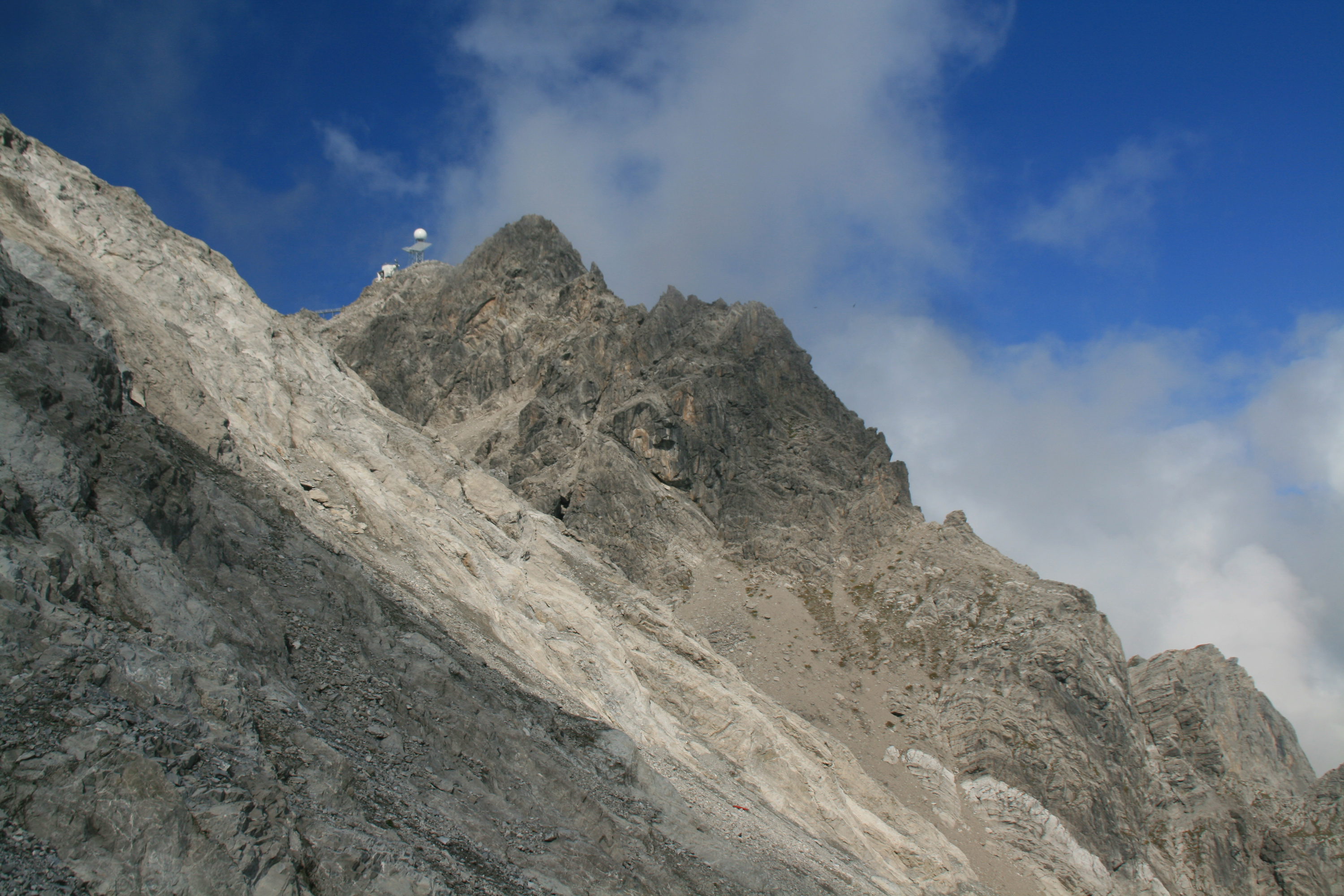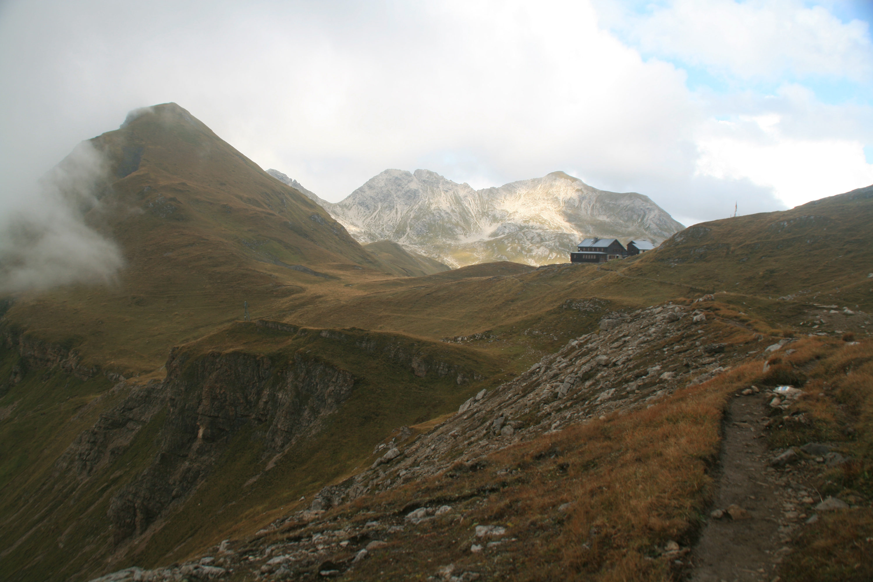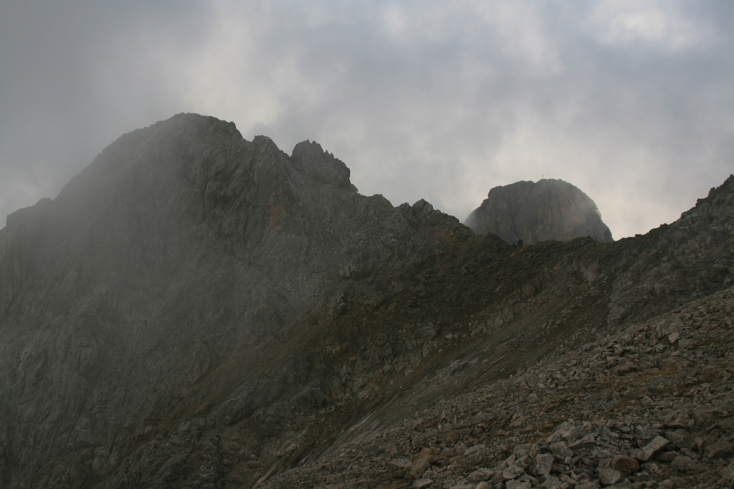 Letzter Tag der Lechtaler-Durchquerung: Wie gestern bin ich auf dem Höhenweg 601 bzw. E4 unterwegs. Das Wetter ist nicht so gut wie erhofft, aber ganz ordentlich. Von der Leutkircher Hütte spaziere ich zum nahe gelegenen Almajurjoch. Von hier führt der Höhenweg durch Geröll- und Schrofenhänge aufwärts; gelegentlich helfen Drahtseilsicherungen über schwierigere Stellen. Nach der Abzweigung in Richtung Kapallkopf geht es nochmal ein Stockwerk höher, dann folgt eine lange Querung auf ungefähr 2400 m Höhe unter den Wänden von Bacherspitze, Weißschrofenspitze und Lisunspitze hinüber zum Knoppenjoch (Matunjoch) und zum benachbarten Valfagehrjoch. Dass hier wesentlich mehr Betrieb ist als bisher, liegt wohl an der Nähe der Ulmer Hütte. Durch ein Geröllkar zwischen Valluga (rechts) und Jahnturm (links) erreiche ich die Mittelstation der Vallugabahn. Der restliche Gipfelaufstieg ist gekennzeichnet durch viel Geröll und einige Kraxelpassagen am Drahtseil. Bald bin ich am Gipfel der Valluga mit ihrem Aussichtsturm. Anscheinend wollte man durch diese Einrichtung den Rundblick um weitere 0,01 Prozent steigern. Aufgrund der stärker gewordenen Bewölkung ist das Panorama nicht so umfassend wie erhofft, dafür habe ich den Gipfel fast allein für mich.