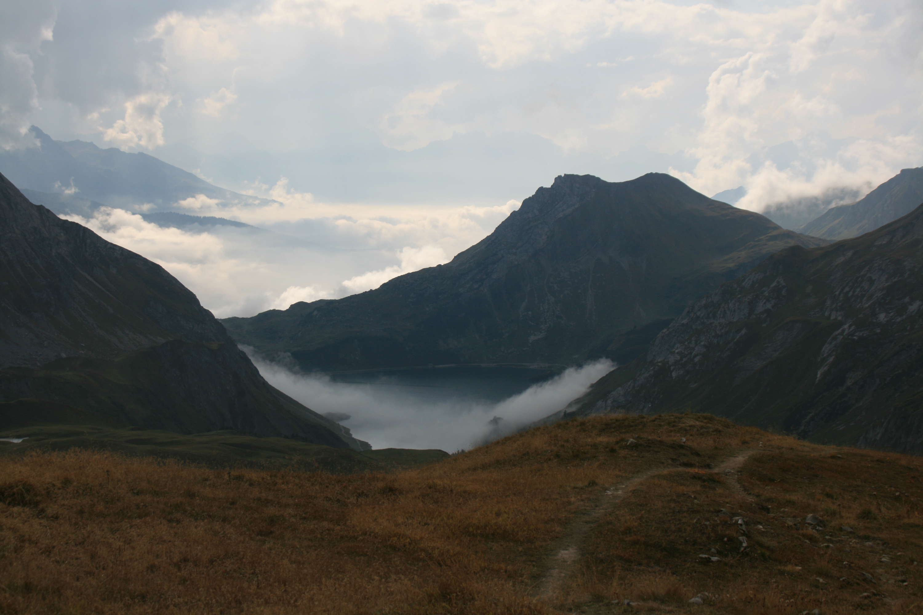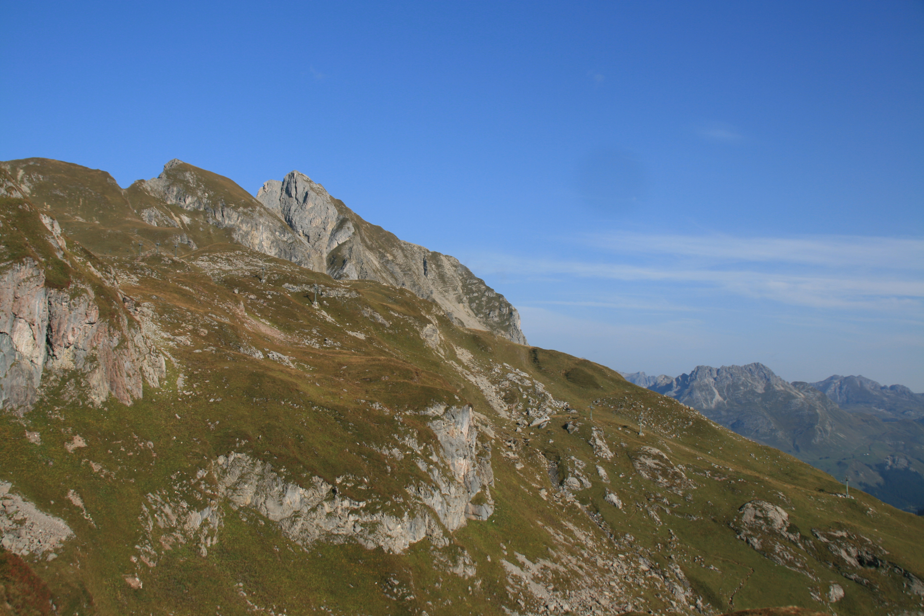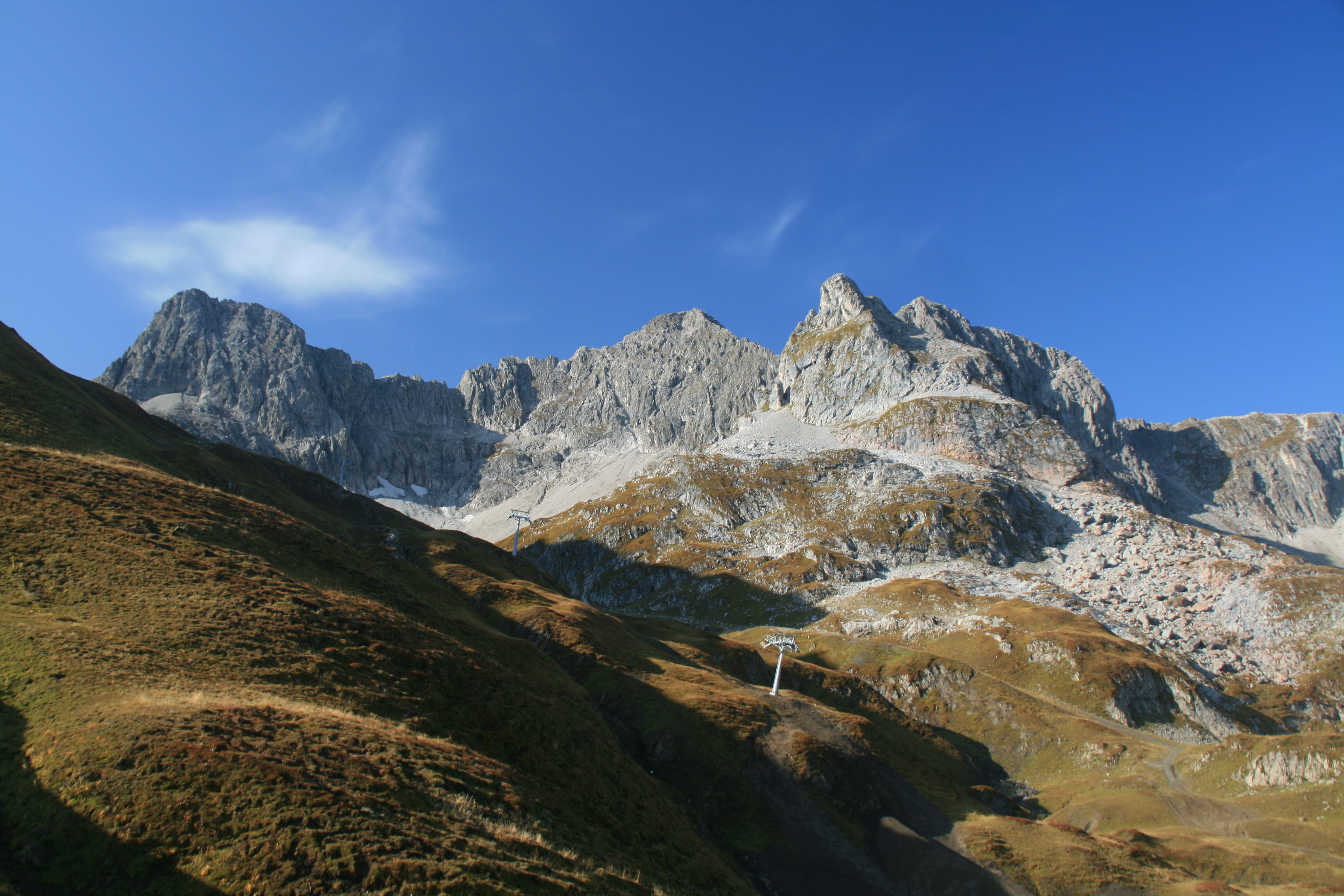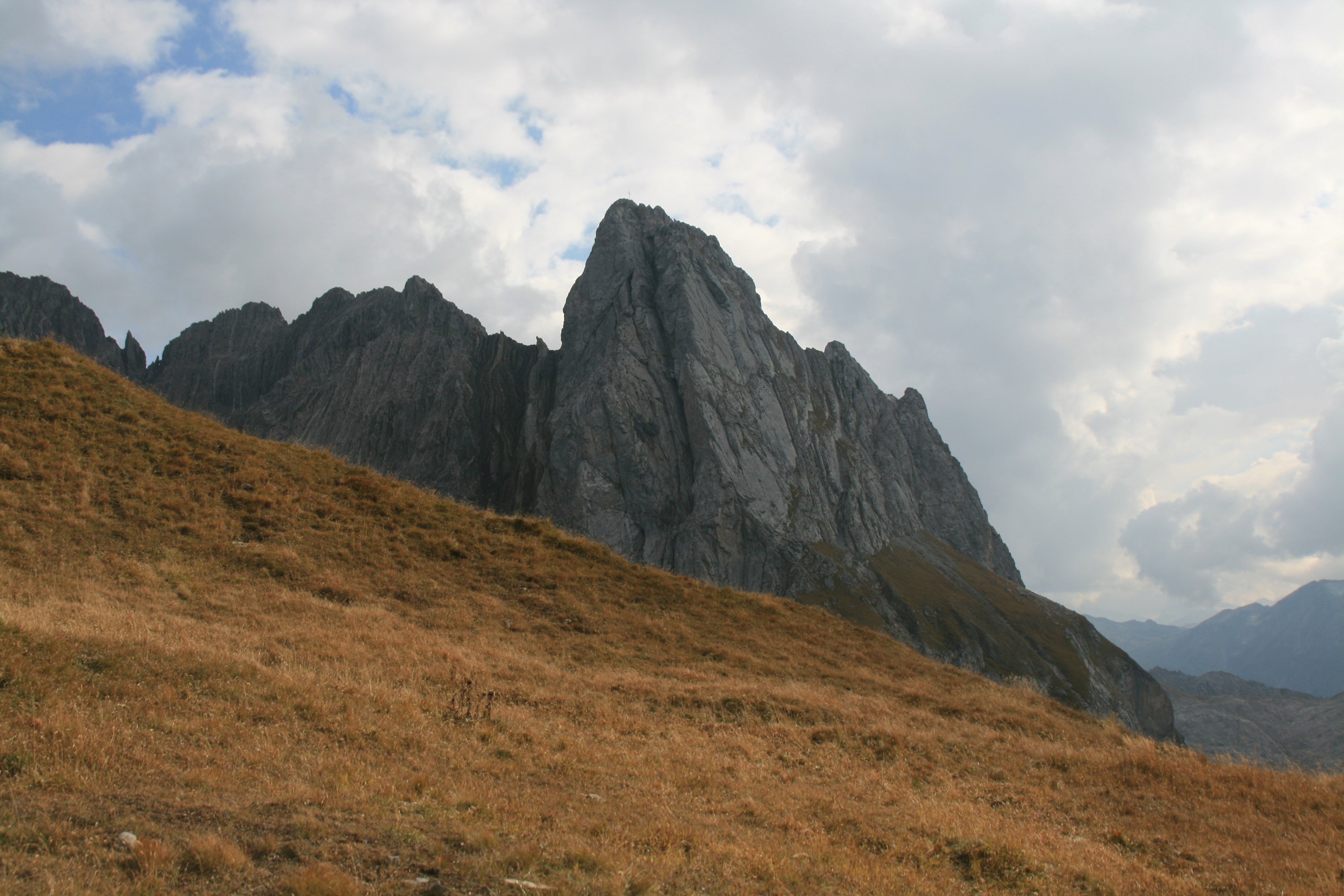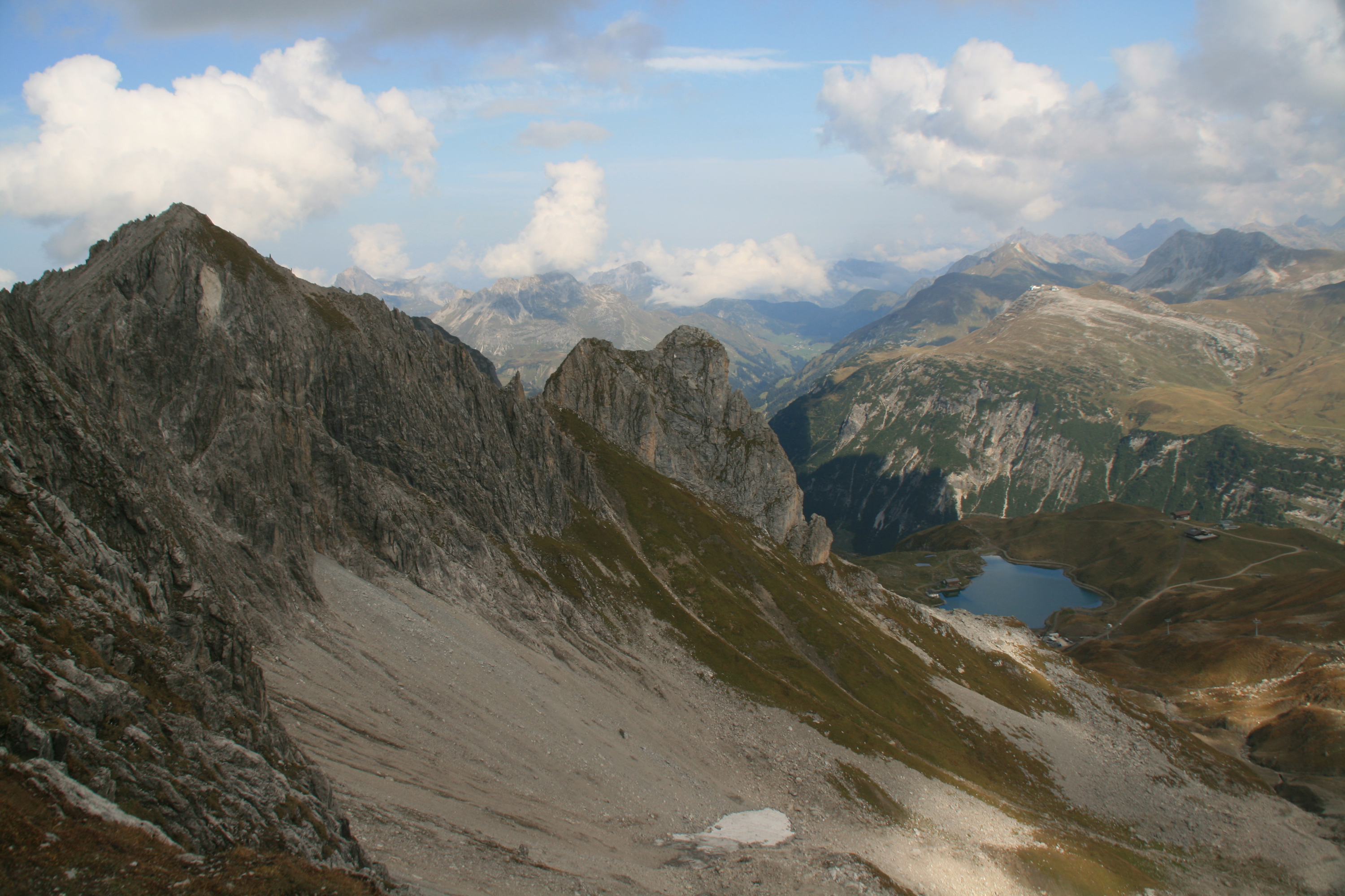 Auf der anderen Seite geht es gemächlich hinunter zum Stierloch, einem weitläufigen Grassattel. Ein Felsgipfel zieht hier die Blicke auf sich, nämlich die Roggalspitze mit ihrer berühmten Felskante. Über die Ravensburger Hütte wandere ich zum Spullersee, wo es im Sommer eine Busverbindung nach Lech gibt.