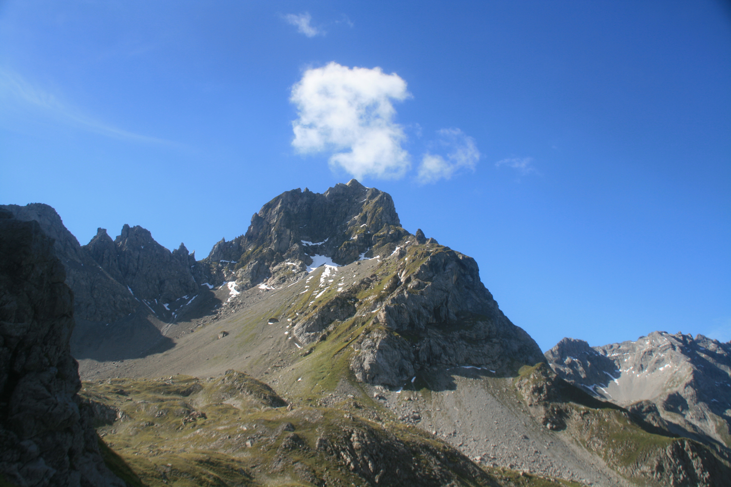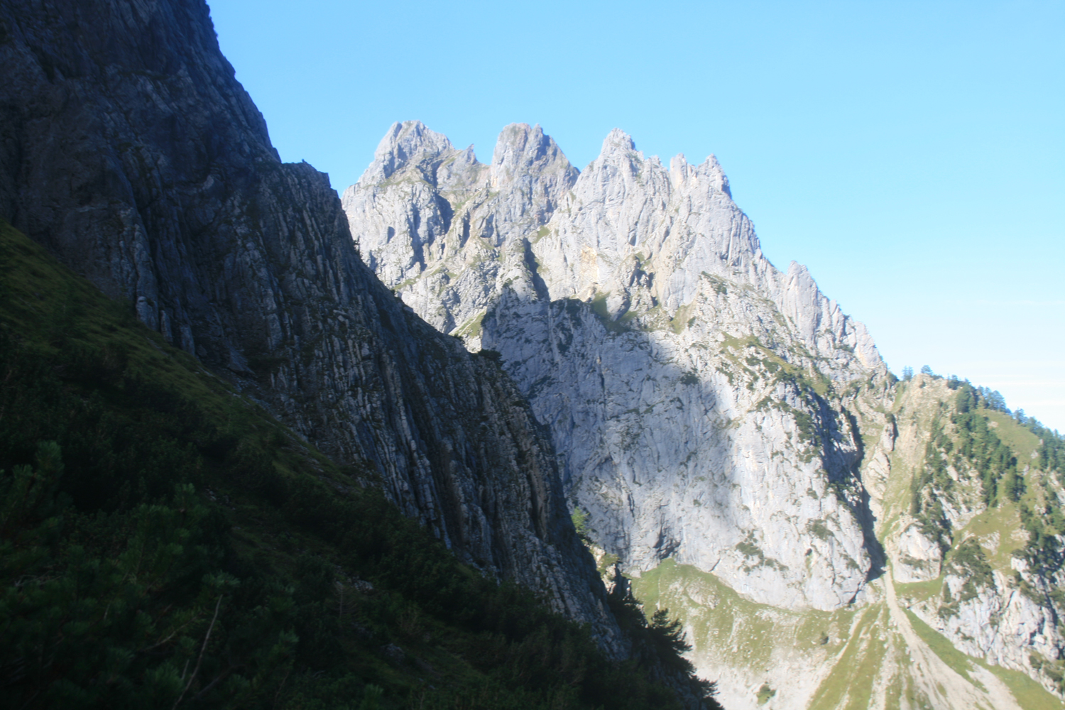 Nun geht es über typisches Almgelände aufwärts; der Steig führt ohne Schwierigkeit hinauf zum Eisernen Törle. Ab hier ist der Weg etwas anspruchsvoller, aber mit ein wenig Schrofenkraxelei ist der Große Valkastiel gut machbar. (Der Ehrlichkeit halber muss ich hinzufügen, dass es mir an einer Stelle gelungen ist, trotz guter Markierung vom Weg abzukommen.).