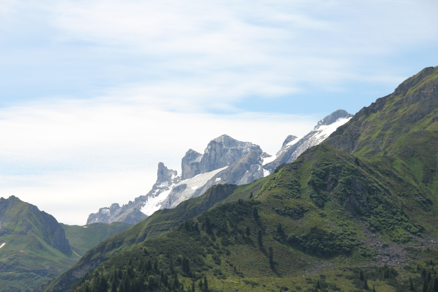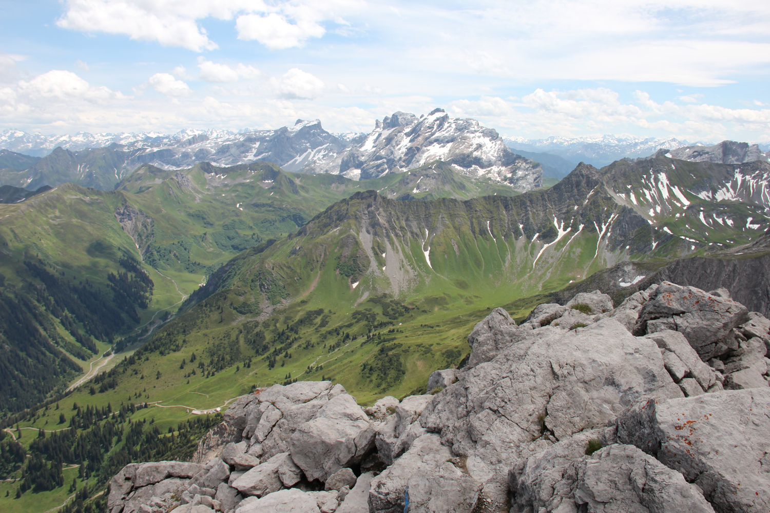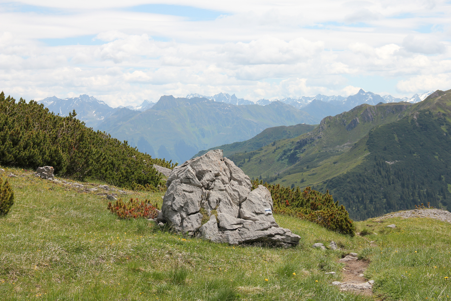 Am längsten Tag des Jahres breche ich zu einer Zweitagestour auf, die meine große Ost-West-Wanderung fortsetzen soll. Um an die letzte Etappe des vergangenen Jahres anzuschließen, muss ich als erstes die Heinrich-Hueter-Hütte erreichen. Die bequemste Möglichkeit dazu bietet die Golmerbahn. Ich starte also an der Bergstation Grüneck und steige zunächst ins Rellstal ab, wo ich auf den Hüttenweg der Heinrich-Hueter-Hütte treffe. Für eine Einkehr ist es noch zu früh, daher mache ich mich gleich an den Weiterweg, der über Gras- und Latschenhänge in westlicher Richtung zum Saulajoch führt. Kurz vor dem Joch zweigt rechts der Normalweg zum Saulakopf ab, auf dem ich über Gras, Geröll und Schrofen zum Gipfel steige. Einige schwierigere Stellen sind mit Drahtseilen gesichert, ein Minimum an Trittsicherheit und Kletterfertigkeit ist auf jeden Fall angebracht. Eigentlich habe ich mit einigem Betrieb gerechnet, aber ich bin ganz allein auf dem Gipfel und kann Brotzeit wie Panorama völlig ungestört genießen.