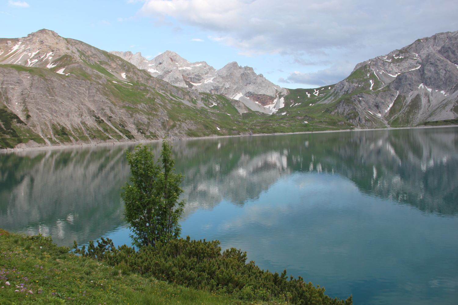 Auf dem Anstiegsweg kehre ich zum Saulajoch zurück. Das restliche Tagesprogramm ist nicht mehr allzu umfangreich. Der Weg quert absteigend die Westhänge des Nördlichen und des Südlichen Schafgafall. Das Tagesziel ist nicht zu übersehen, nämlich der türkisblaue Lünersee, an dem - hinter der langen Staumauer - die Douglass-Hütte liegt.