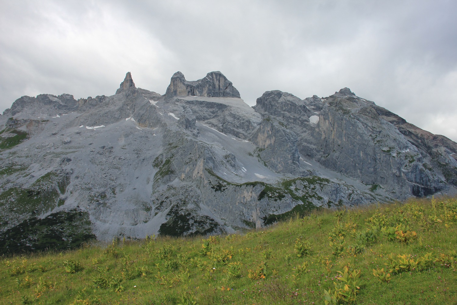 Der zweite Teil unserer Wochendtour ist eine ausgesprochene Genusswanderung. Der Golmer Höhenweg überschreitet einige Gipfel der kleinen Gebirgsgruppe, die der Drusenfluh und den Drei Türmen vorgelagert ist. Die Tour ist weniger alpin als die gestrige Besteigung des Großen Turms, muss sich aber, was die Aussicht betrifft, nicht verstecken. Wahrscheinlich wäre die Begehung in umgekehrter Richtung noch reizvoller, weil man dann die prominenten Rätikon-Gipfel immer vor Augen hätte, aber das hätte nicht in unsere Pläne gepasst.