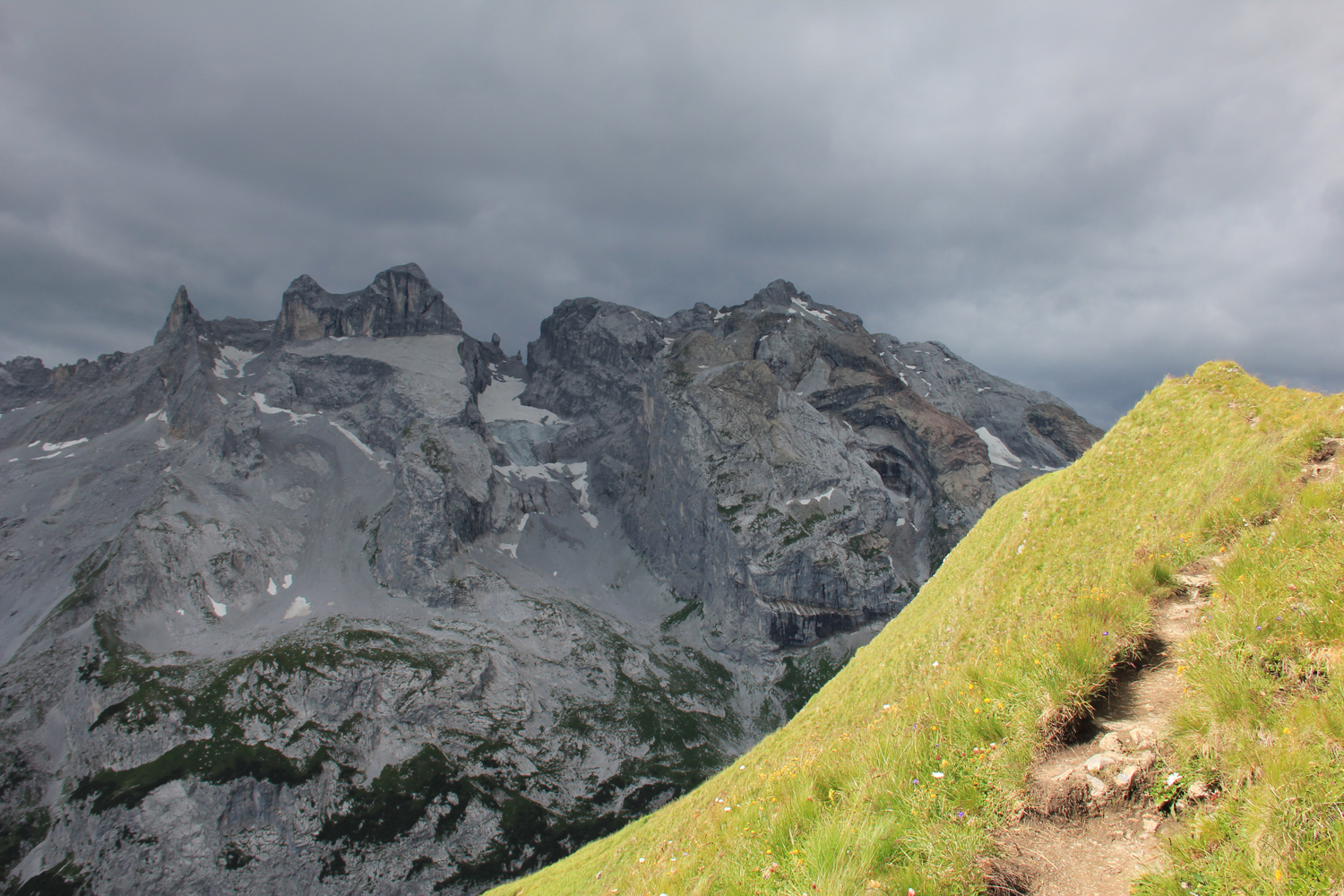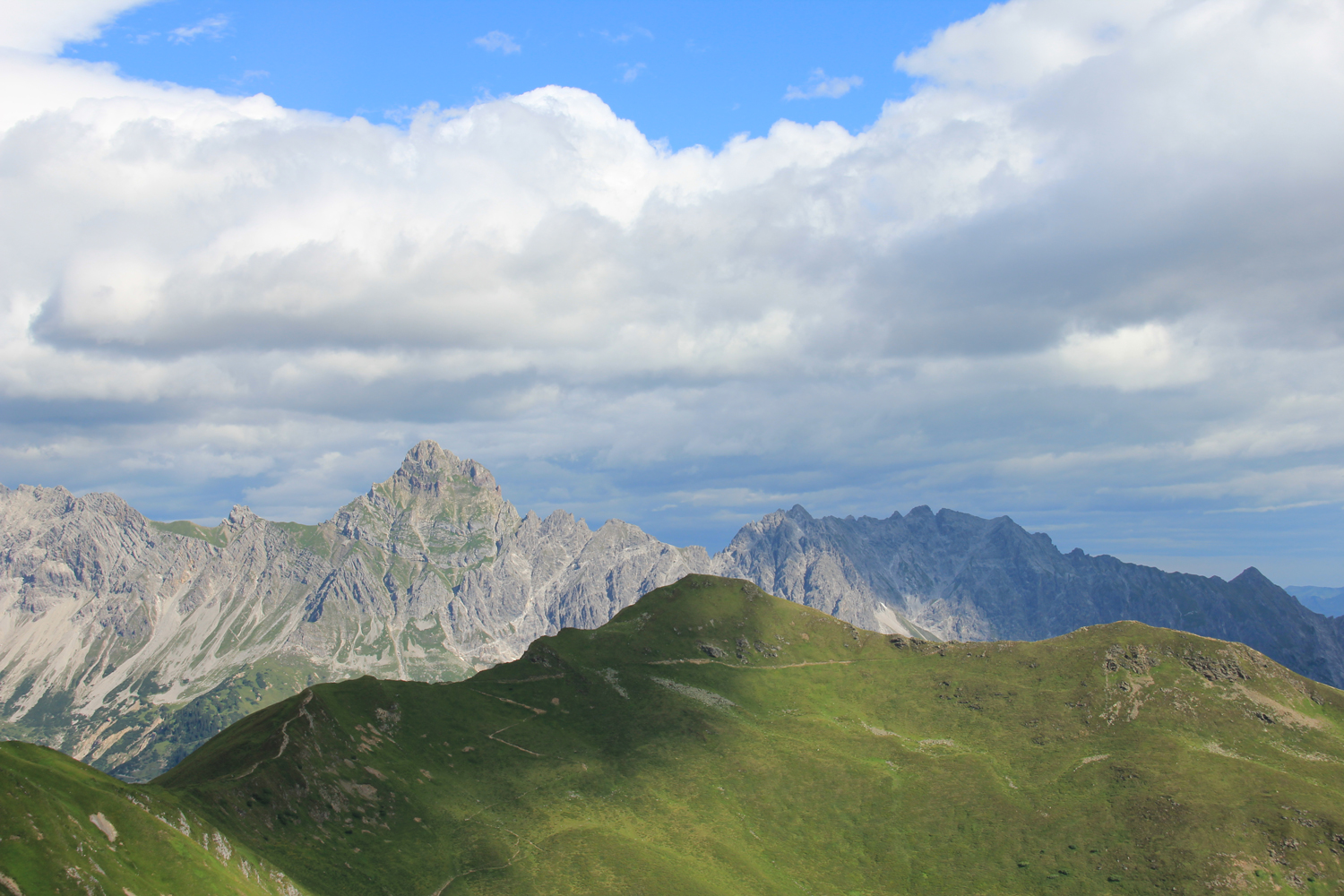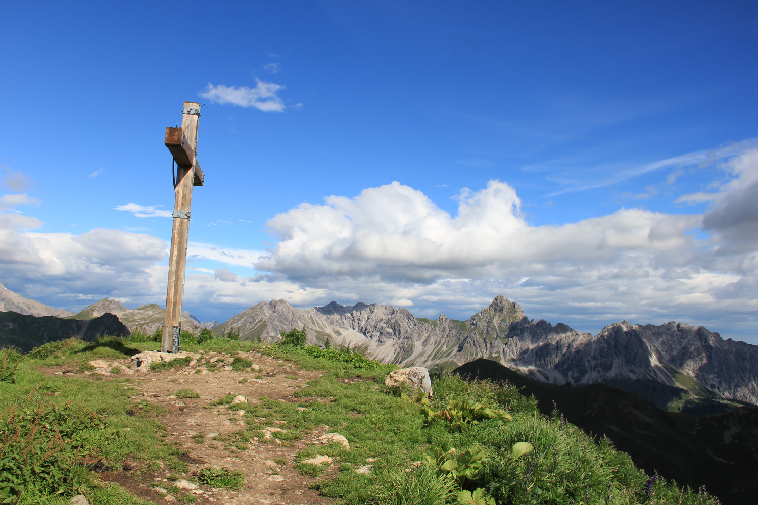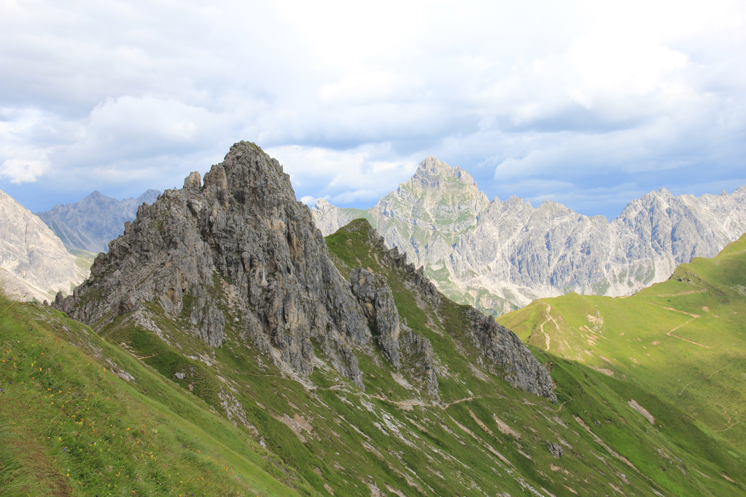 Von der Lindauer Hütte zieht ein Steig mit vielen Serpentinen hoch durch die grasige, recht steile Südostflanke der Geißspitze. Damit ist der höchste Punkt der heutigen Unternehmung bereits geschafft. Über den Westkamm geht es anschließend hinab in einen kleinen Sattel, bevor der Weg unter dem Ostgipfel der Kreuzspitze und unter dem Wilden Mann (also auf der rechten Seite des Kamms) mit leichtem Höhenverlust zum Hätaberger Joch hinüberquert. Ein kurzer Grasaufstieg bringt uns zum Kreuzjoch. Hier biegt der Weg rechts nach Nordosten ab. Über den einfachen Latschätzkopf und das Golmer Joch steigen wir ab zur Bergstation Grüneck. Das Wetter ist nicht mehr so freundlich wie vor einigen Stunden, aber wir bleiben vom Platzregen verschont. Die Gondel der Bergbahn trägt uns knieschonend ins Tal.