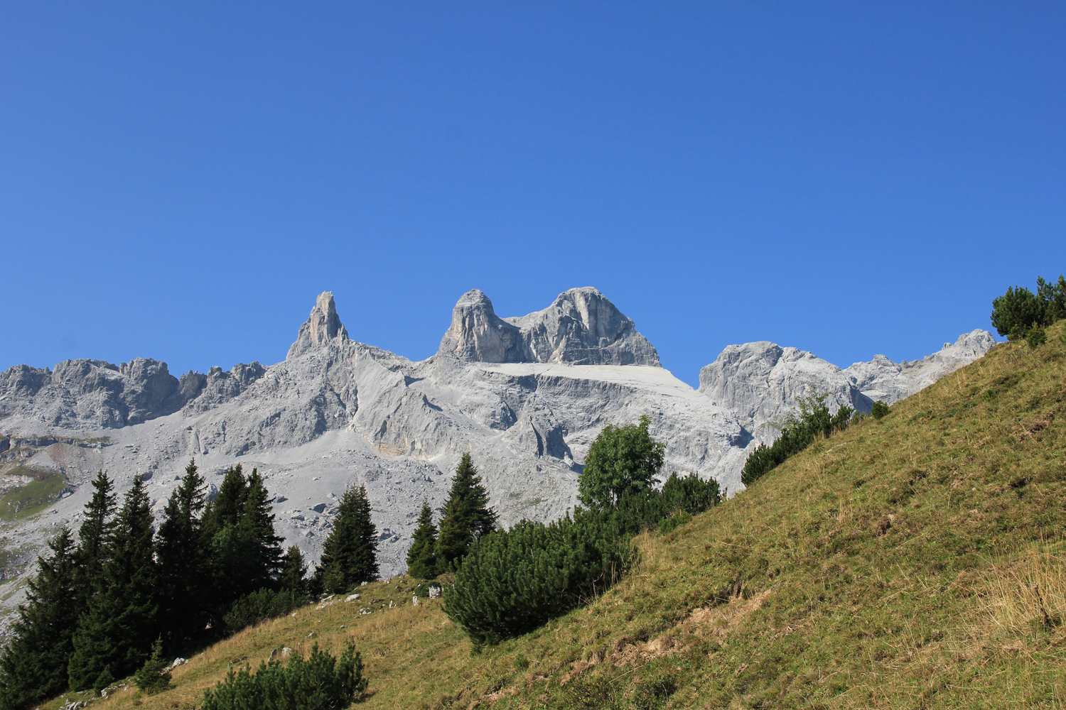 Der Abstiegsweg in östlicher bis nordöstlicher Richtung ist bequem zu begehen. Einige Karrenfelder sind zu überqueren, bevor ich über Grashänge mein Tagesziel, die Tilisunahütte, erreiche.