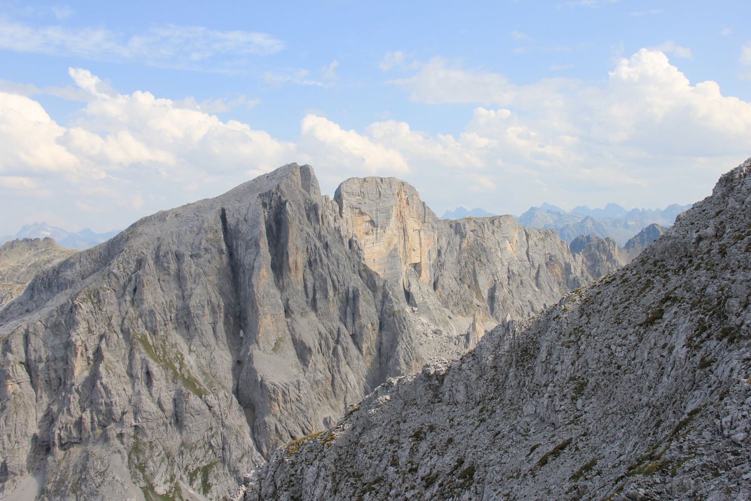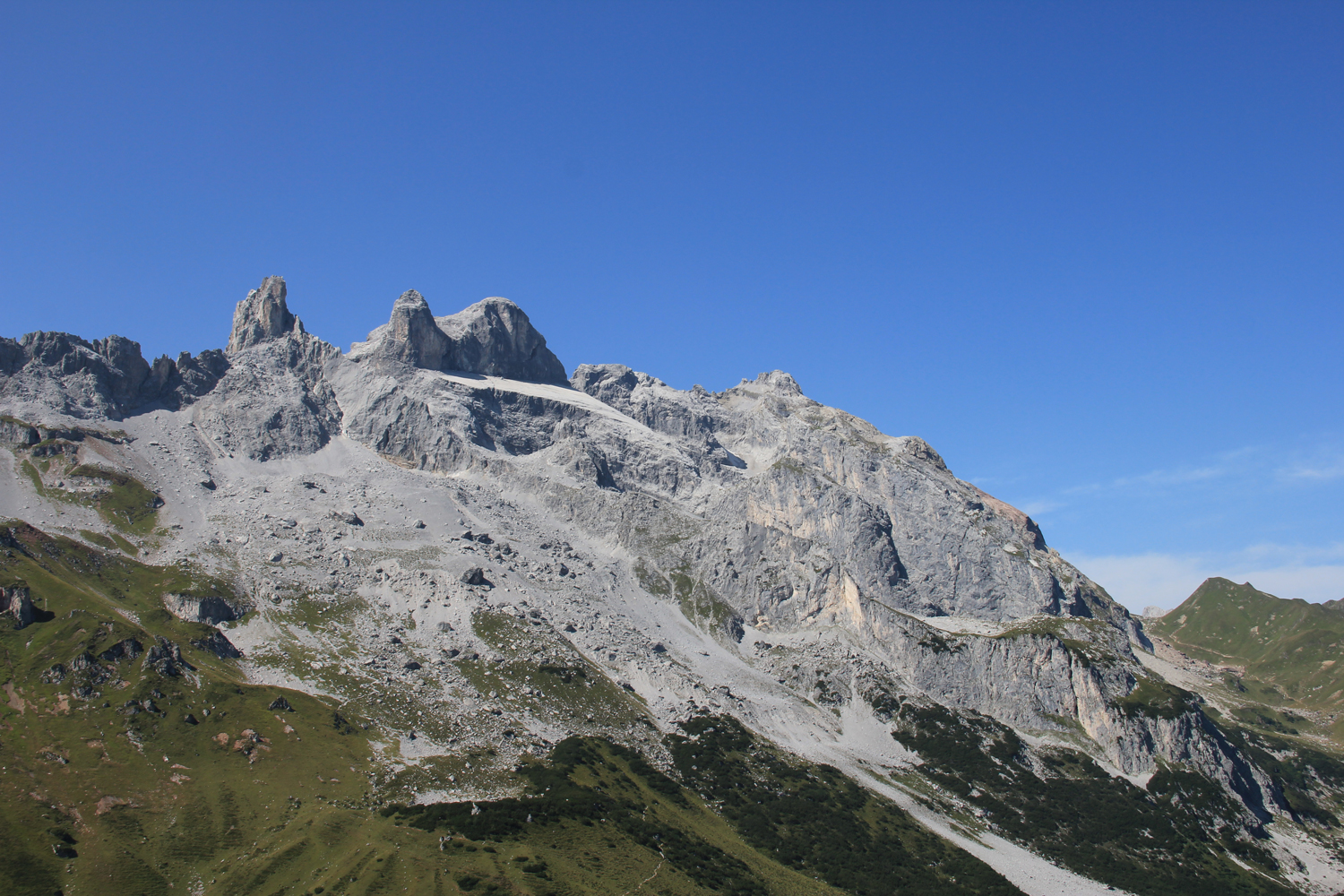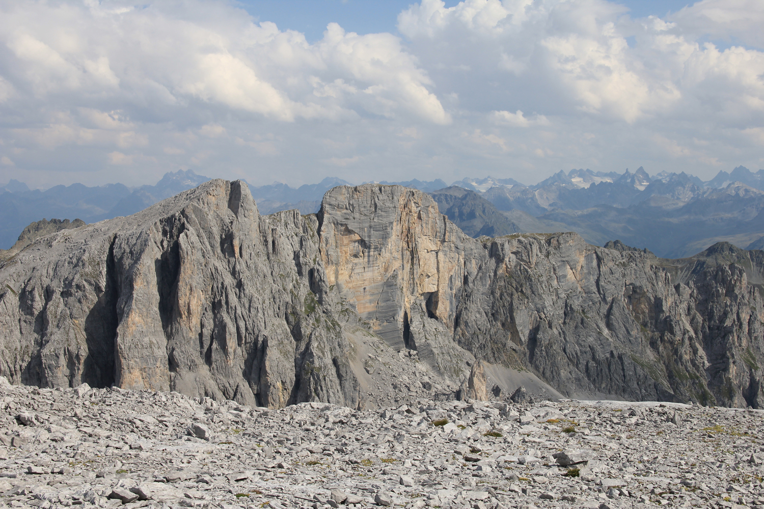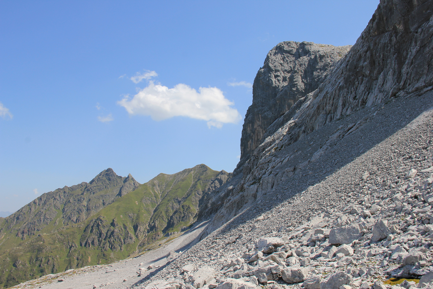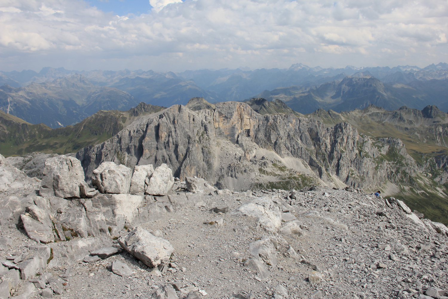 Nach ordentlicher Flüssigkeitszufuhr breche ich zur eigentlichen Tour auf. Der Weg in Richtung Tilisunahütte verliert zunächst ein wenig Höhe, bevor nach rechts ein Steig zur Sulzfluh abzweigt. Es geht in ein breites Tal ("Rachen"), wobei im ersten Teil auch kurze Kraxelstellen zu absolvieren sind. Später wendet sich der Steig scharf nach links, um einen breiten Kamm zu erreichen. Etwa 150 Höhenmeter unter dem Gipfel vereinigt sich der Steig mit dem Anstiegsweg von der Tilisunahütte. Durch einfaches Gelände steigt man in einem weiten Bogen hinauf zum Gipfel der Sulzfluh.
