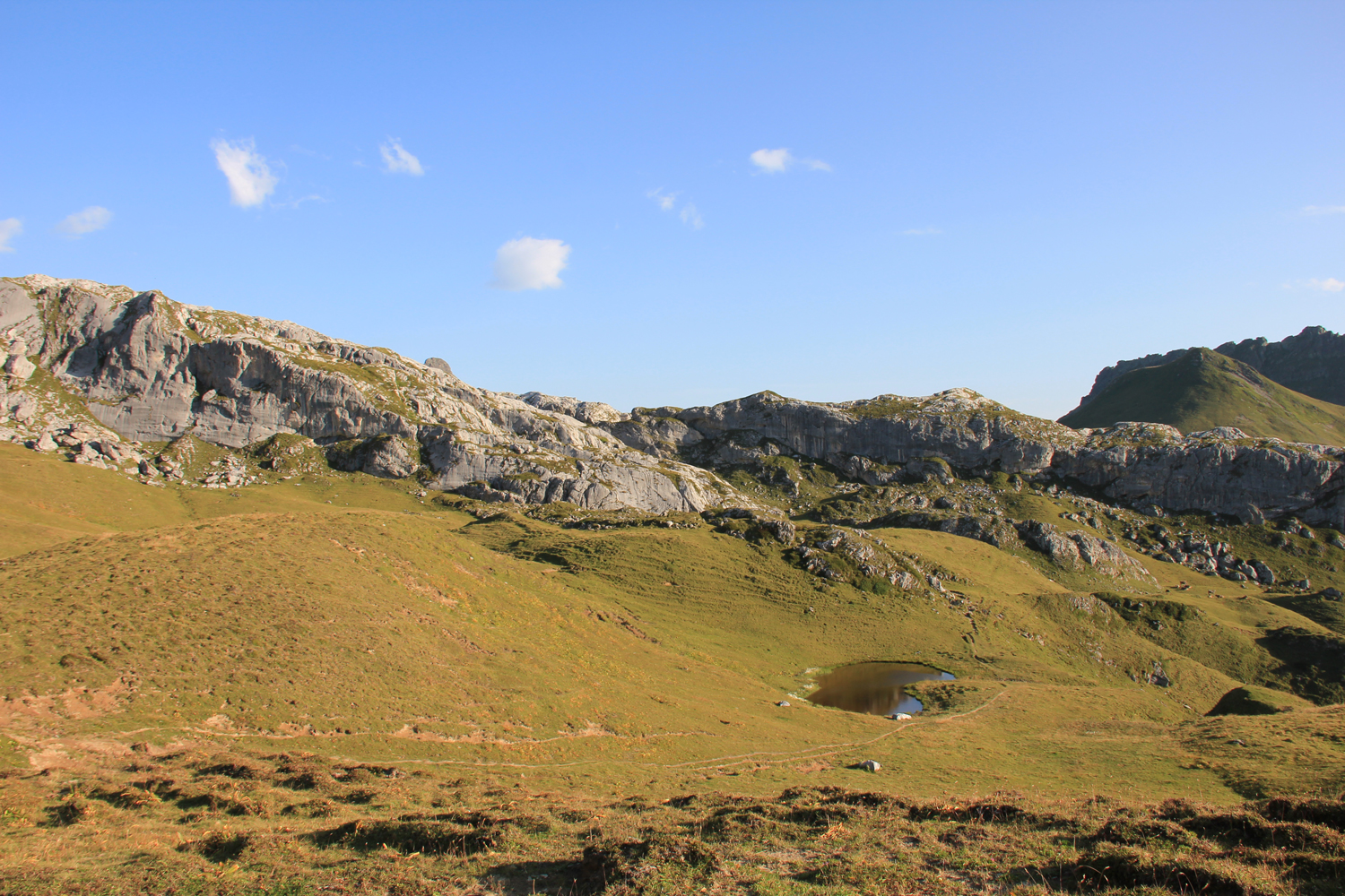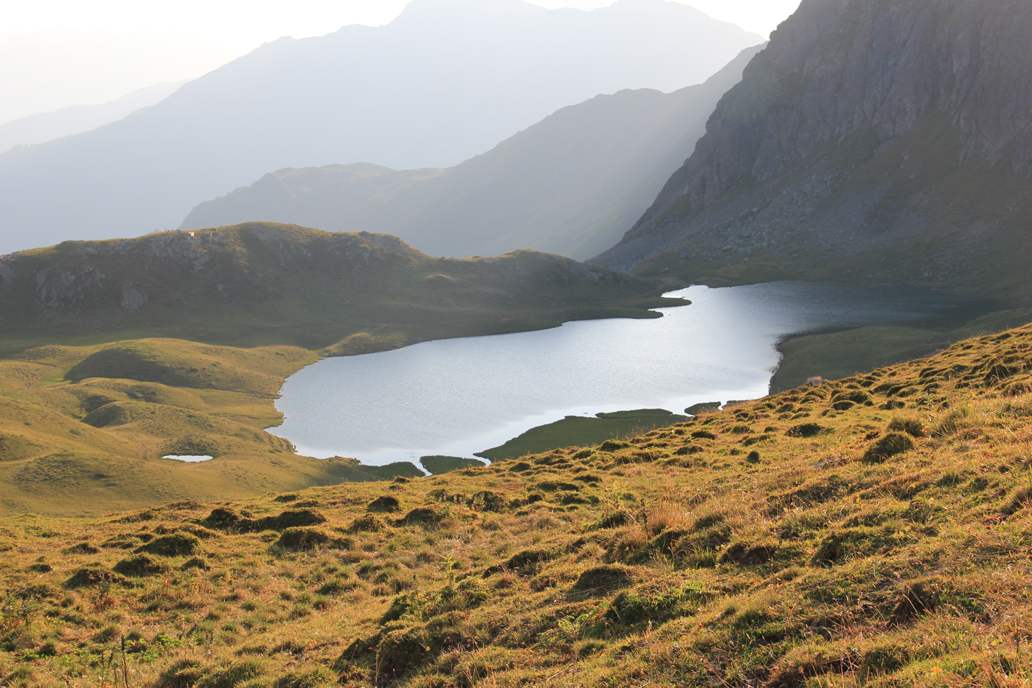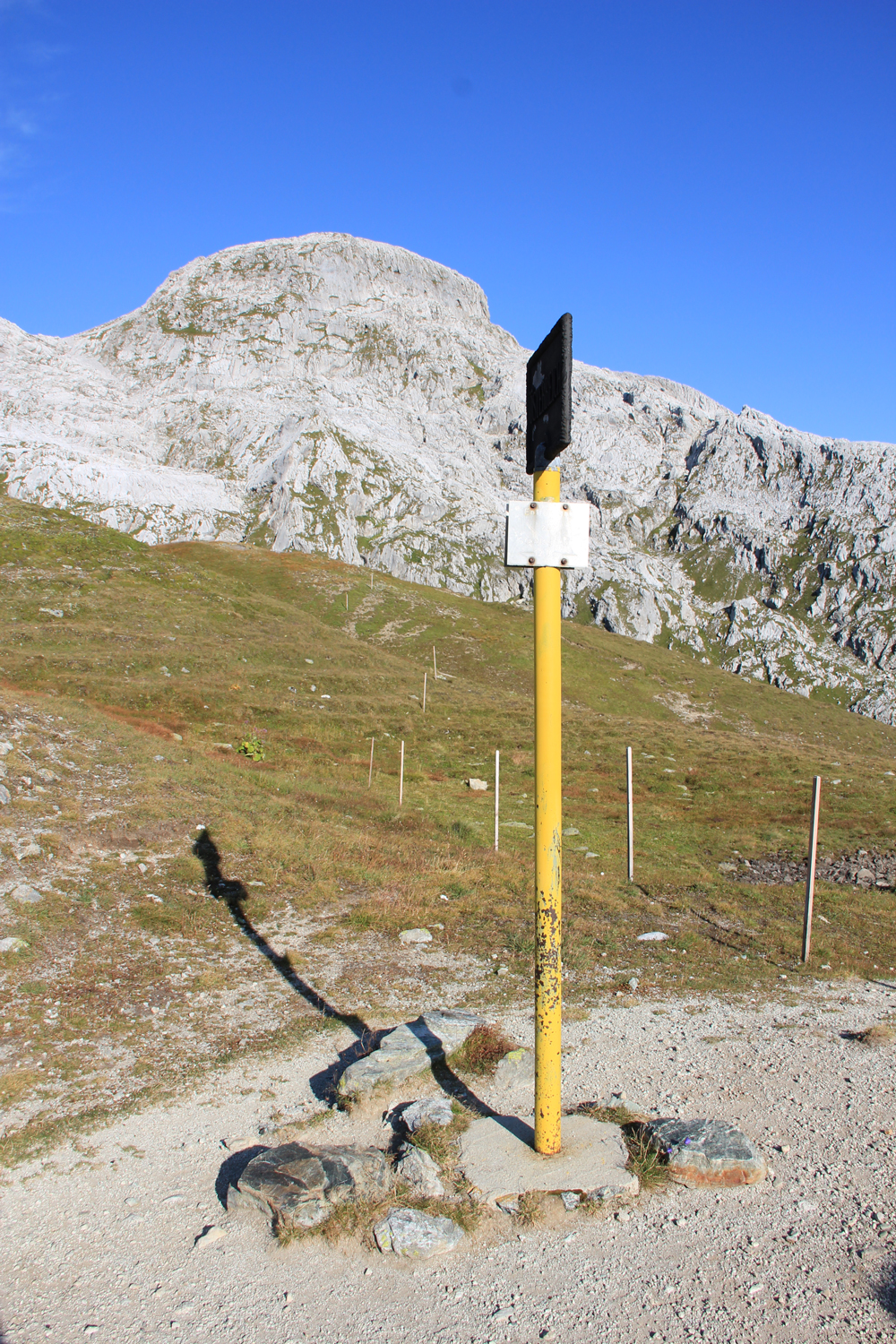 Auf meiner langen Ost-West-Wanderung werde ich heute von der Nordseite des Rätikons auf die Südseite wechseln, verbunden mit einem Grenzübertritt von Österreich in die Schweiz. Beim Aufbruch an der Tilisunahütte liegt der etwas tiefer gelegene Tilisunasee ganz ruhig da. Ausgesprochen flach geht es über idyllische Grashänge zum Gruobenpass und weiter zum Plasseggenpass, wo ein Schild auf die Landesgrenze hinweist.