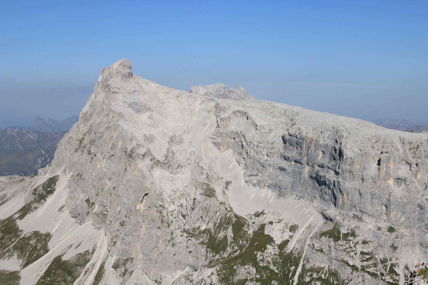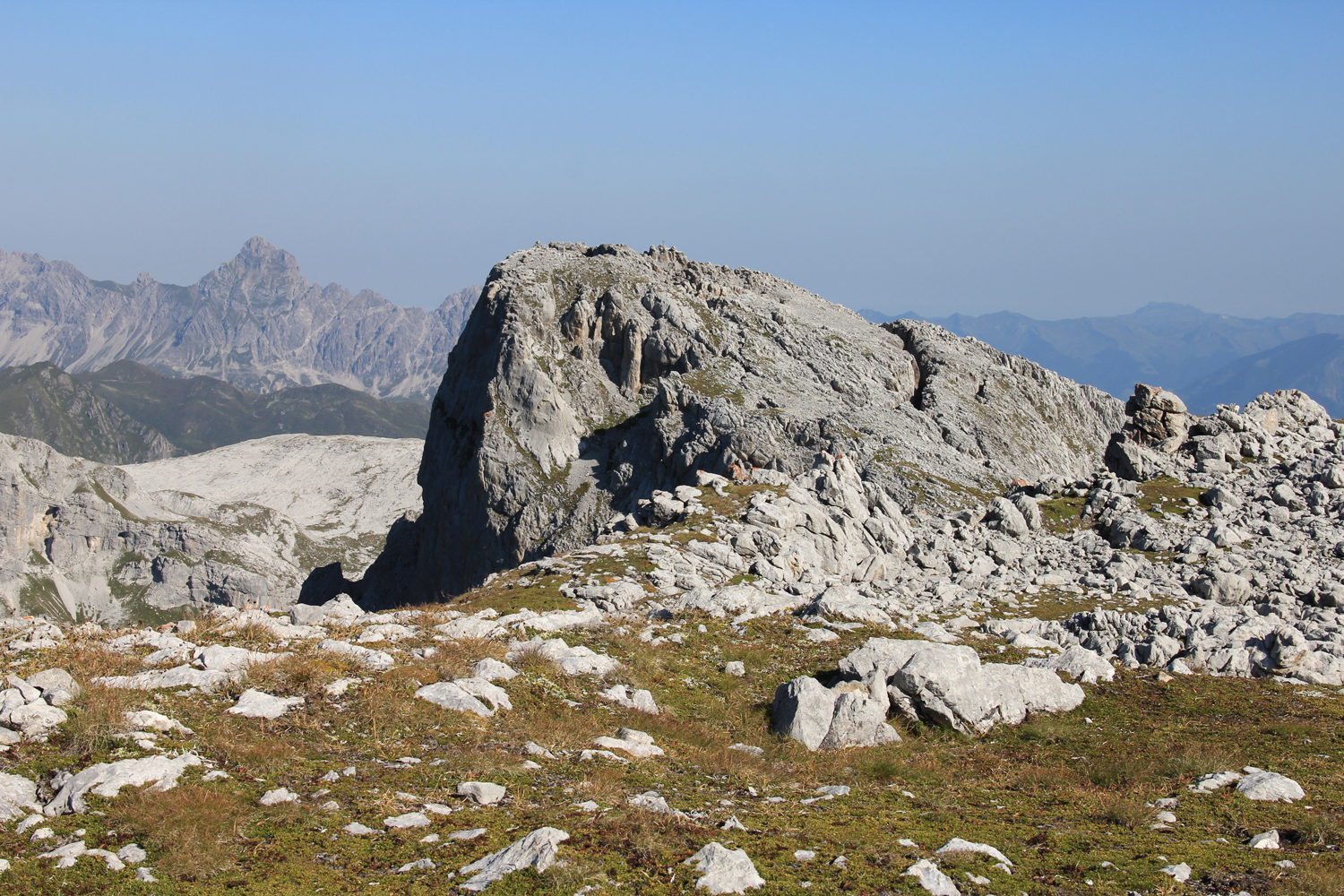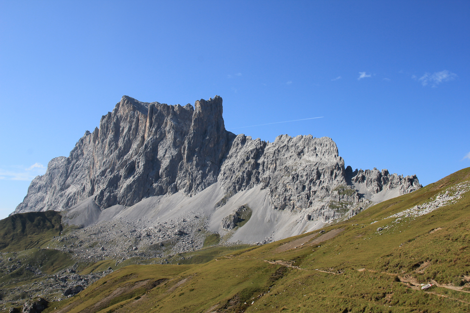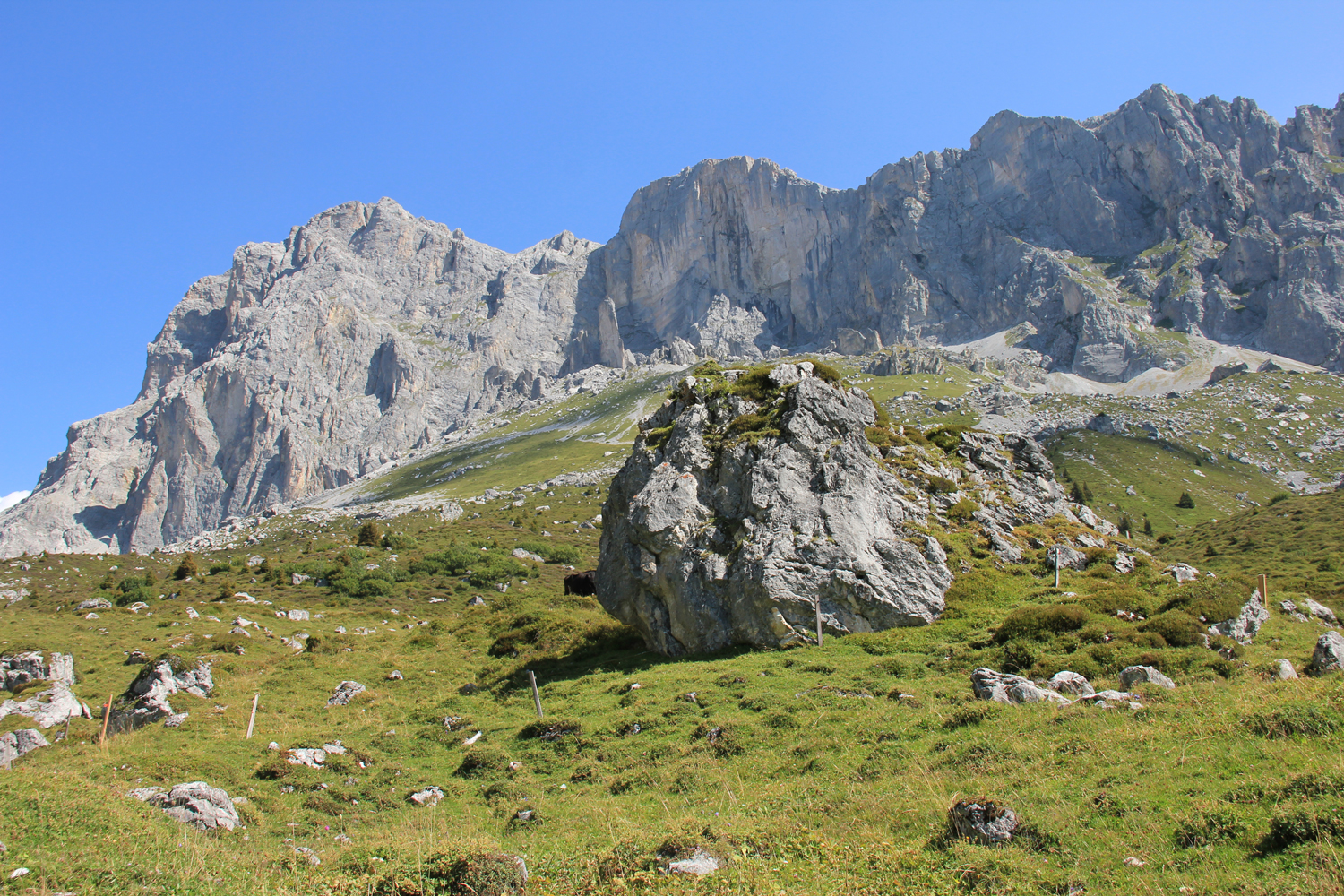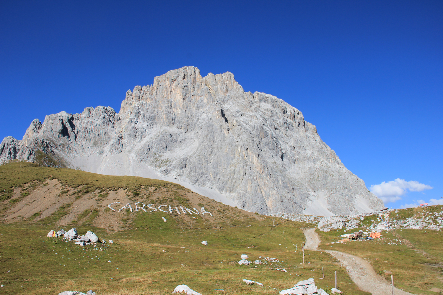 Die verlorenen Höhenmeter müssen natürlich wieder hereingeholt werden. Über schöne Wiesenhänge steige ich aufwärts, wobei die Mittagshitze einige Schweißtropfen bzw. -bäche verursacht. Zum Schluss gibt es noch eine längere flache Querung unter den Südabstürzen der Sulzfluh, dann ist die Carschinahütte erreicht.