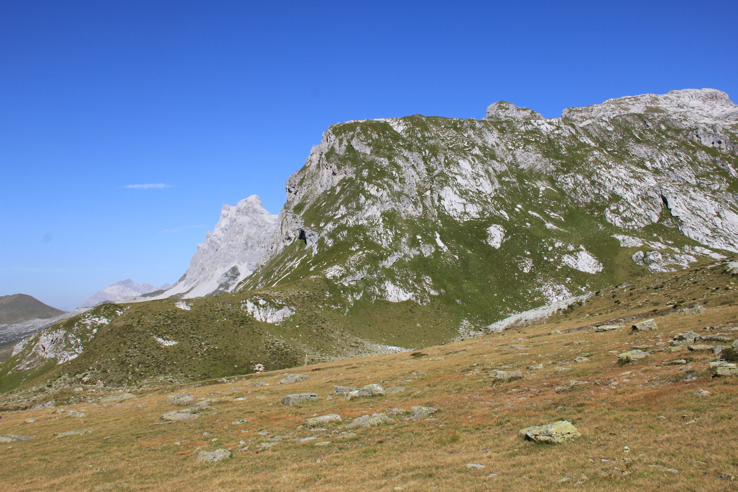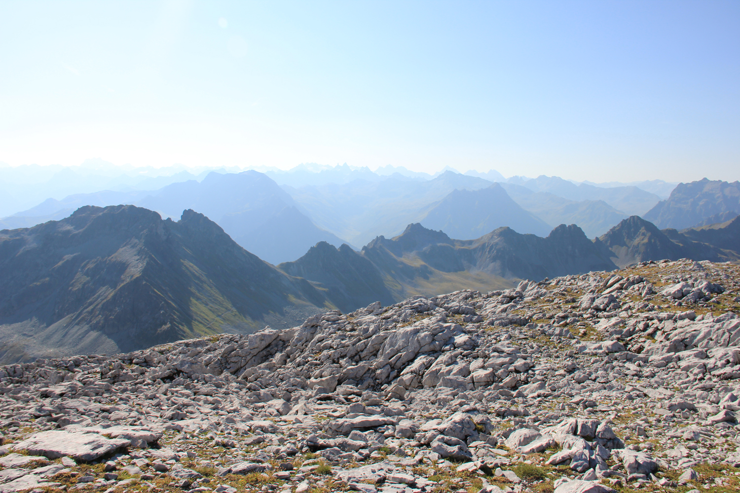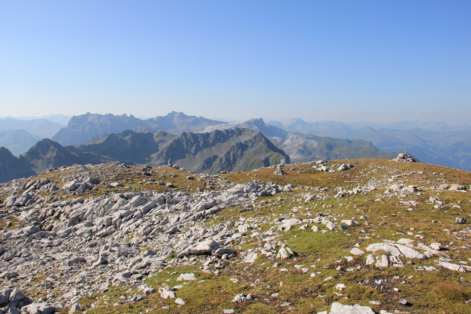 Als Gipfelziel habe ich mir für heute die Scheienfluh (Schijenflue) vorgenommen. Der Anstieg ist bis auf einige Steinmänner unmarkiert, und ich muss zunächst ein wenig nach dem "Einstieg" suchen. Später ist die Aufstiegsroute völlig klar. Ab Passhöhe sind es etwa 45 Minuten, dann stehe ich auf dem Gipfel, wo ich ganz allein das Panorama genießen kann. Auf dem gleichen Weg geht es zurück zum Plasseggenpass.