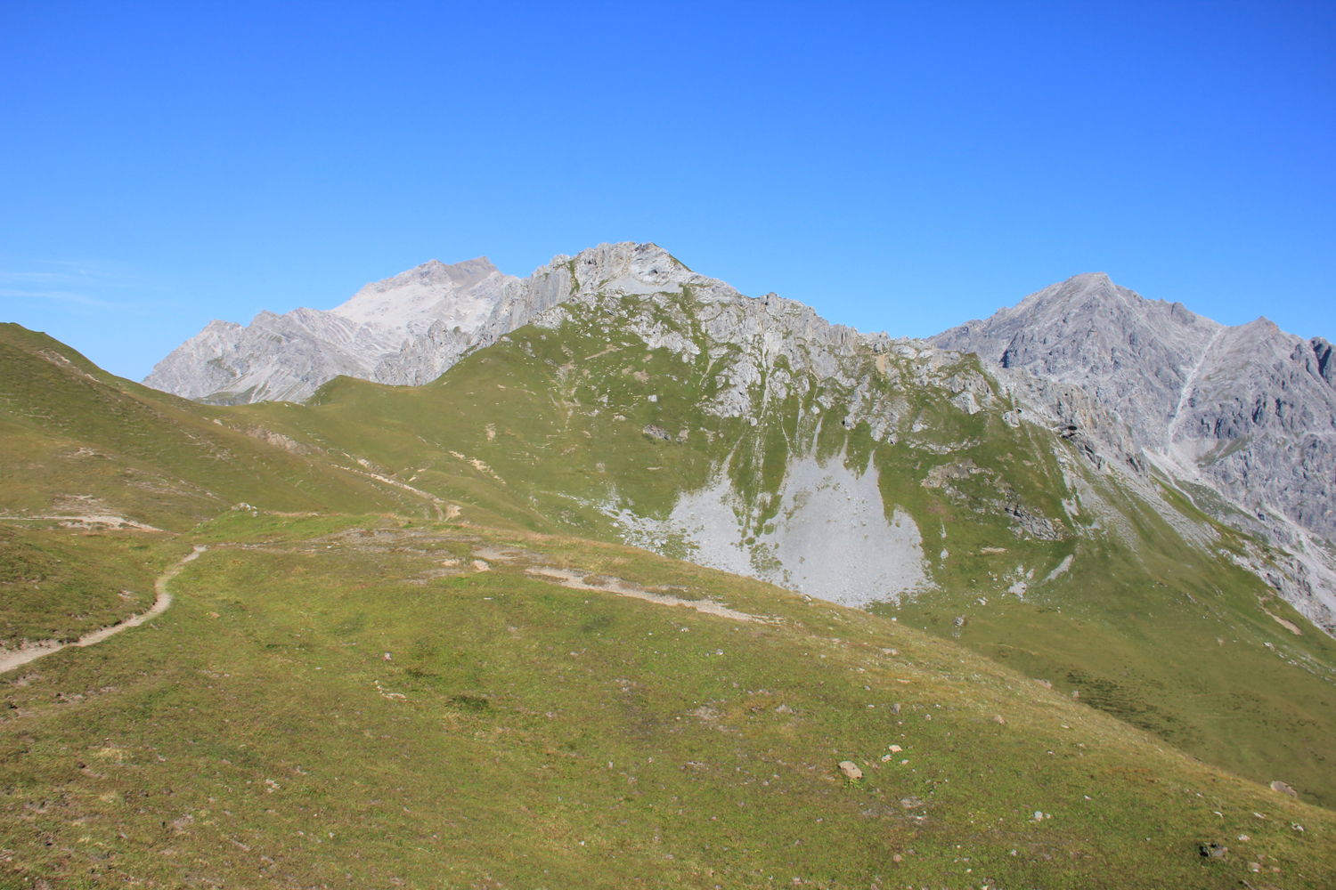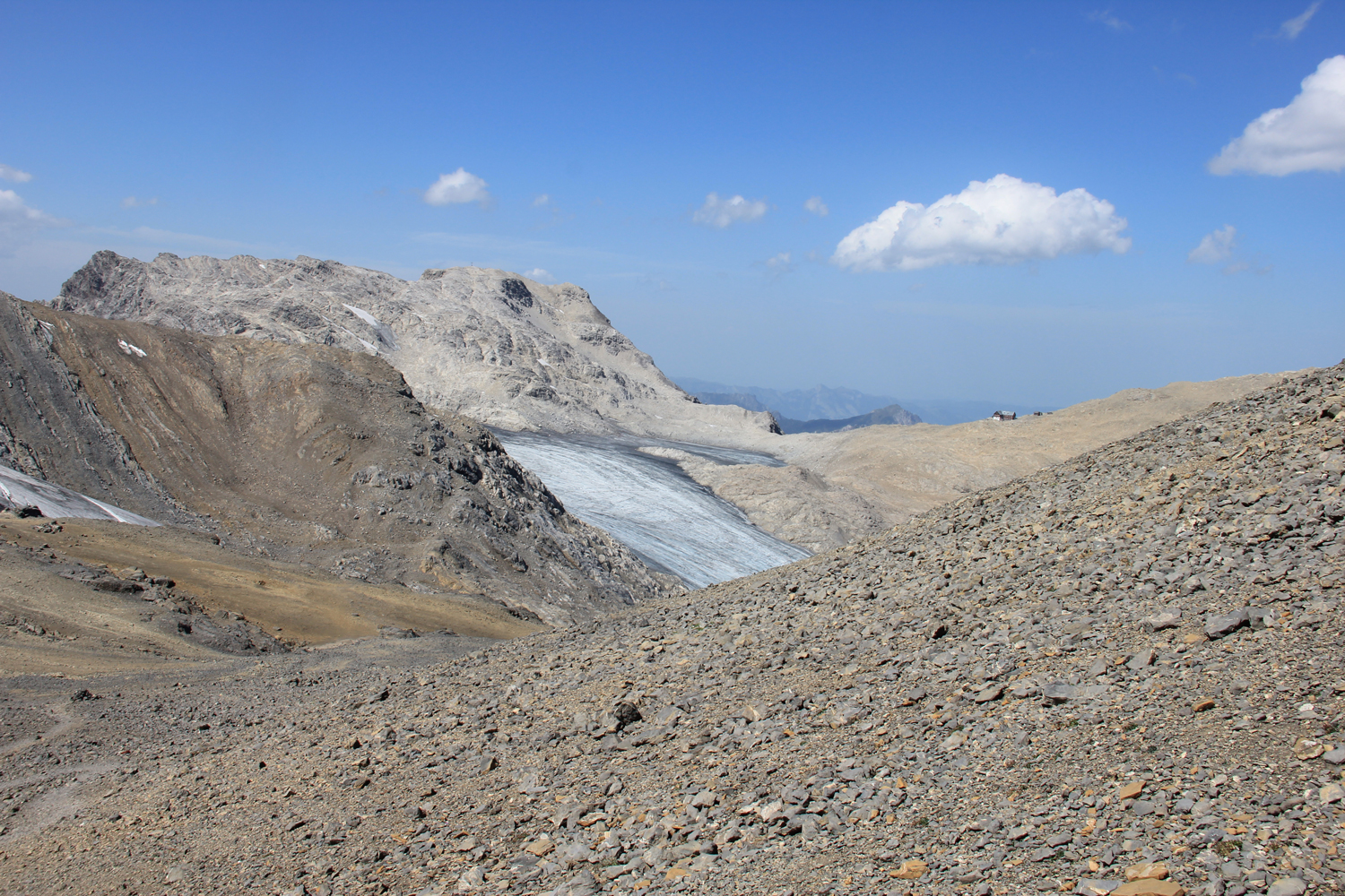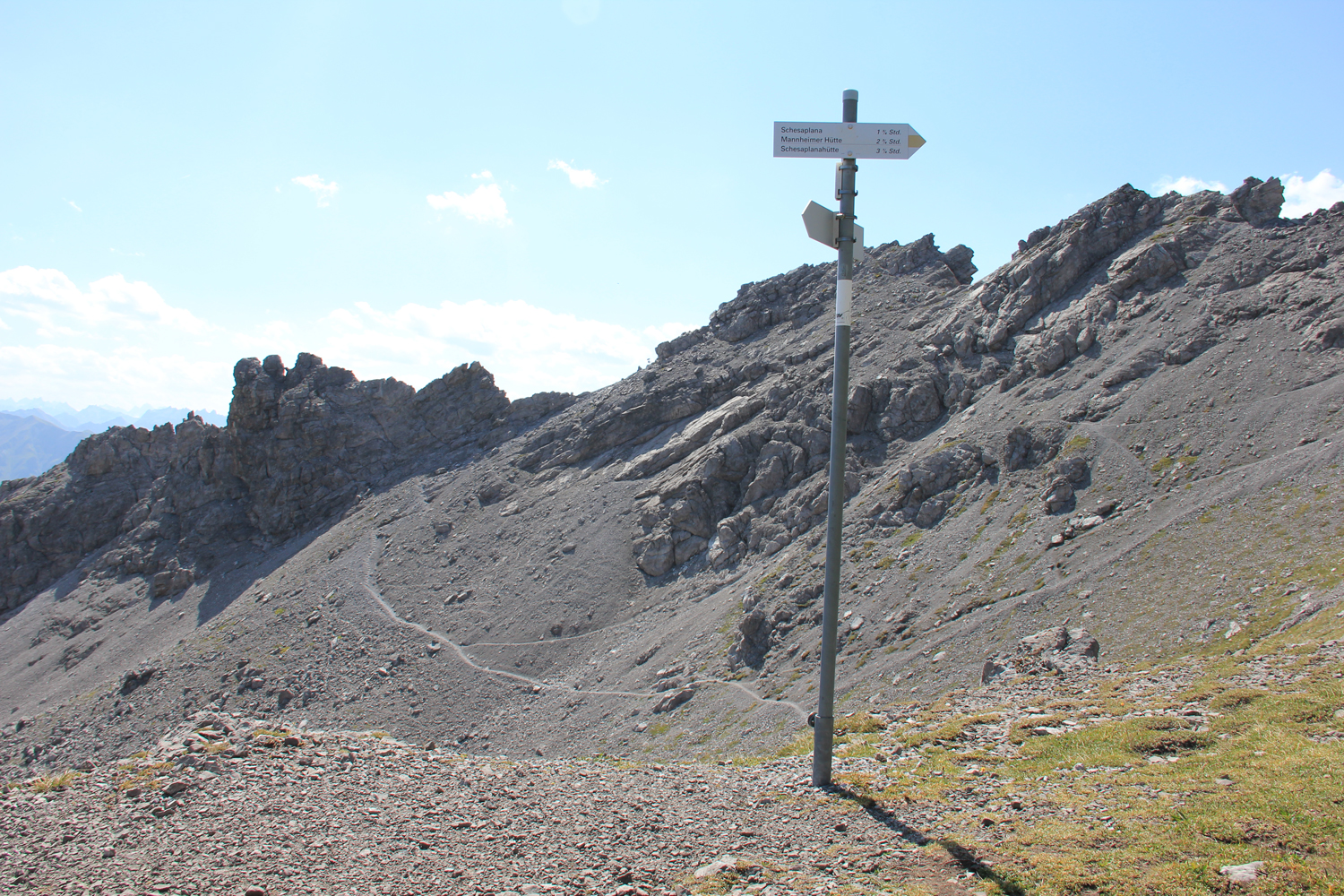 Über sanfte Geröllhänge steige ich nach Westen ab. Rechts unterhalb befindet sich der Brandner Gletscher; gegenüber ist die Mannheimer Hütte zu sehen. Ab dem Moment, in dem ich nach links in die Südflanke abbiege, ist vom Sturm praktisch nichts mehr zu spüren. Der interessante Steig führt in einer langen Querung abwärts, wobei auf jeden Fall gute Trittsicherheit und ein wenig Kletterfertigkeit nötig sind. Später geht es in südlicher Richtung weiter; an einzelnen Stellen sind Drahtseile angebracht. Der einfache, wenn auch ziemlich steile Schlussabstieg bringt mich über grasige Hänge zum Tagesziel, der Schesaplanahütte.