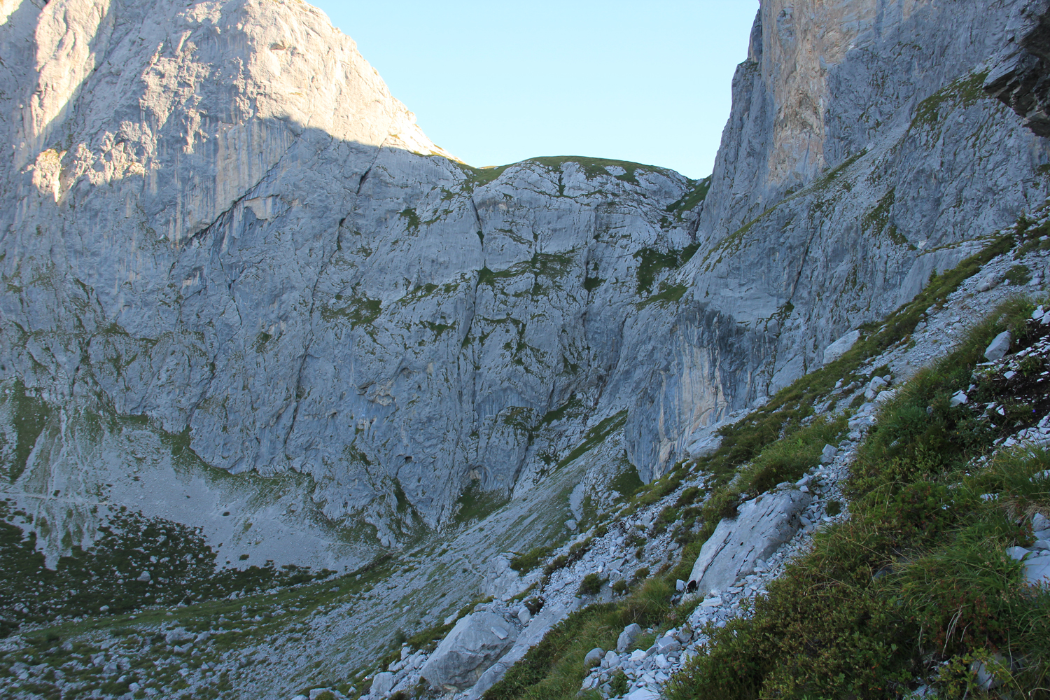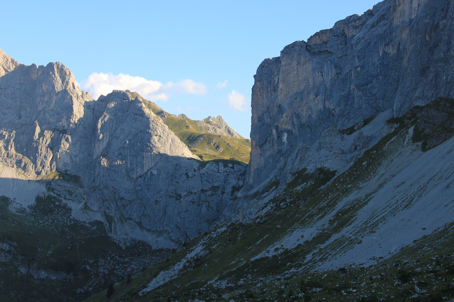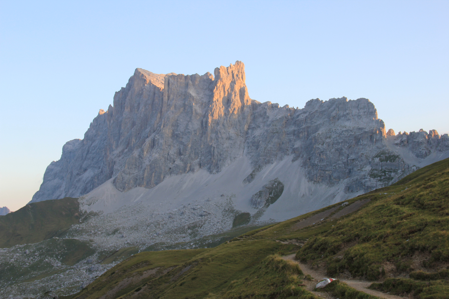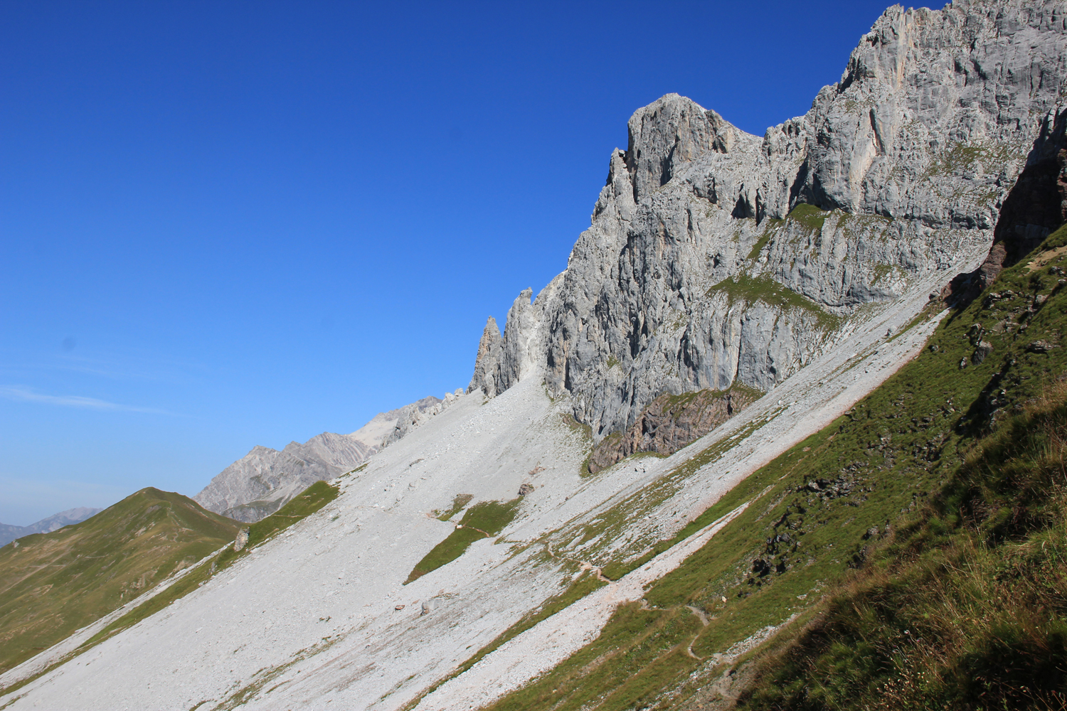 Über sanfte Geröllhänge steige ich nach Westen ab. Rechts unterhalb befindet sich der Brandner Gletscher; gegenüber ist die Mannheimer Hütte zu sehen. Ab dem Moment, in dem ich nach links in die Südflanke abbiege, ist vom Sturm praktisch nichts mehr zu spüren. Der interessante Steig führt in einer langen Querung abwärts, wobei auf jeden Fall gute Trittsicherheit und ein wenig Kletterfertigkeit nötig sind. Später geht es in südlicher Richtung weiter; an einzelnen Stellen sind Drahtseile angebracht. Der einfache, wenn auch ziemlich steile Schlussabstieg bringt mich über grasige Hänge zum Tagesziel, der Schesaplanahütte.