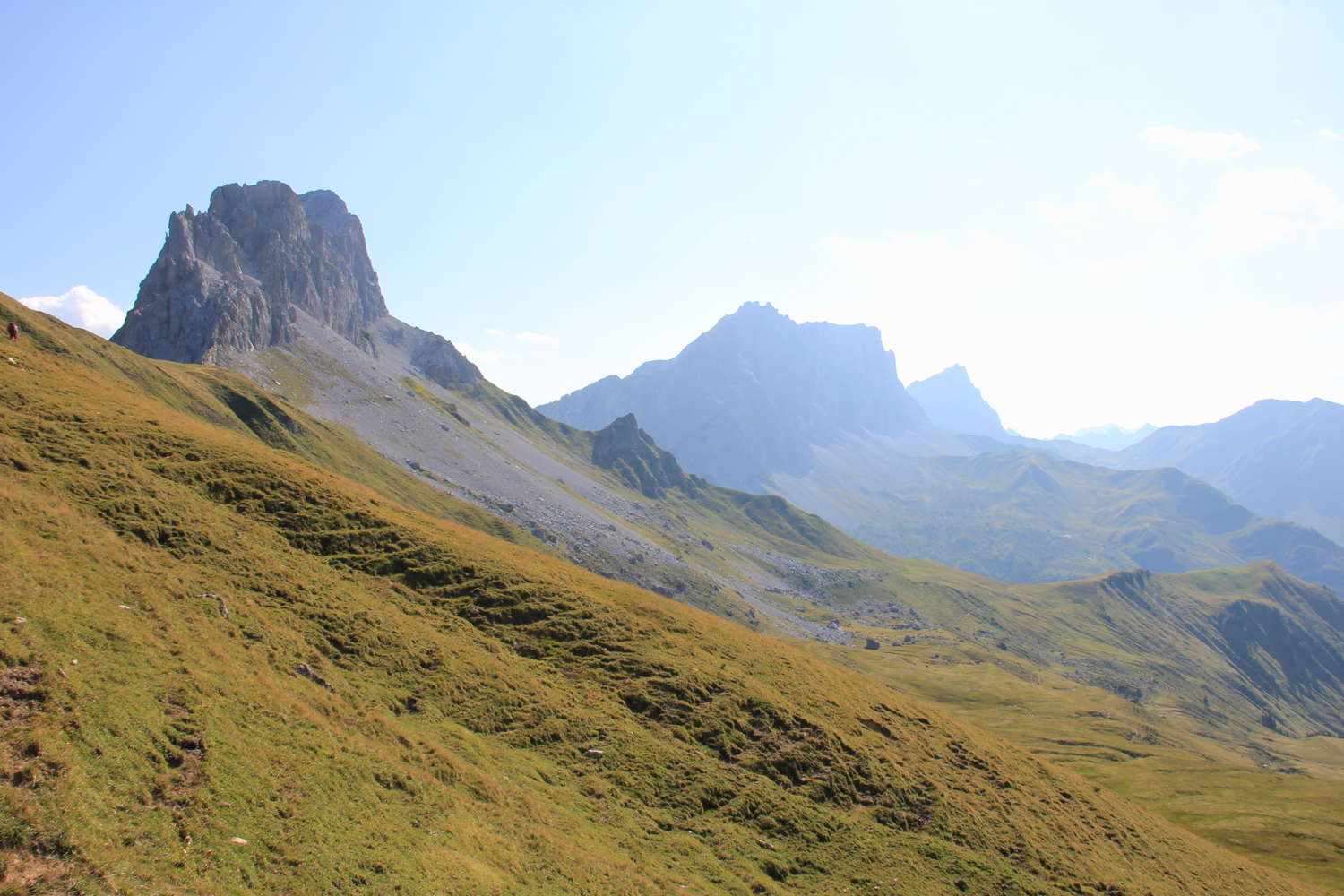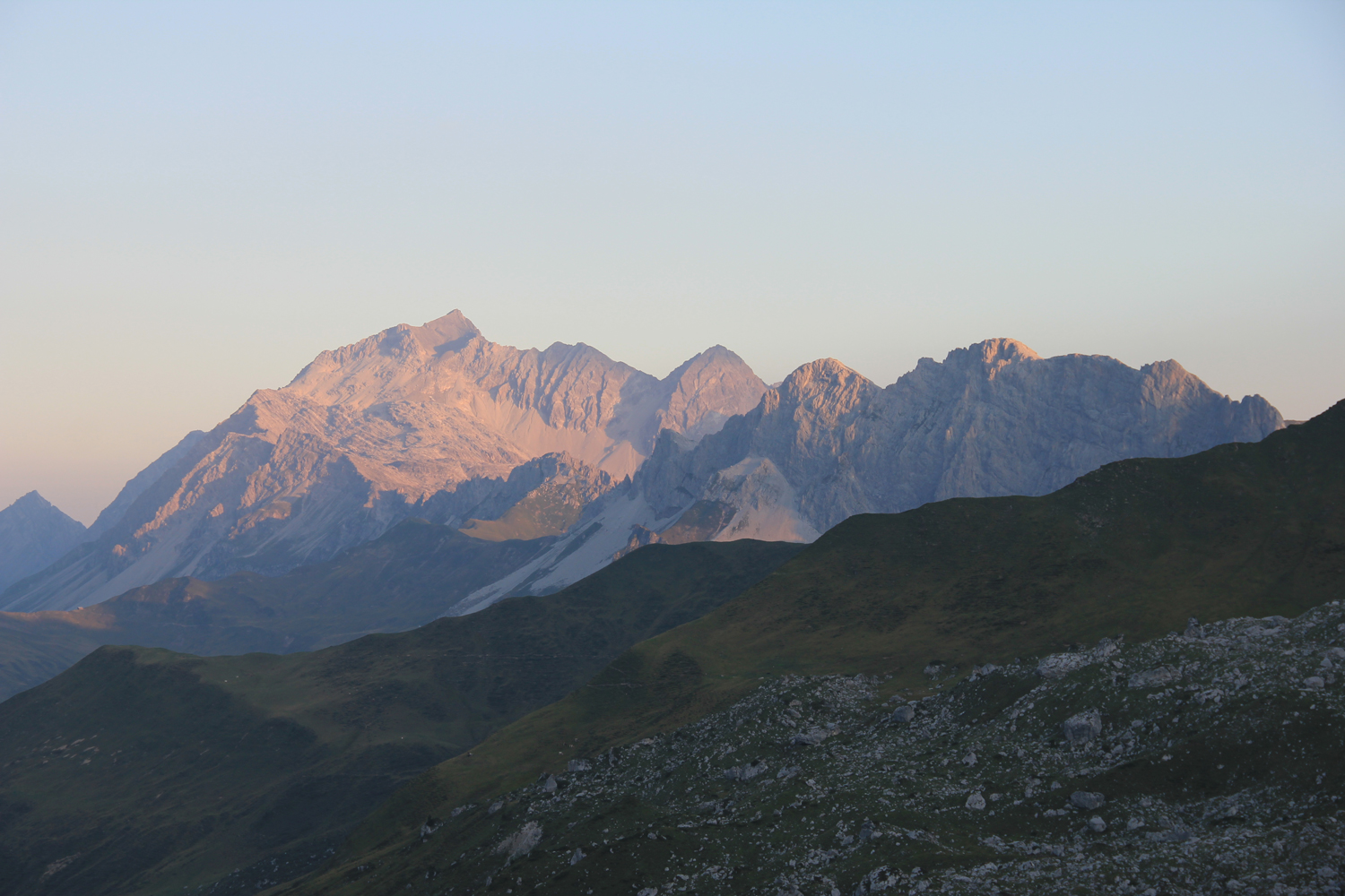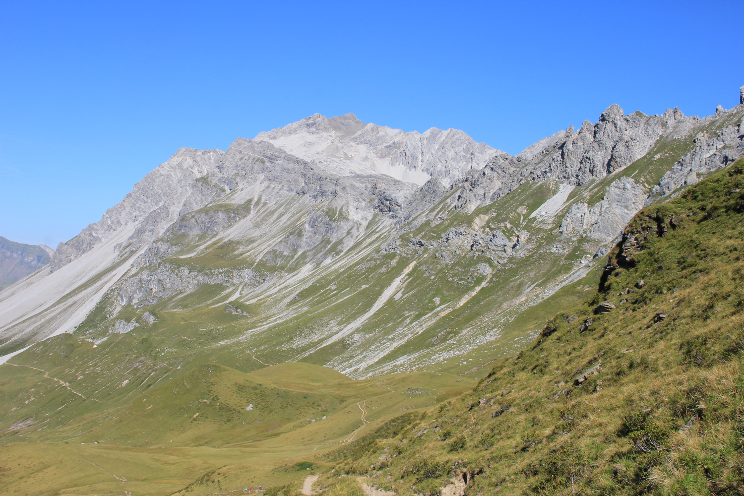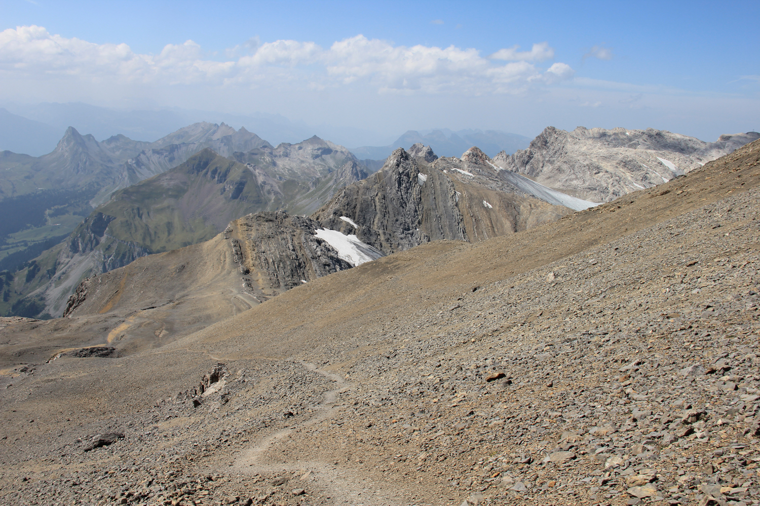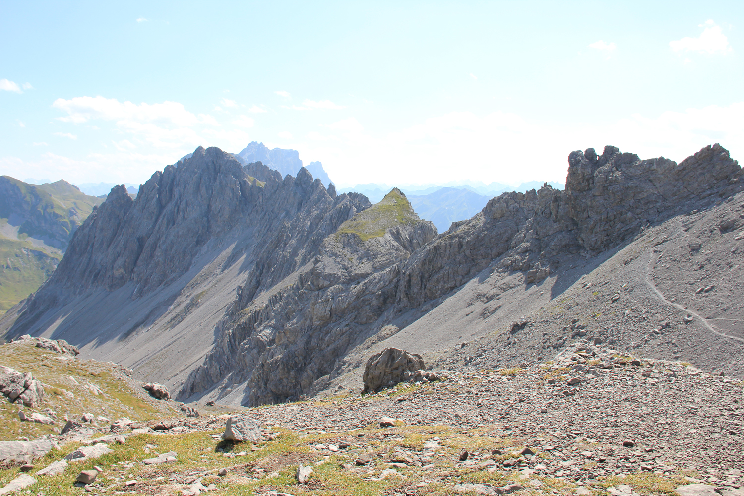 Eine umfassende Aussicht ist zu bewundern: Im Norden das Bregenzerwaldgebirge, im Nordosten die Allgäuer Alpen, davor das auffällige Felshorn der Zimba, weiter rechts die Zugspitze und die Lechtaler Alpen mit der Parseierspitze, rechts davon der Hohe Riffler im Verwall, in östlicher Richtung die Ötztaler Alpen, insbesondere die Kaunergrat-Gipfel sowie rechts davon Wildspitze und Weißkugel, anschließend die Silvretta vom mehrgipfligen Fluchthorn bis zum Piz Linard, dahinter (im Südosten) der Ortler, im Süden Bernina- und Bergellgruppe, rechts davon die Oberhalbsteiner Alpen mit Piz Platta und Surettahorn, noch weiter rechts Ringelspitz und Tödi, dann Uri-Rotstock und Glärnisch, Churfirsten und Säntis/Altmann. Nur einen winzigen Teil der Gipfel kann ich identifizieren.